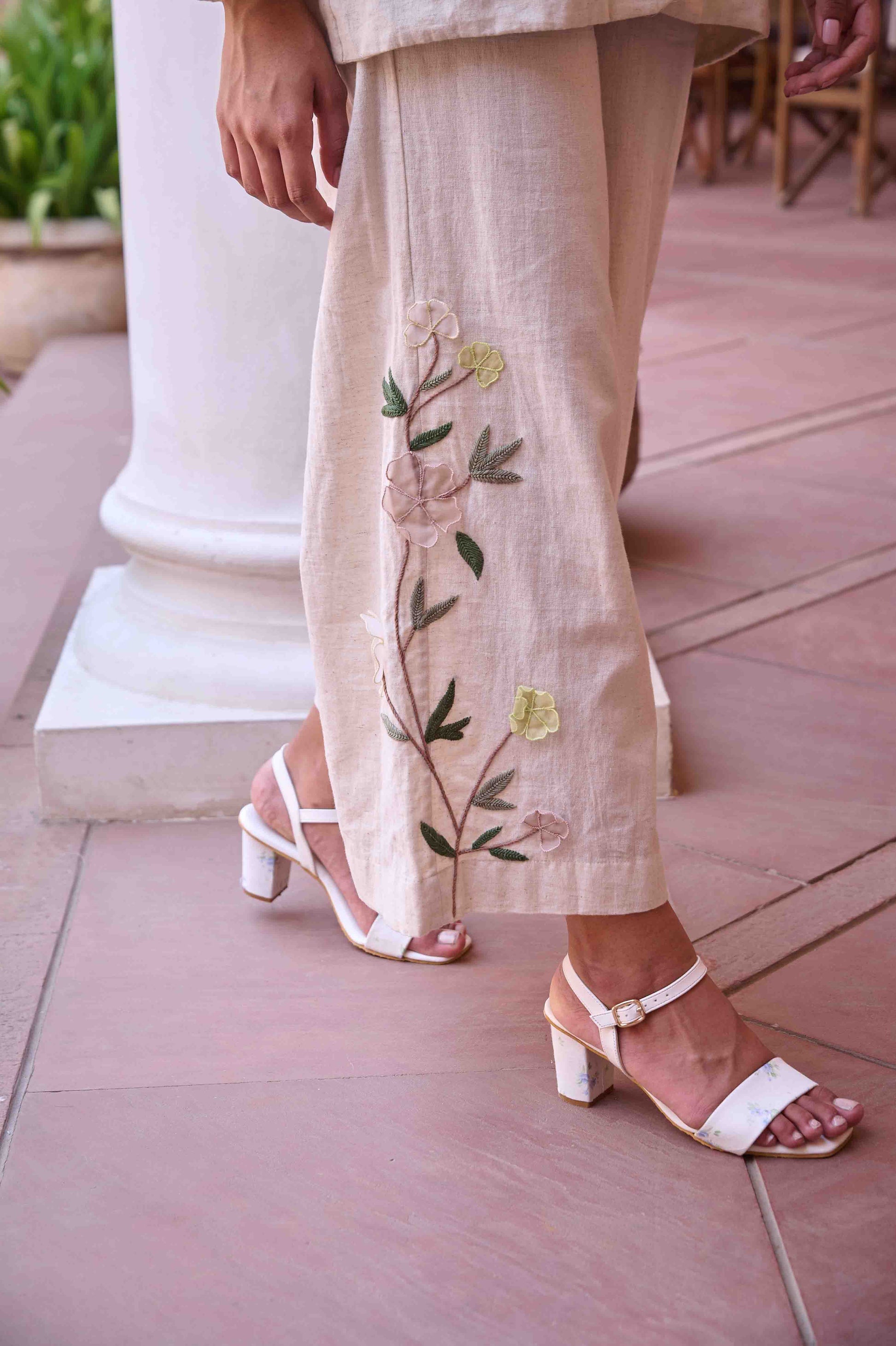 Introducing our Structured Jacket and Pant Set, a blend of sophistication and modern elegance that commands attention. The jacket features exquisite organza applique flower details, creating a whimsical and luxurious touch that enhances its structured silhouette. The pants complement the ensemble with a minimal combination of applique flowers and delicate embroidery, adding subtle texture and charm. Together, they form a cohesive look that exudes effortless style and refined craftsmanship.