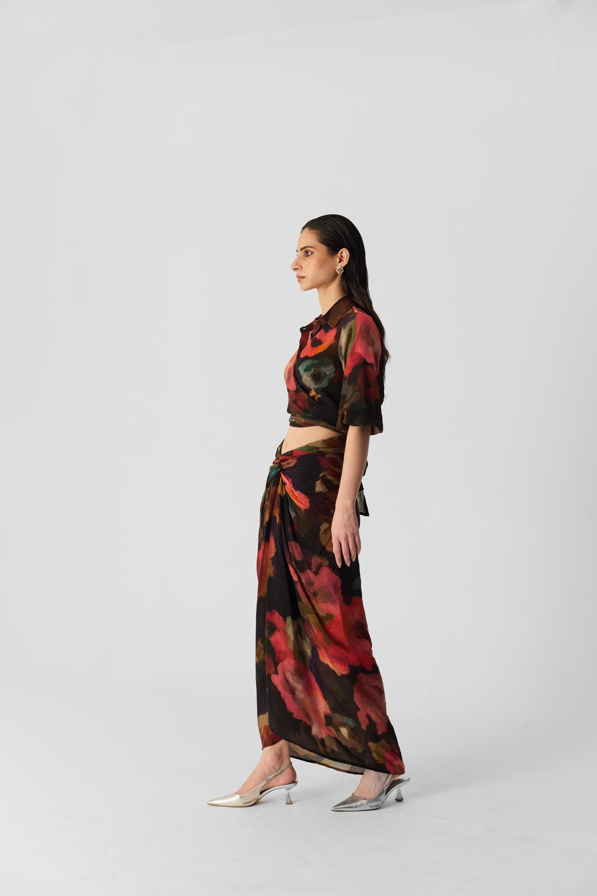 This stunning set is crafted from crepe fabric featuring a vibrant Furong print. It includes a front-knotted skirt with a center zipper and hook for the perfect fit, paired with a sophisticated top that boasts a classic collar and elegant sleeves. The wrap detail adds versatility, allowing it to be beautifully tied at the back or front, offering a variety of styling options. This ensemble is perfect for making a statement on any occasion.