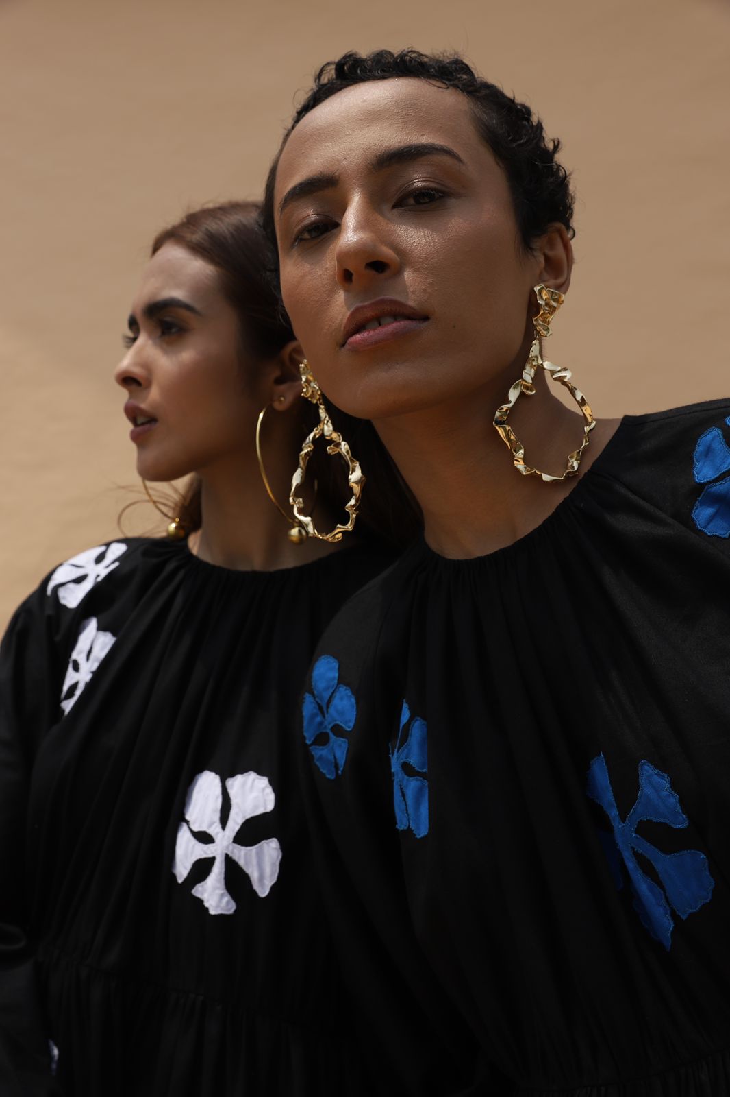 Gathered and tiered, full sleeve midi length dress with floral applique details and a neck opening at the back. The fit is relaxed and comfortable with lots of room for movement.