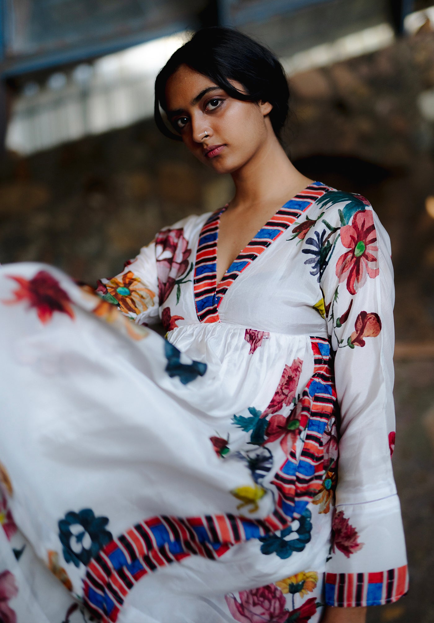 The Garden of paradise set in pure silk features handpainted florals arranged tastefully in bouquets all throughout a stark white background with a multicolor striped on the neckline and side seam. It is finished with delicate beading on the neck and the sleeves. The pants are completely printed in the multi color stripe print.
