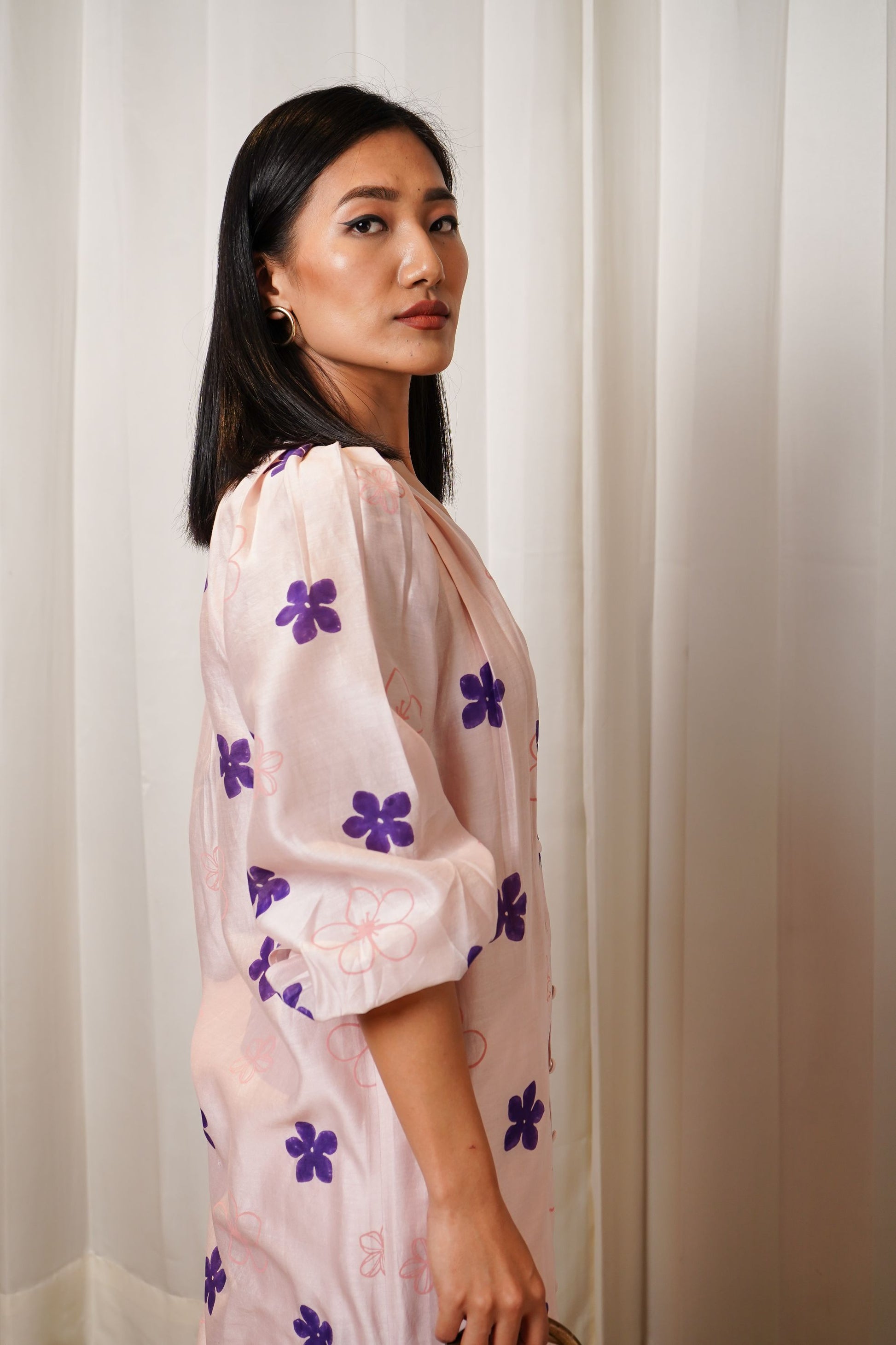 Printed Chanderi tunic featuring shoulder pleates and raglan sleeves + crepe slip