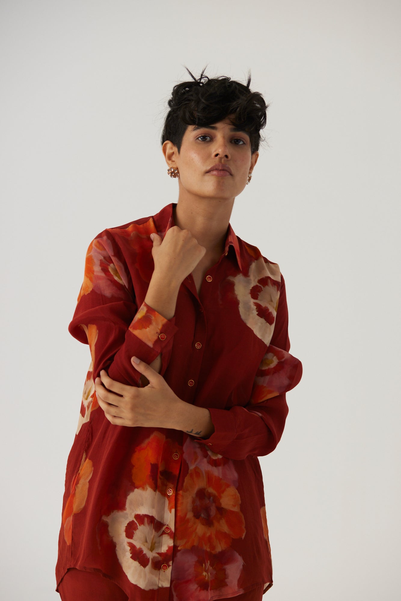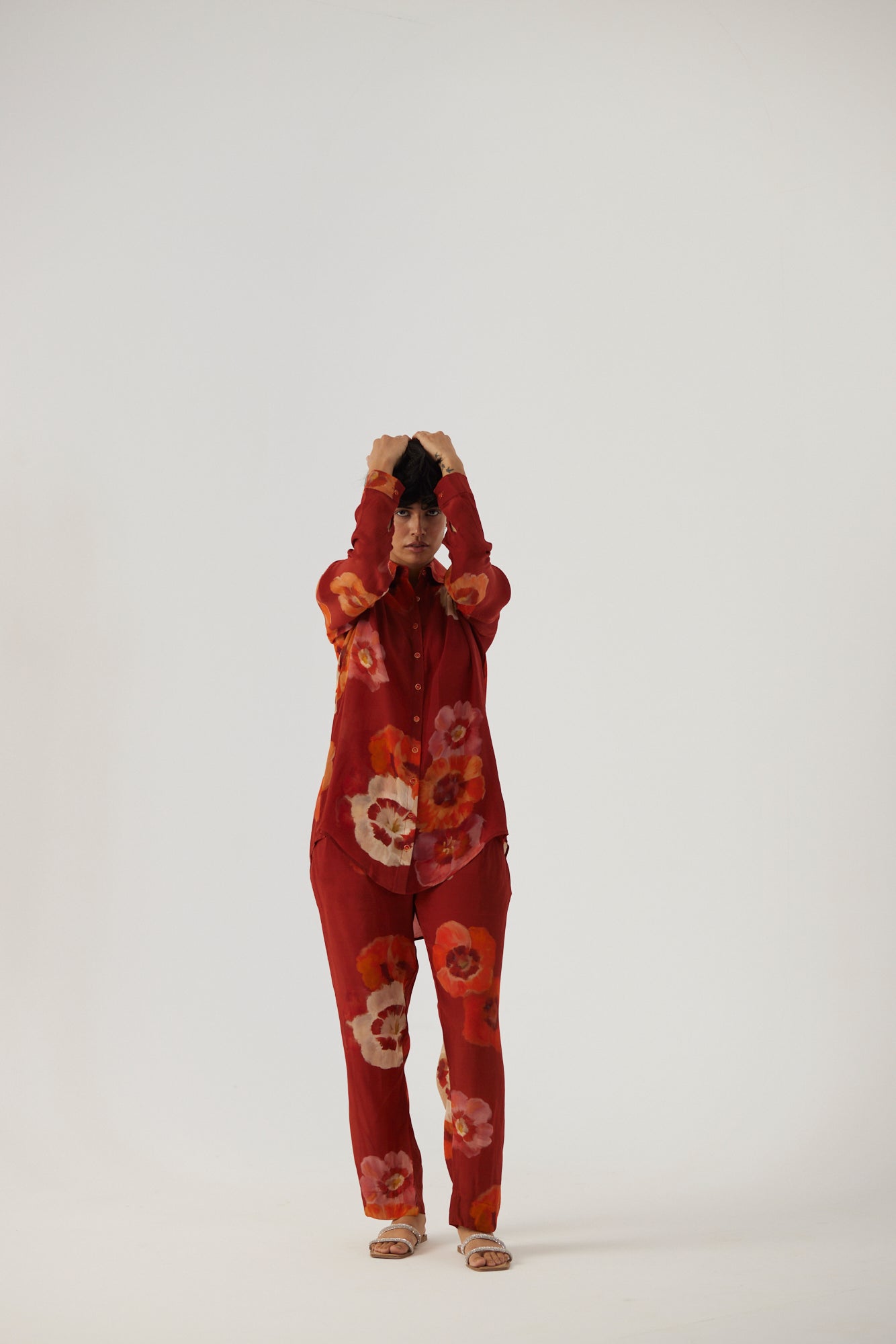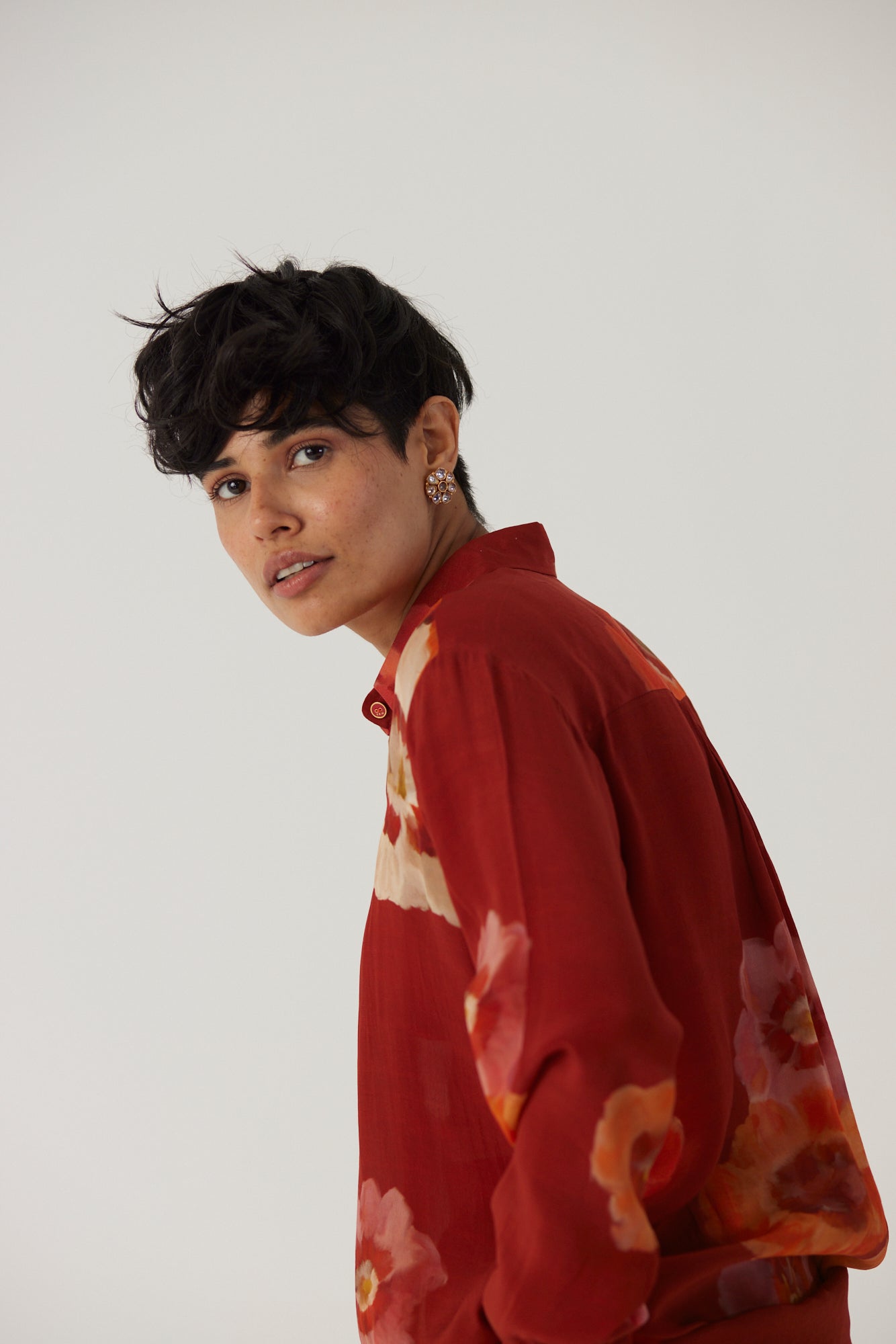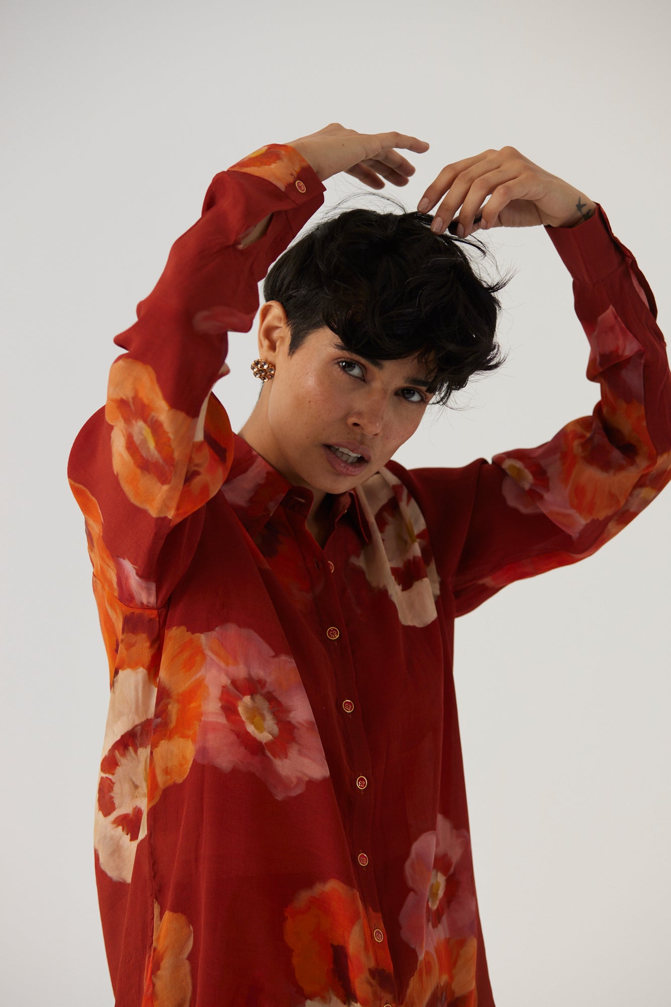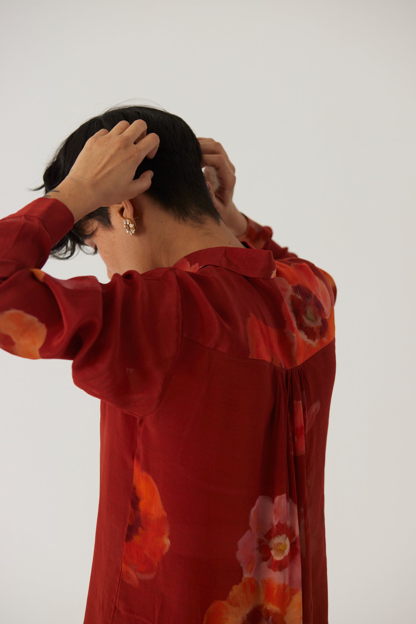 This print of the dress is crafted in blood red colour with shades of massive poppies carefully printed on crepe. This dress is designed as a midi length dress with some gathers and a button at the back end of the neckline with a puff sleeve.