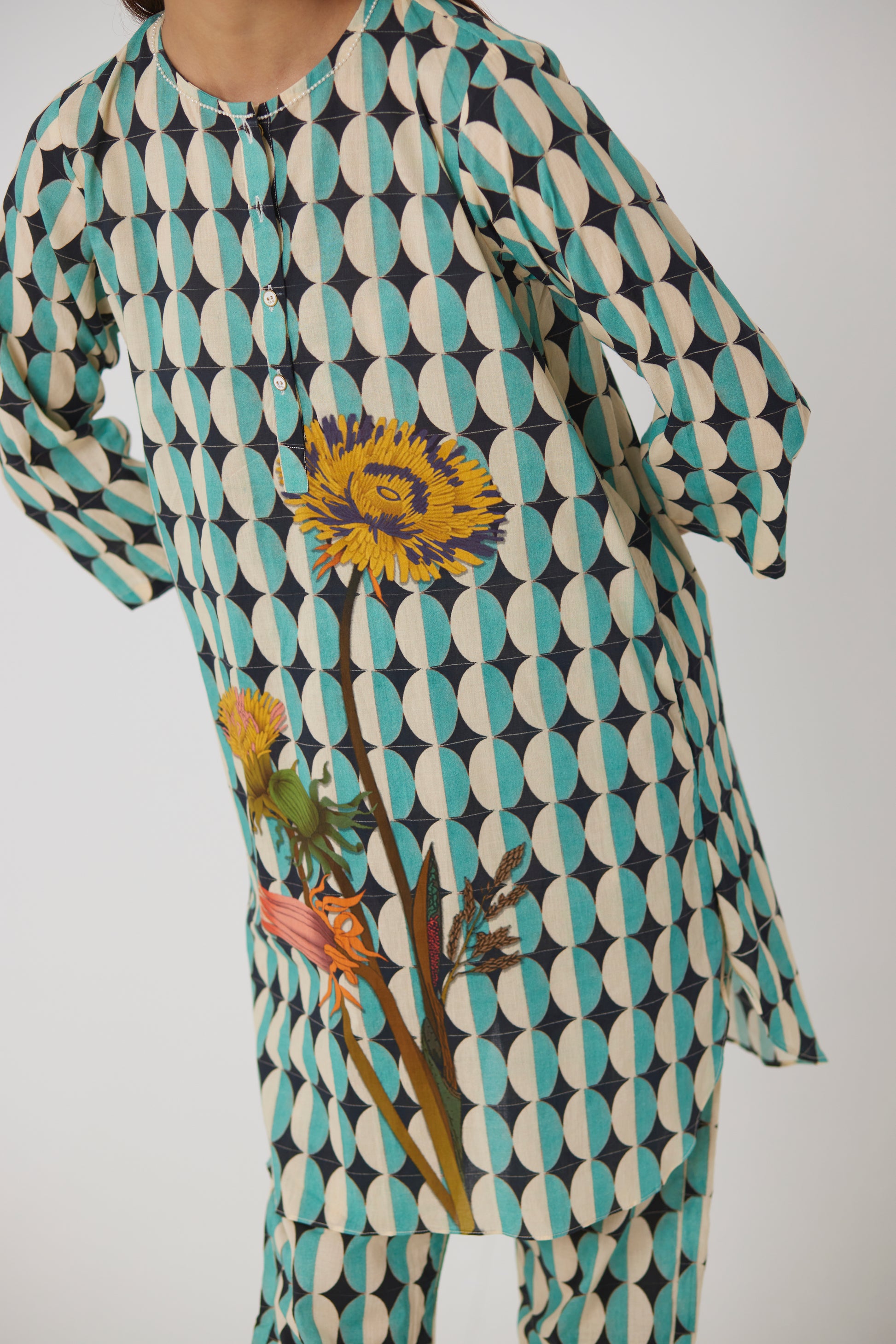 Experience the allure of Japanese craftsmanship with our Gifu-inspired tile print. Hand-drawn sunflowers grace this cotton kurta and pants set, fusing Eastern elegance with comfort