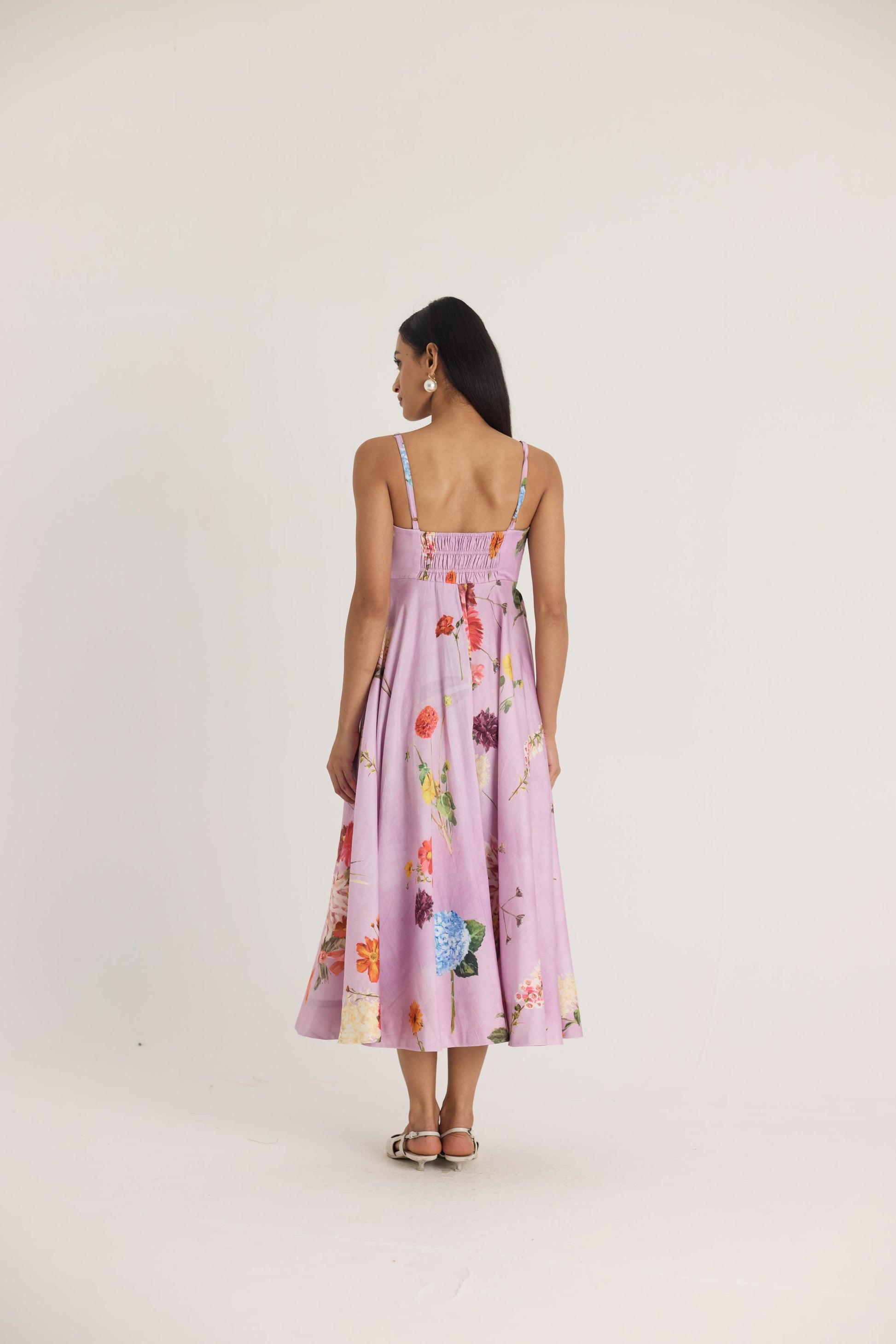 A dreamy lilac midi dress featuring a vibrant floral print inspired by spring blossoms. The fitted bustier bodice enhances the silhouette, while the flared skirt adds graceful movement.