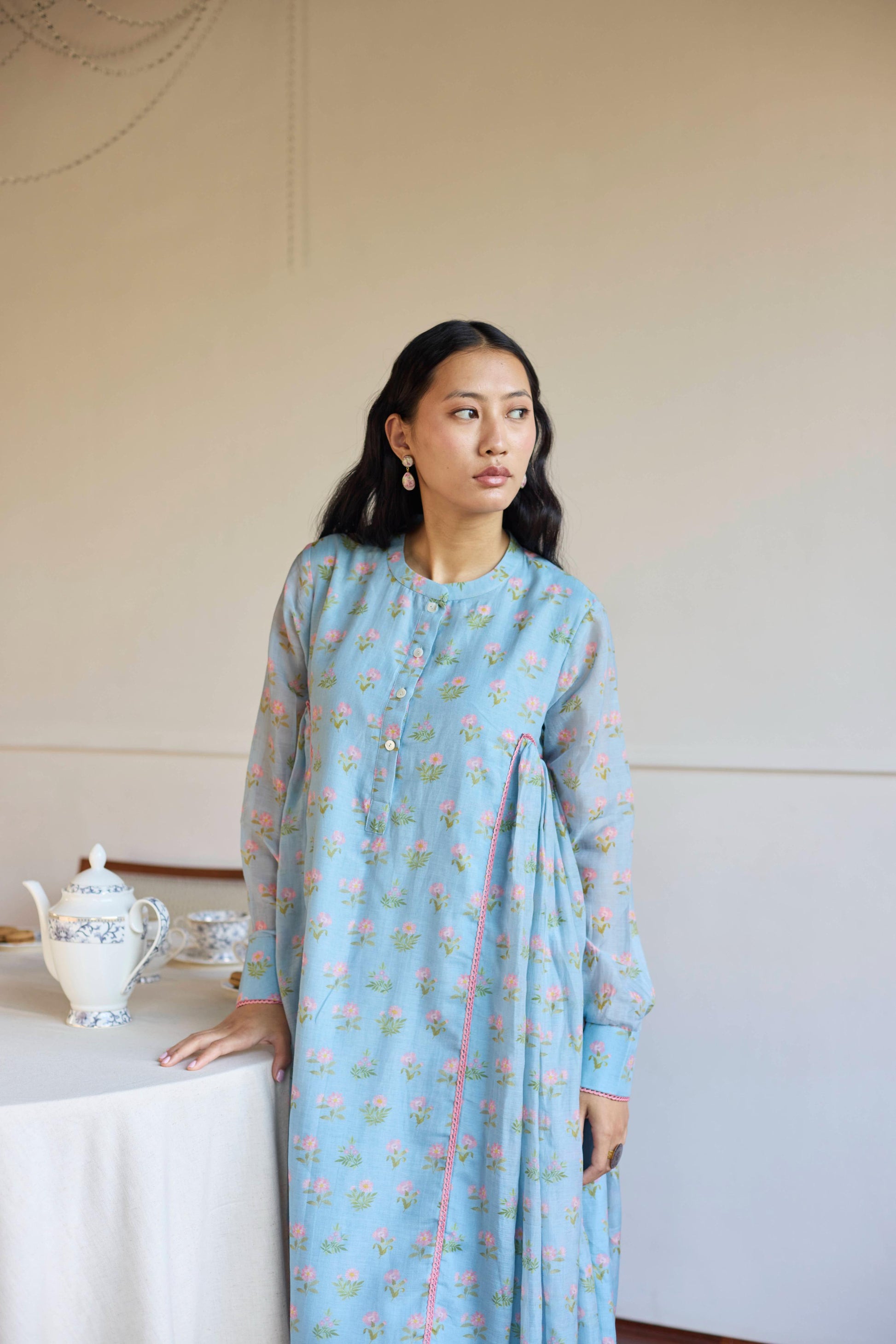 Presenting Our Handwoven Chanderi Relaxed-fit Dress, Adorned With Pink Florette Blooms, Soft And Divine, Side Gathers Flow With A Gentle Grace, A Silhouette That Sways, Serene And Fine. A Delicate Placket Graces The Neck, Whispering Elegance With Each Thread And Fold, Where Nature's Beauty In Every Stitch Is Held, A Timeless Creation, Graceful And Bold.