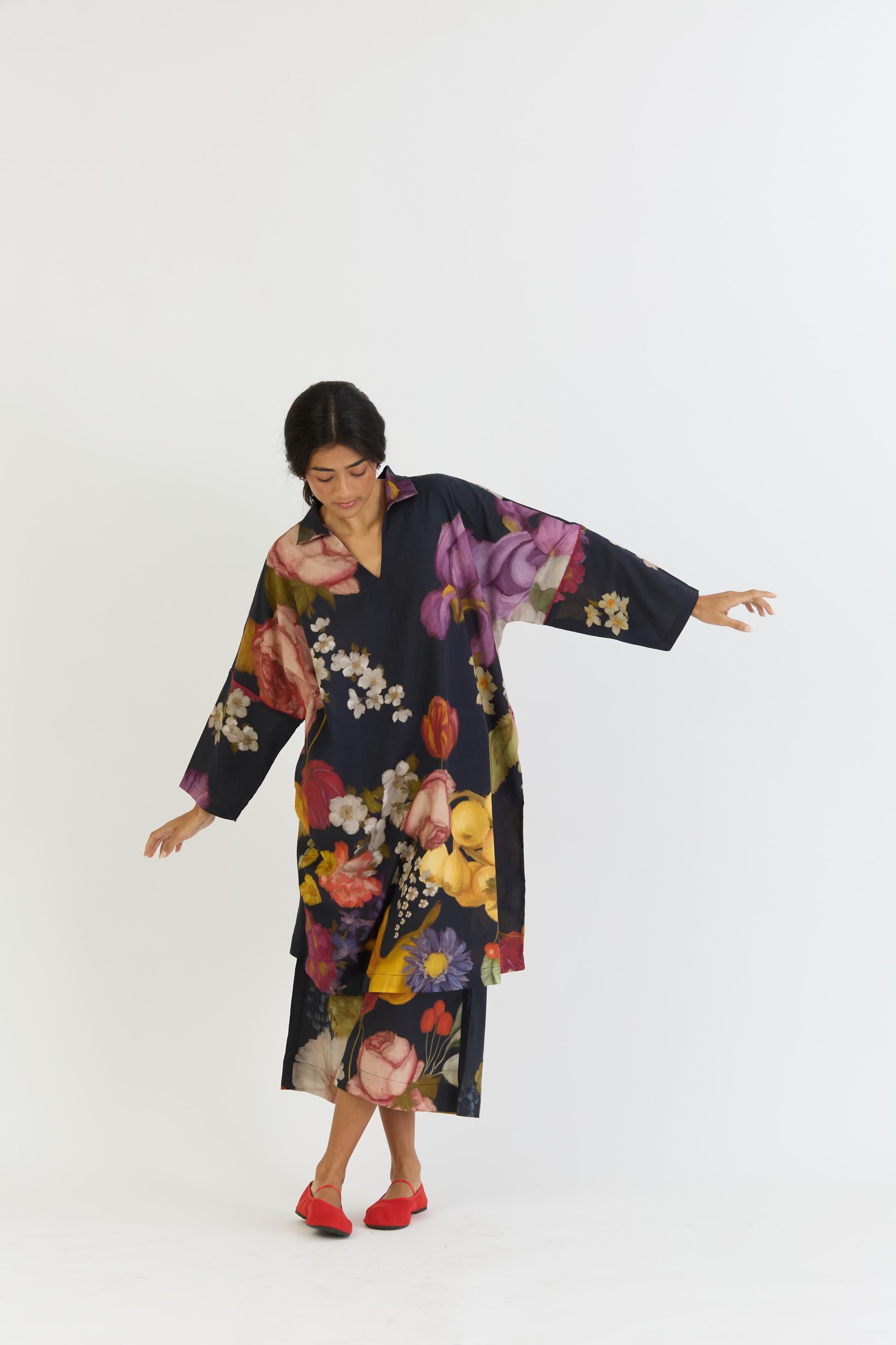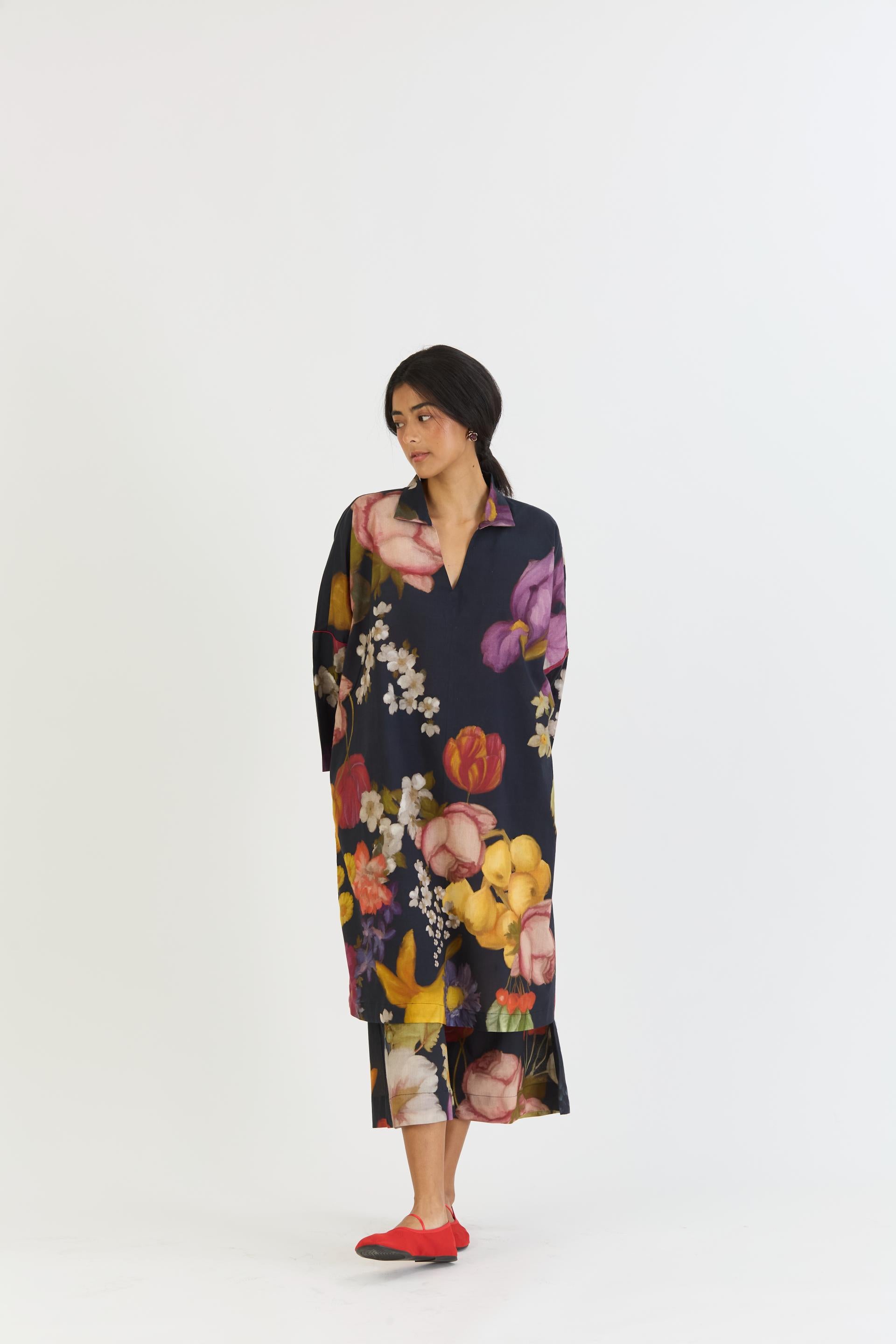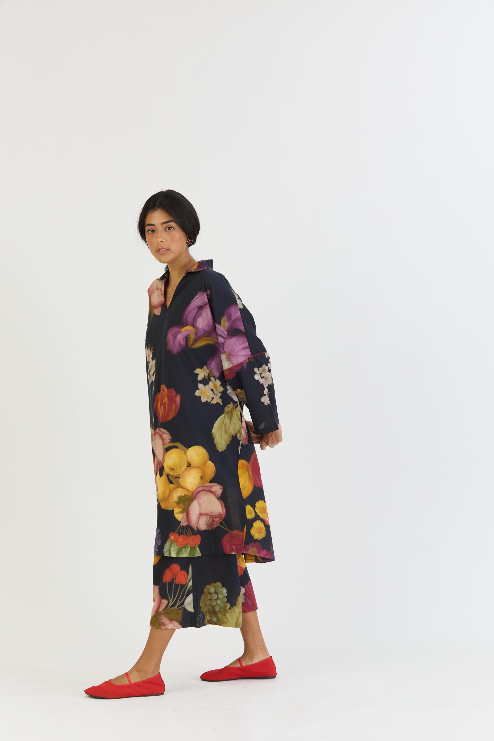The Kurta Set, crafted from premium cotton cambric fabric. This set features a chic V neckline complemented by a classic collar, and drop shoulder sleeves enhanced with elegant piping detailing in the middle.