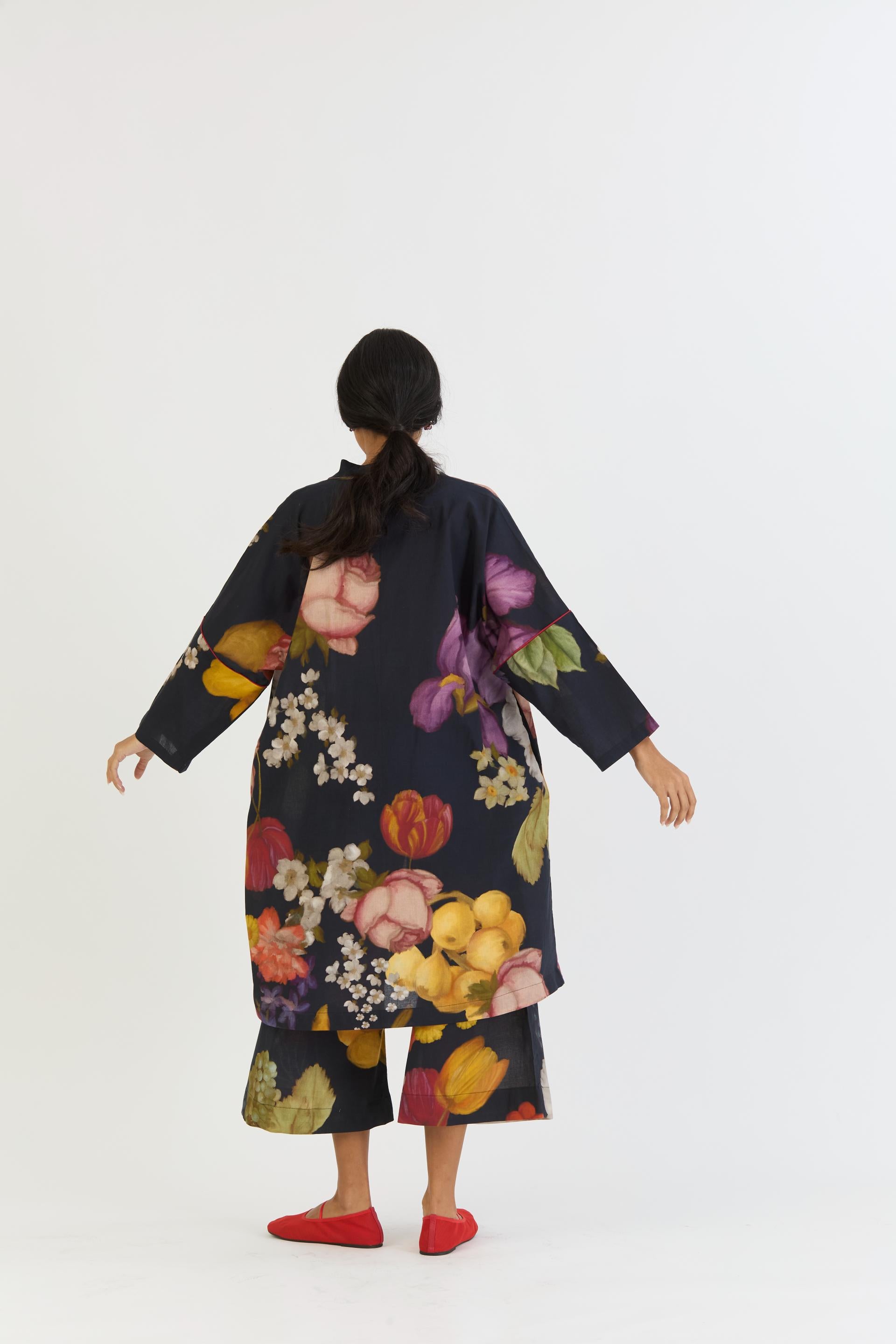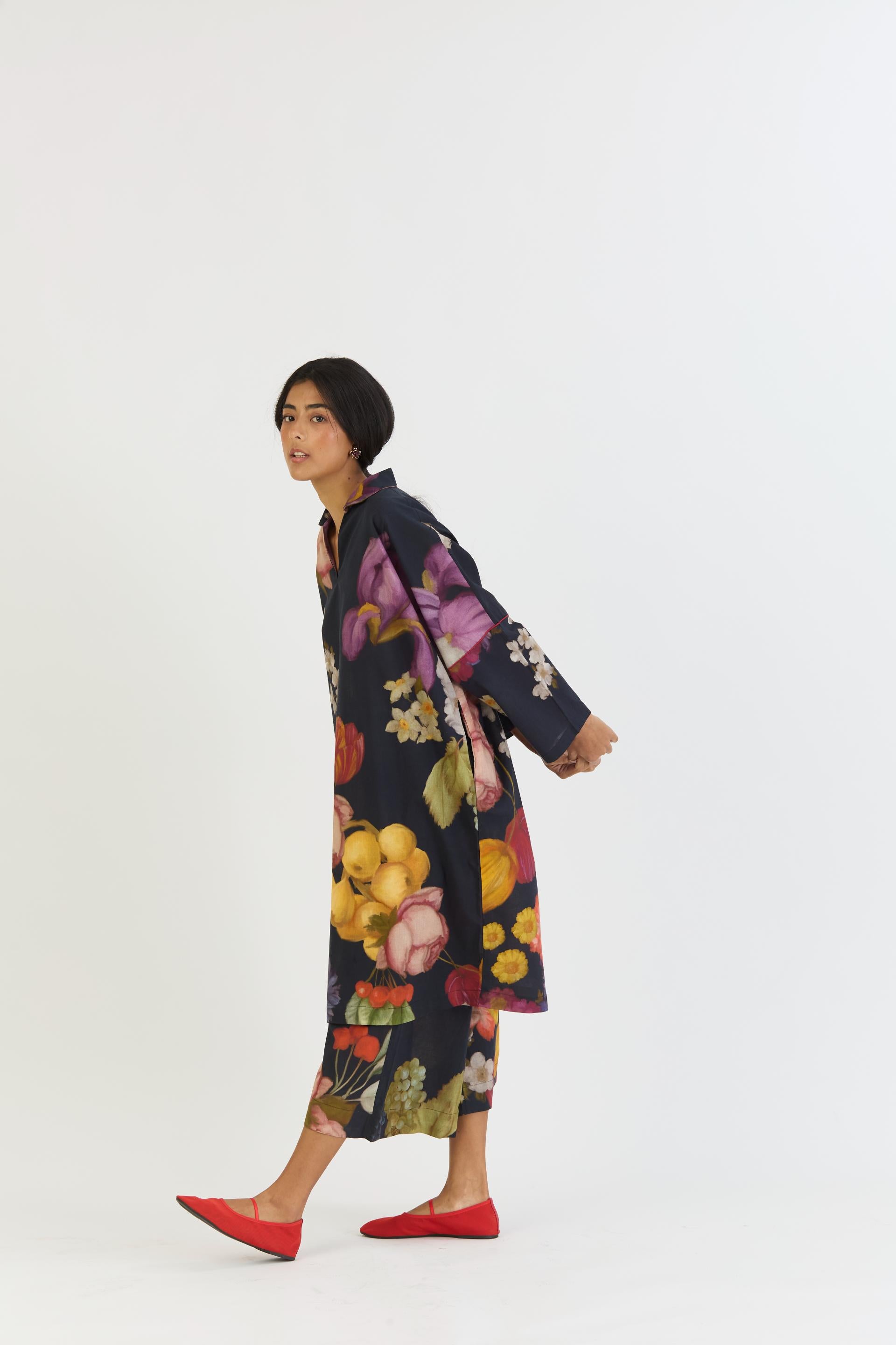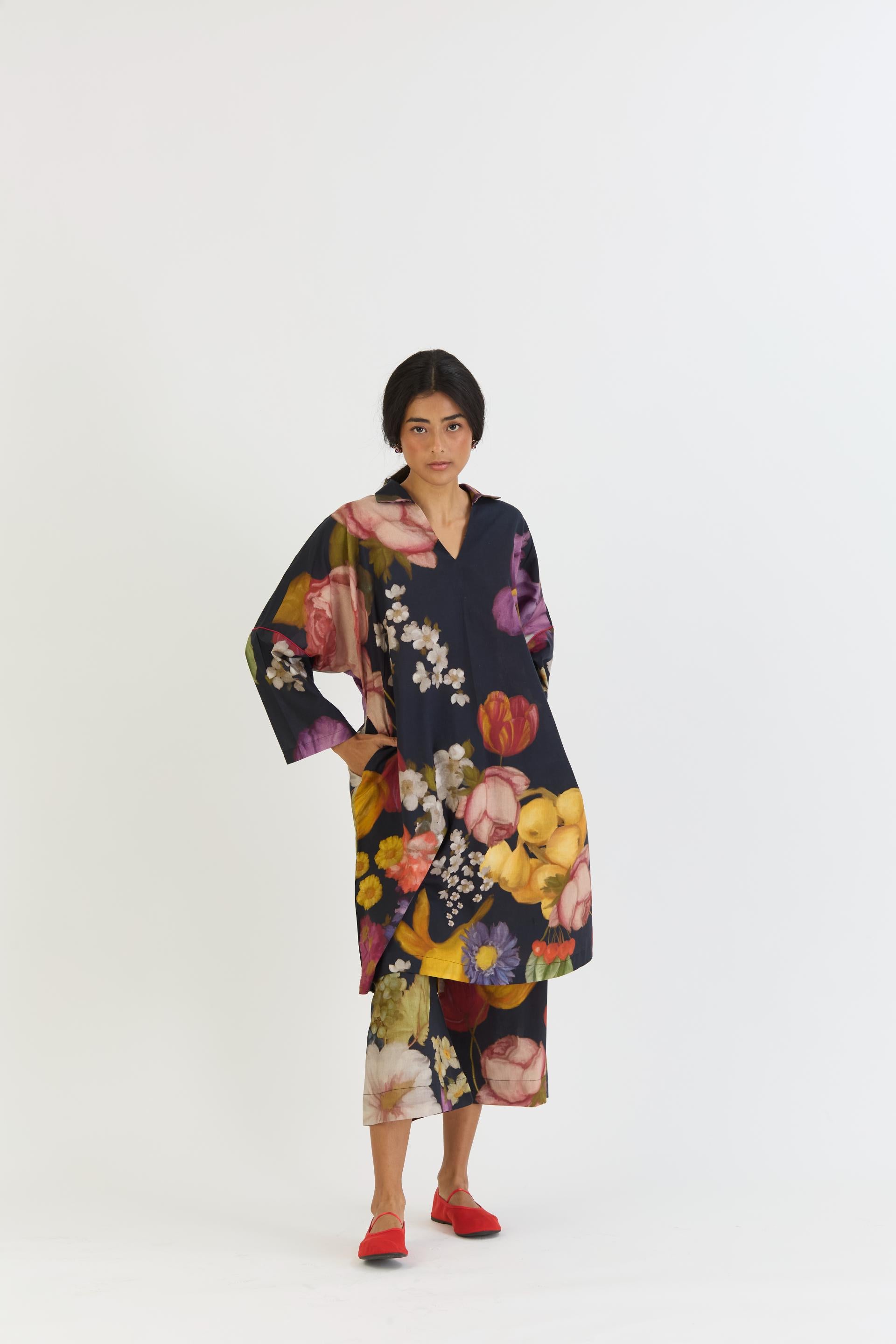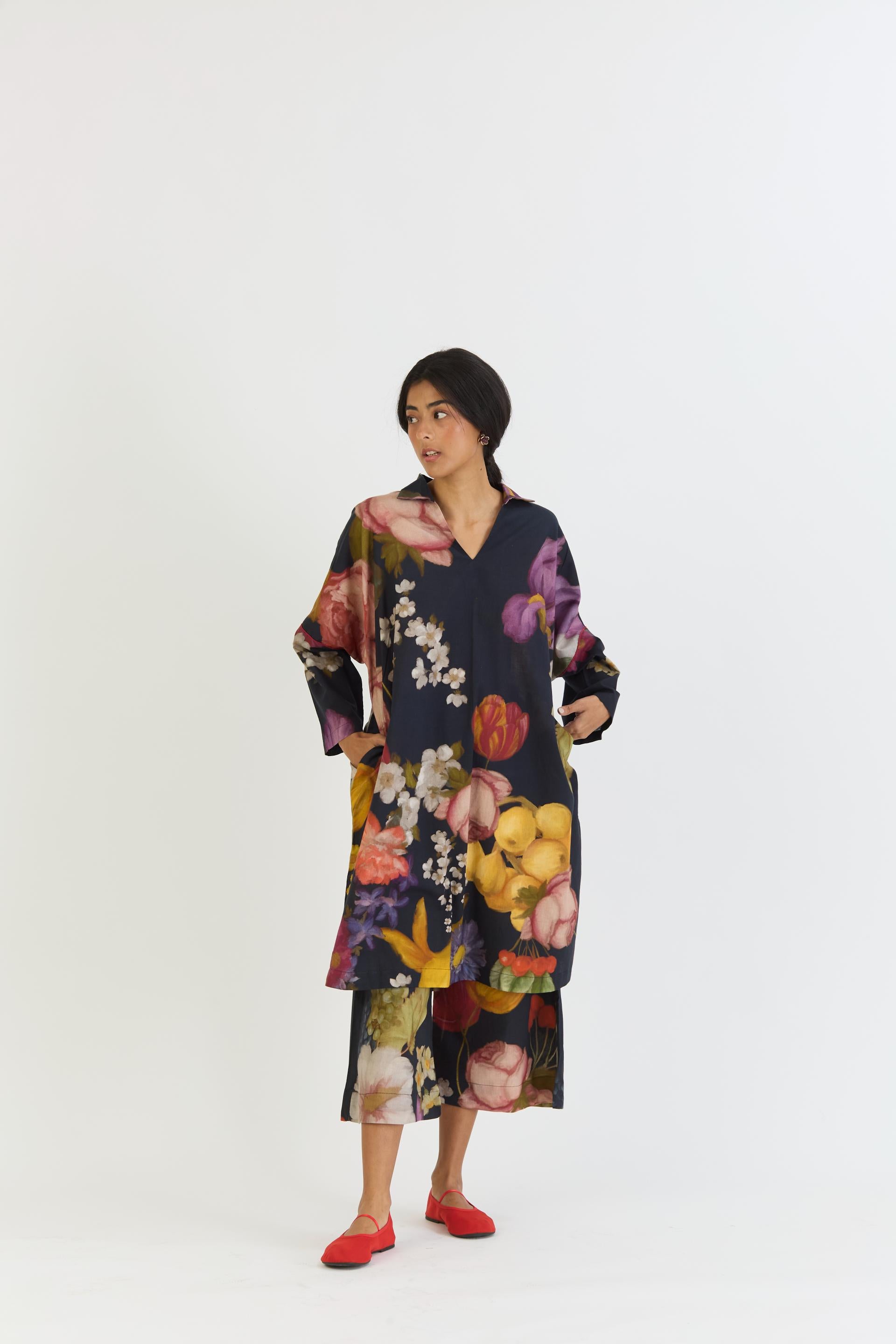 The Kurta Set, crafted from premium cotton cambric fabric. This set features a chic V neckline complemented by a classic collar, and drop shoulder sleeves enhanced with elegant piping detailing in the middle.