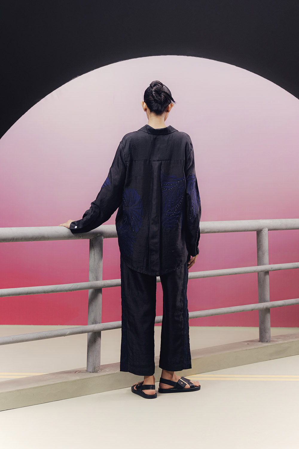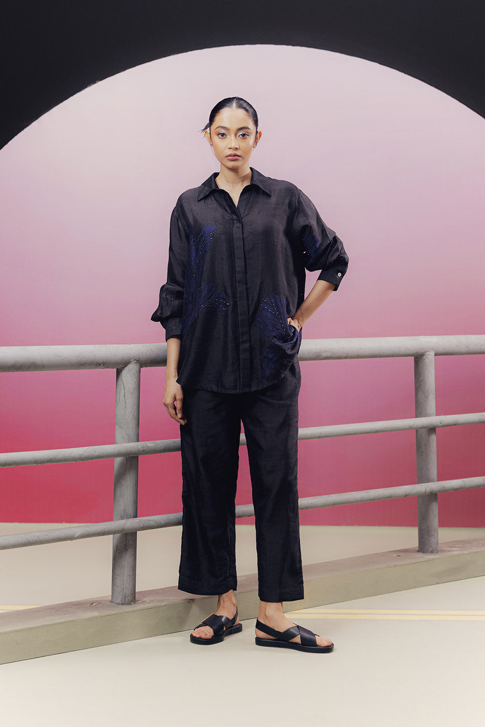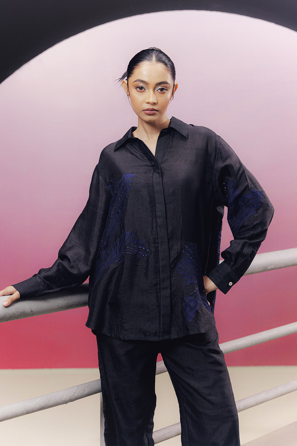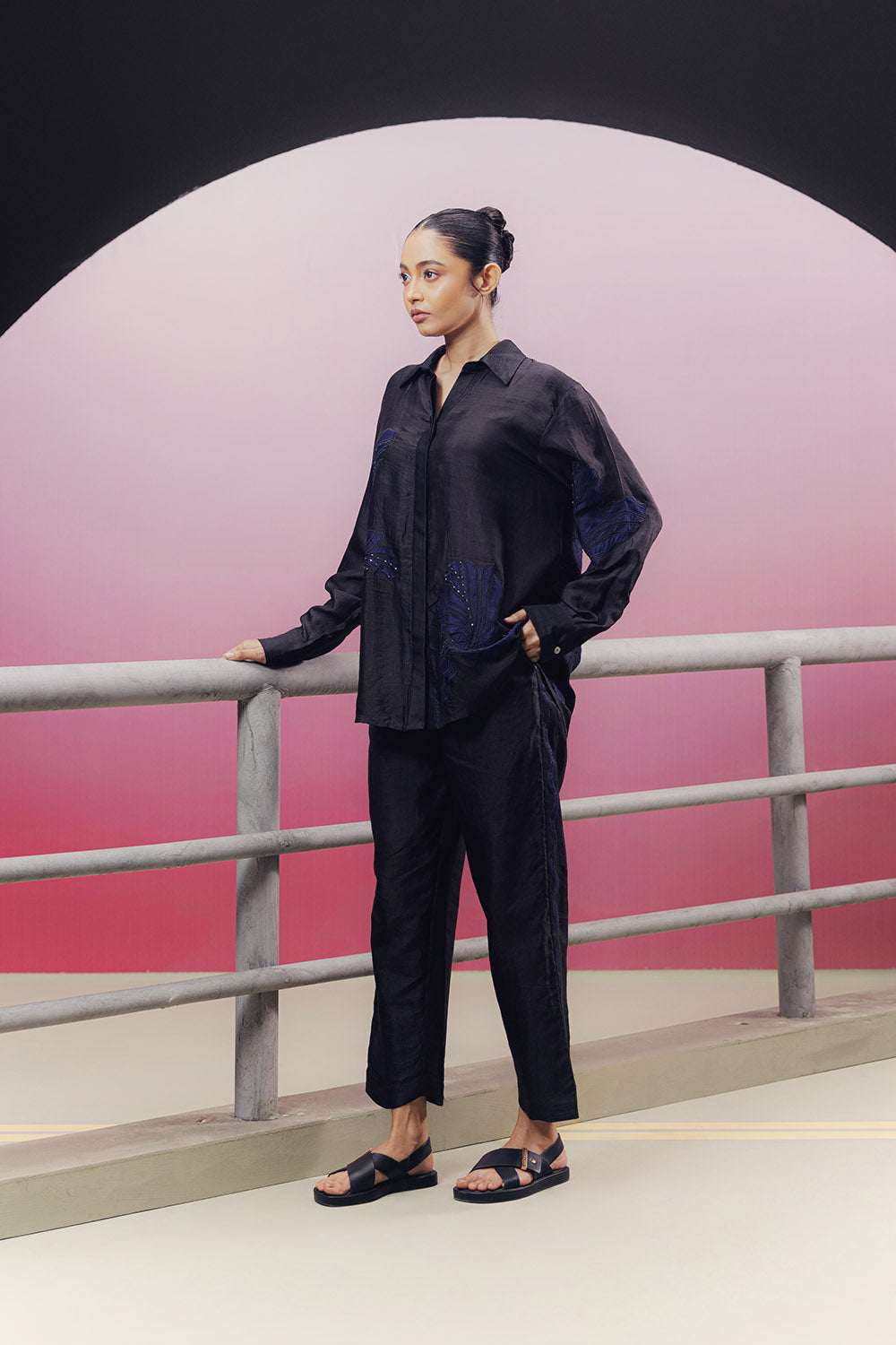 Handwoven silk coord set with applique on the shirt and pant borders. The applique is highlighted with bead work.