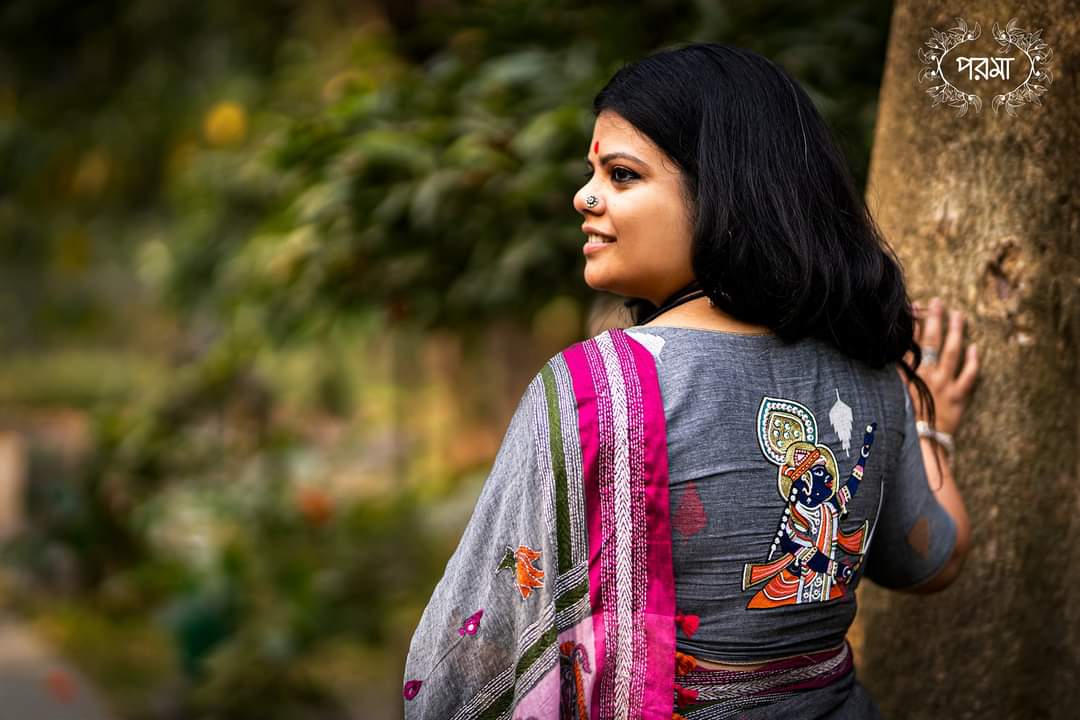 On handwoven grey Jamdani, Lord Krishna is hand embroidered.