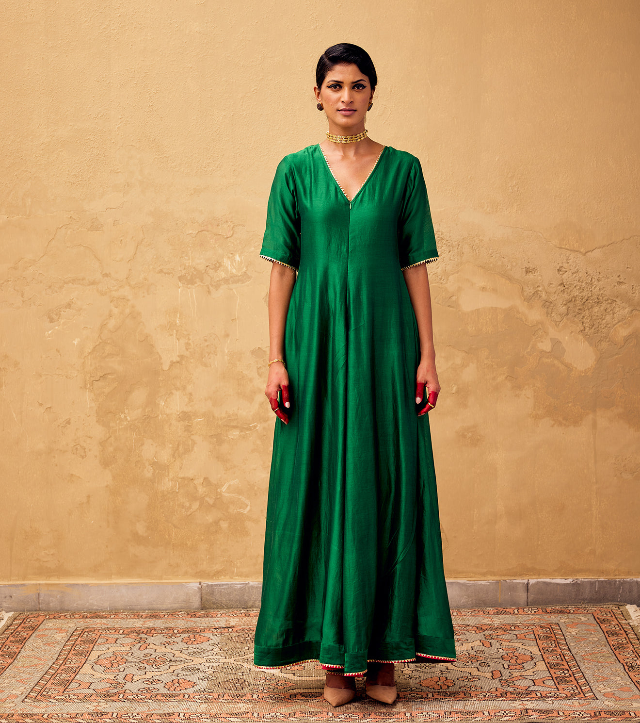 rich green jumpsuit with bijiya gota detailing in the neckline and hemline and sleeves, with front zipper opening, crafted in chanderi fabric.
