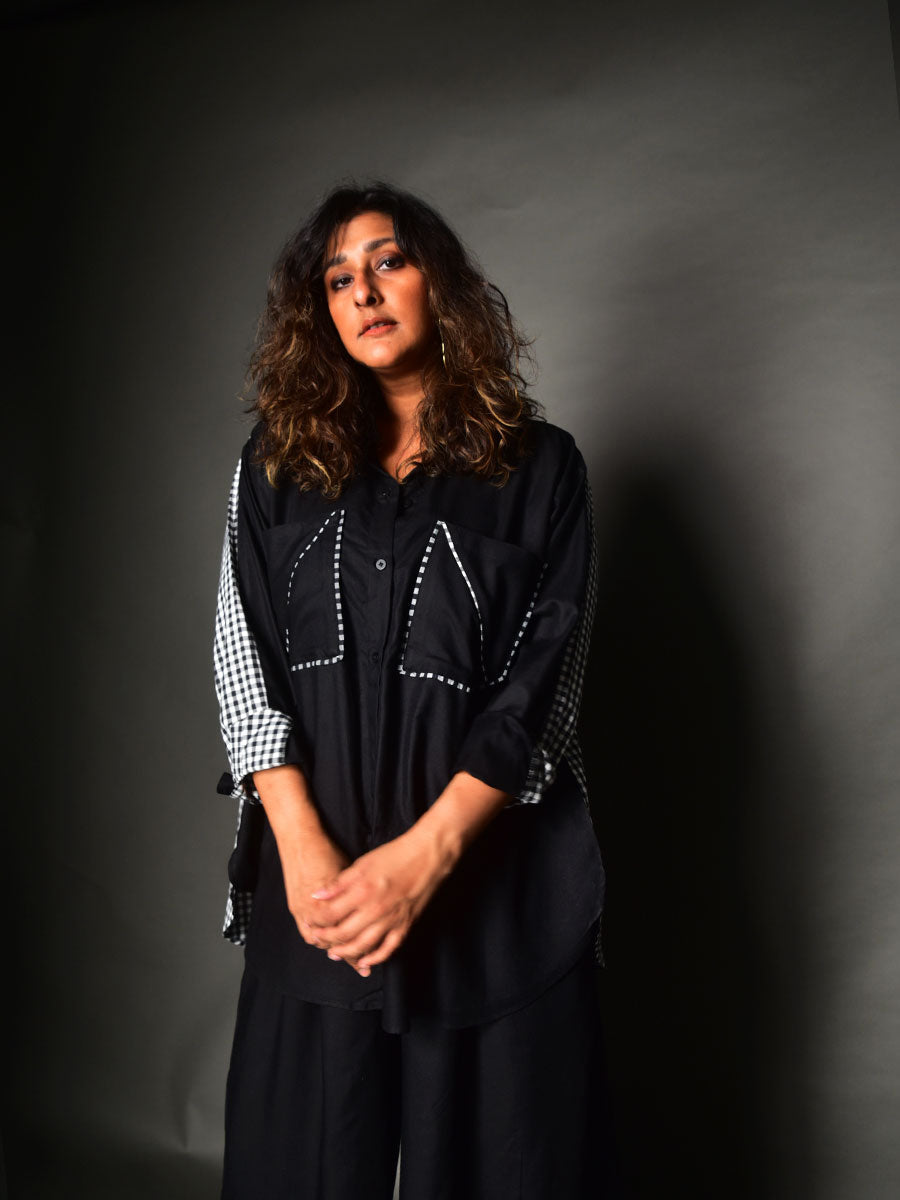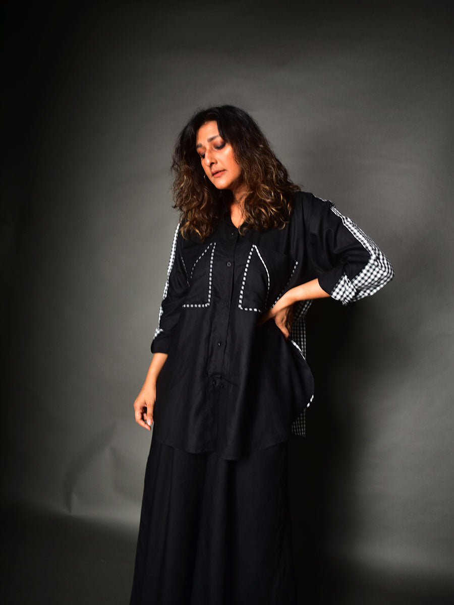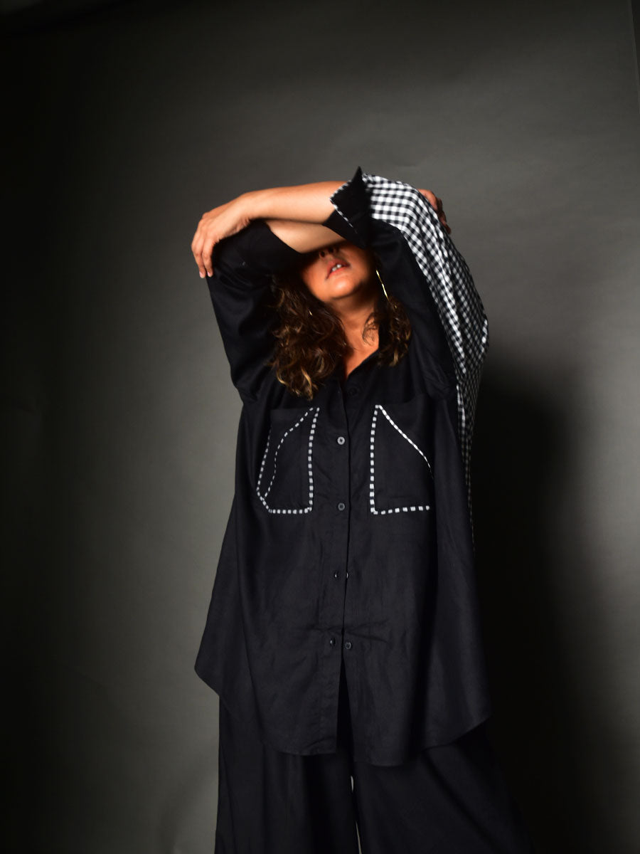 Chic and elegant with some fun while you are at it! Our oversized shirt is cut in a mix of black rayon cotton and contrast checkered print. Pair with our Juno Pants for the full lounge look, or layer over our Bree Bralette.