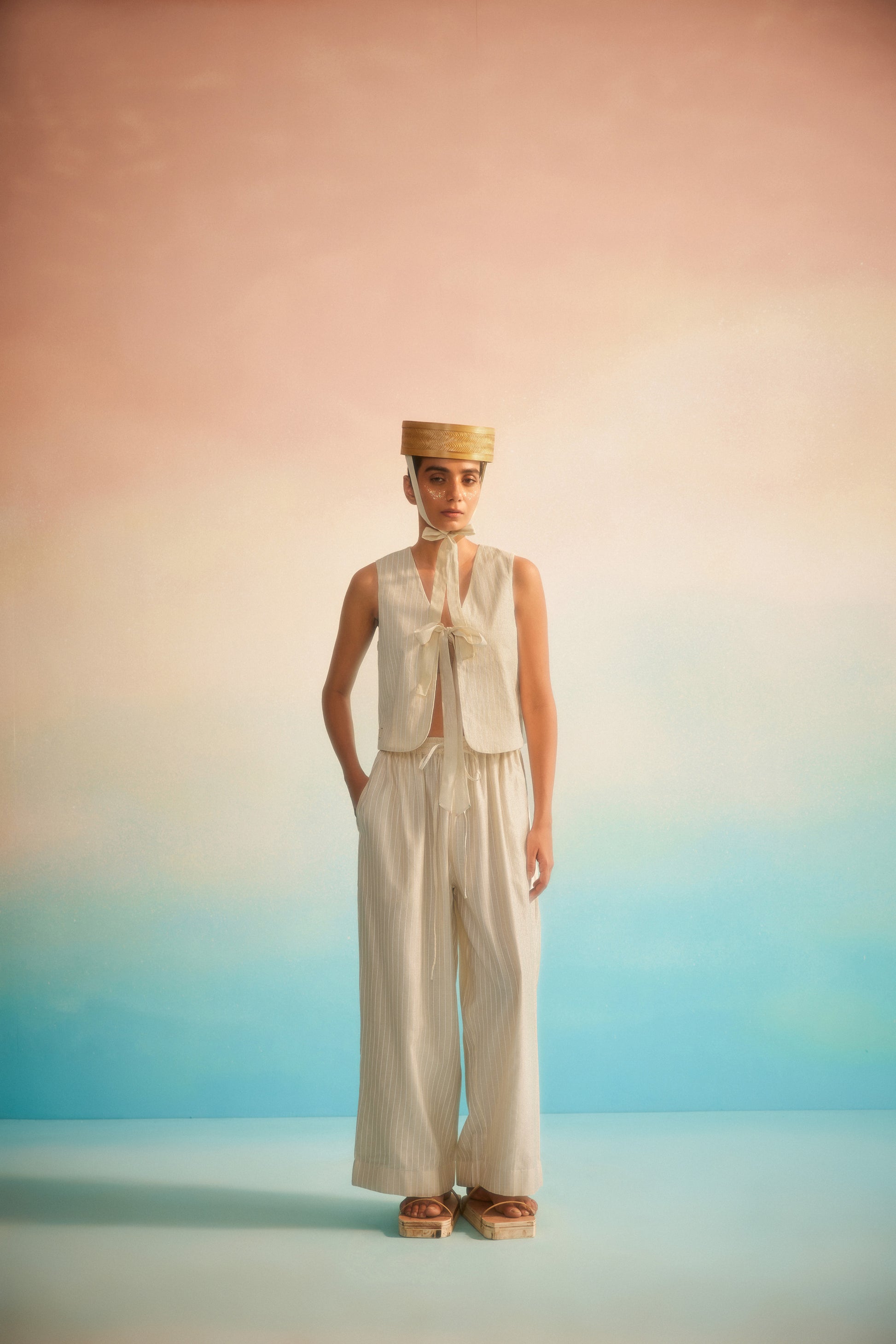 Crafted from striped Chanderi, the Hama Akari Drawstring Pant drapes effortlessly, offering a fluid silhouette that moves with you. The adjustable drawstring features detailed ends, adding a subtle touch of craftsmanship, while side pockets bring practicality to refined design. Lightweight and breathable, with hand screenprinted accents, these pants balance comfort and style — perfect for days when ease meets elegance.