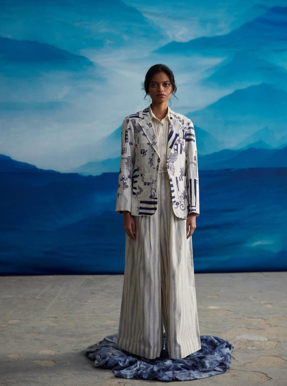This classic silhouette effortlessly blends strength and elegance, offering a relaxed style. Crafted from lightweight Chanderi, it boasts a luxurious feel against the skin. Elevate your wardrobe with this environmentally conscious piece, where sustainability meets timeless style.