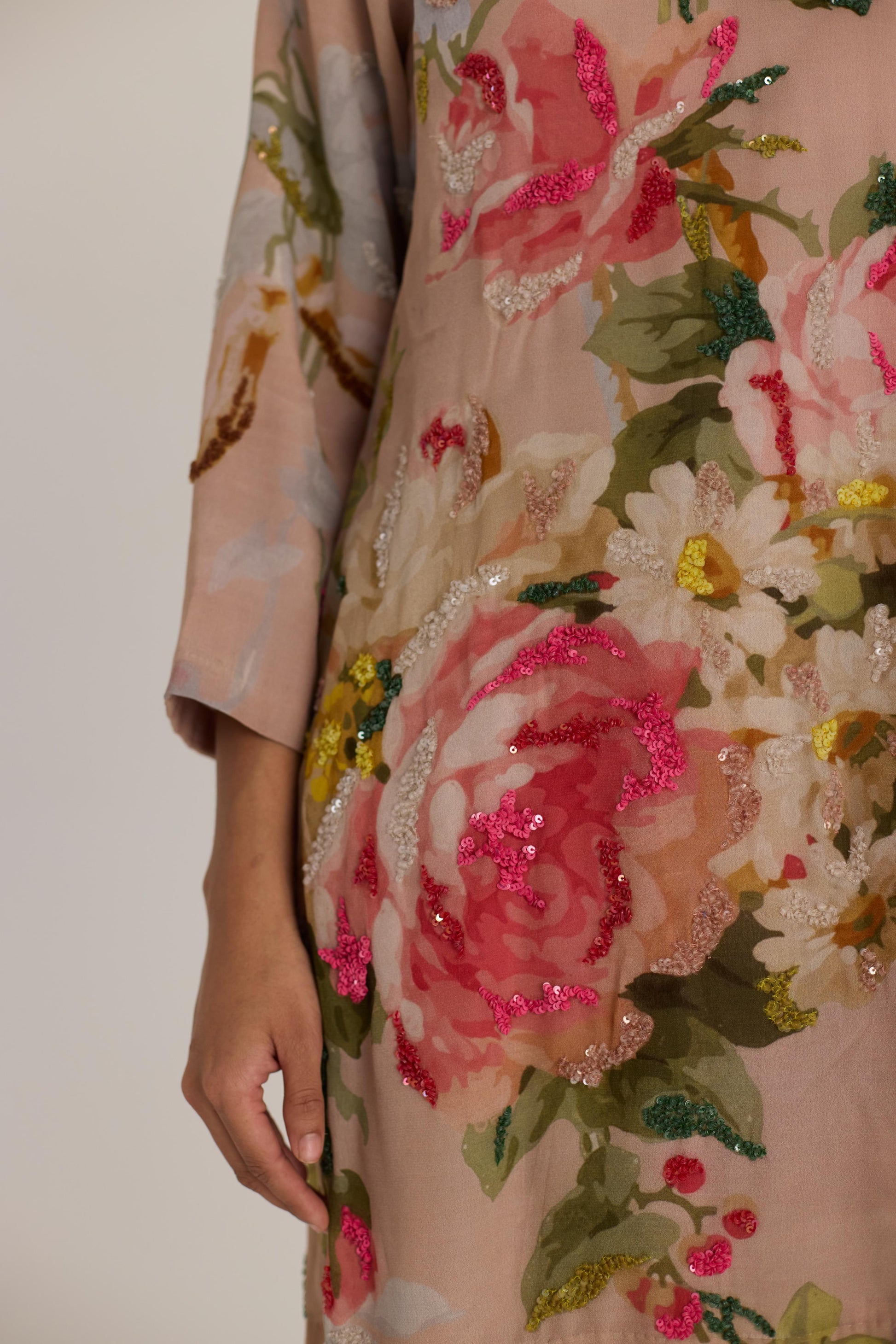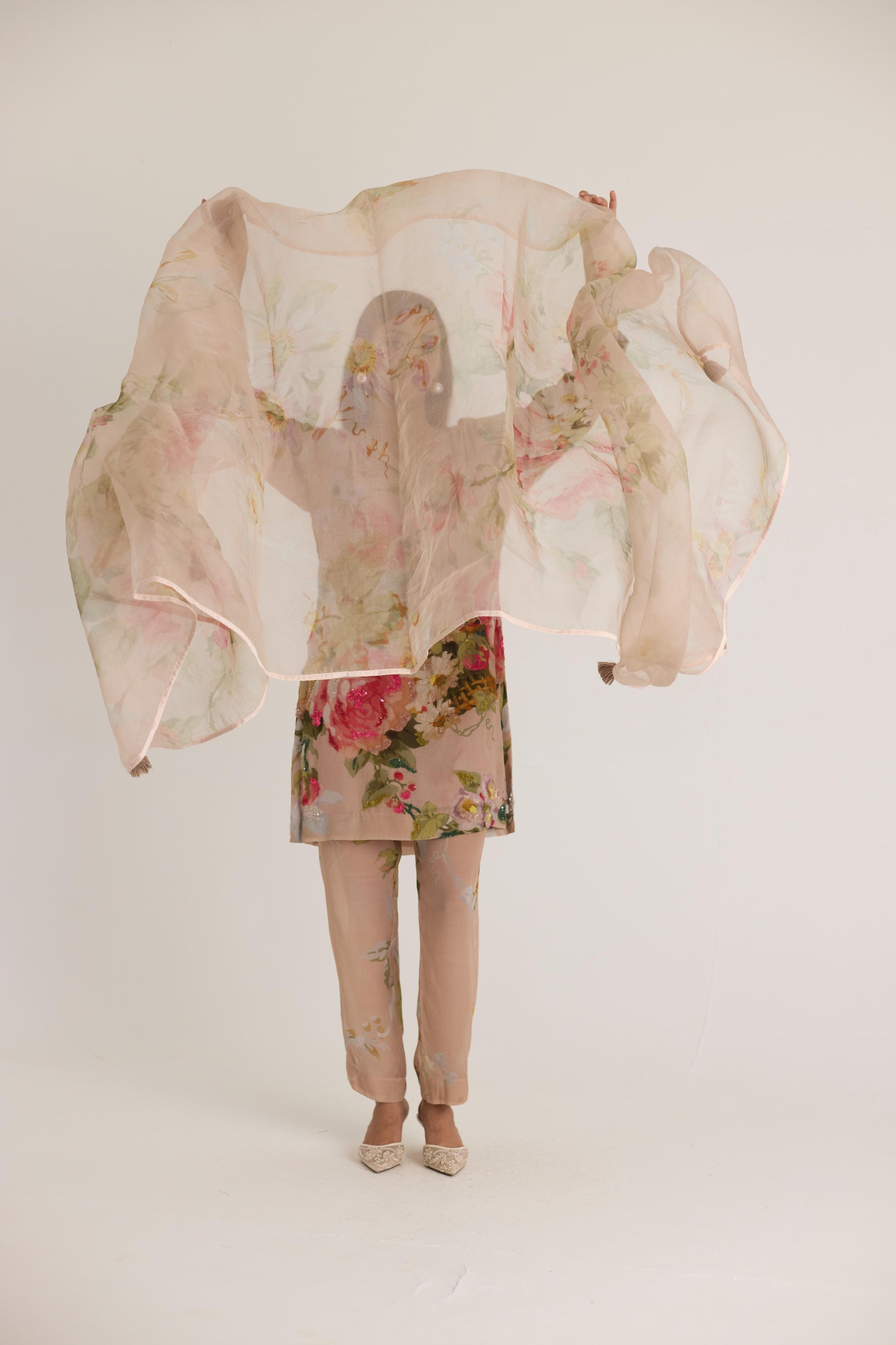 A delicate fusion of tradition and modernity, this 2 piece set features a soft blush-toned kurta adorned with exquisite hand-painted floral prints and intricate embroidery. The elegant floral motifs in shades of pink and green are further enhanced by fine embroidery, adding texture and depth. The sheer dupatta, adds a touch of ethereal charm can be added for an elevated look. Paired with matching straight trousers, this outfit is perfect for refined daywear or an elegant evening look.