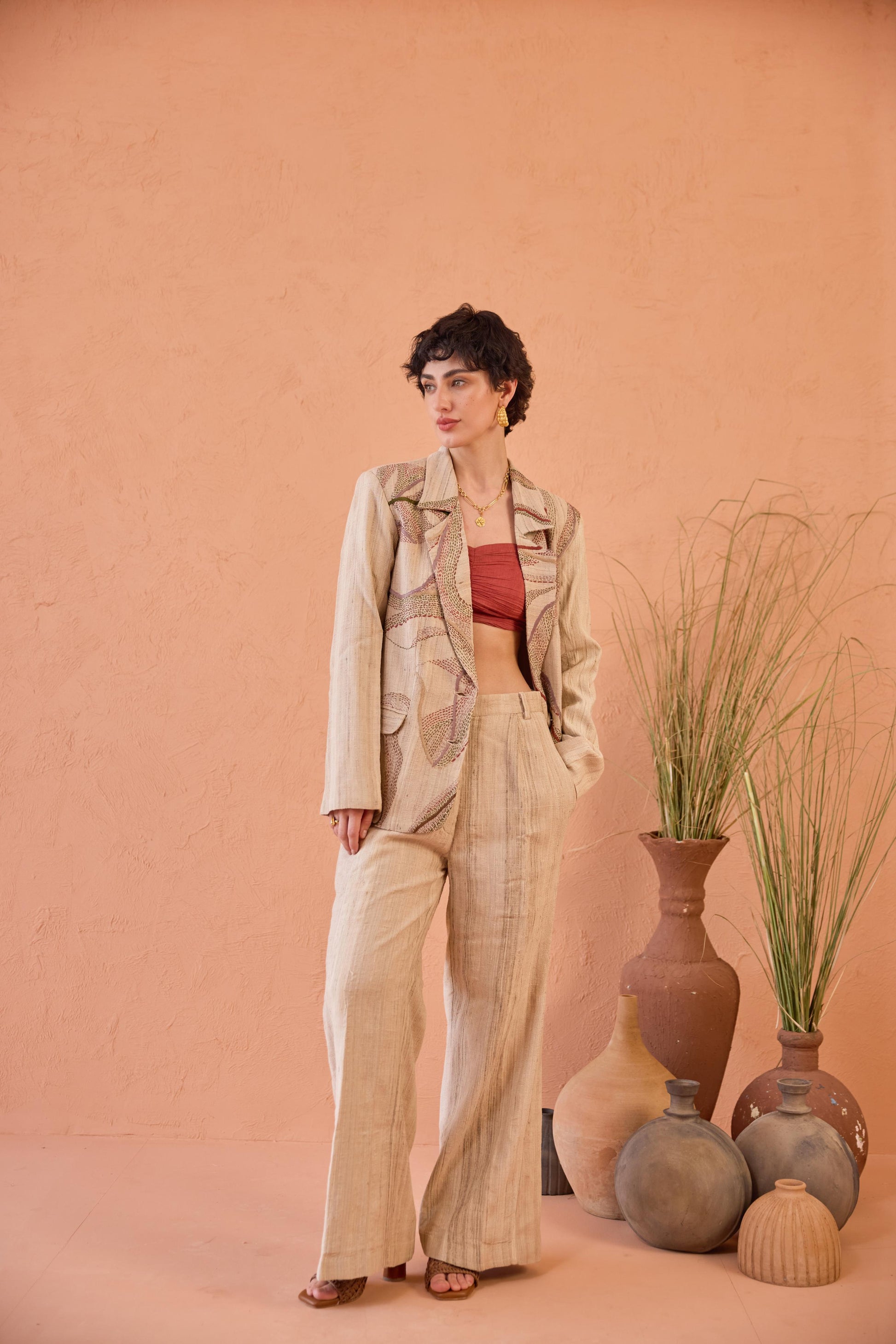 A classic silhouette meets artisanal finesse in this beige double-breasted blazer set, adorned with all-over kantha embroidery in delicate, line-art details. Shades of red, green, and lilac come together in a thoughtful palette, adding a touch of storytelling to every thread.