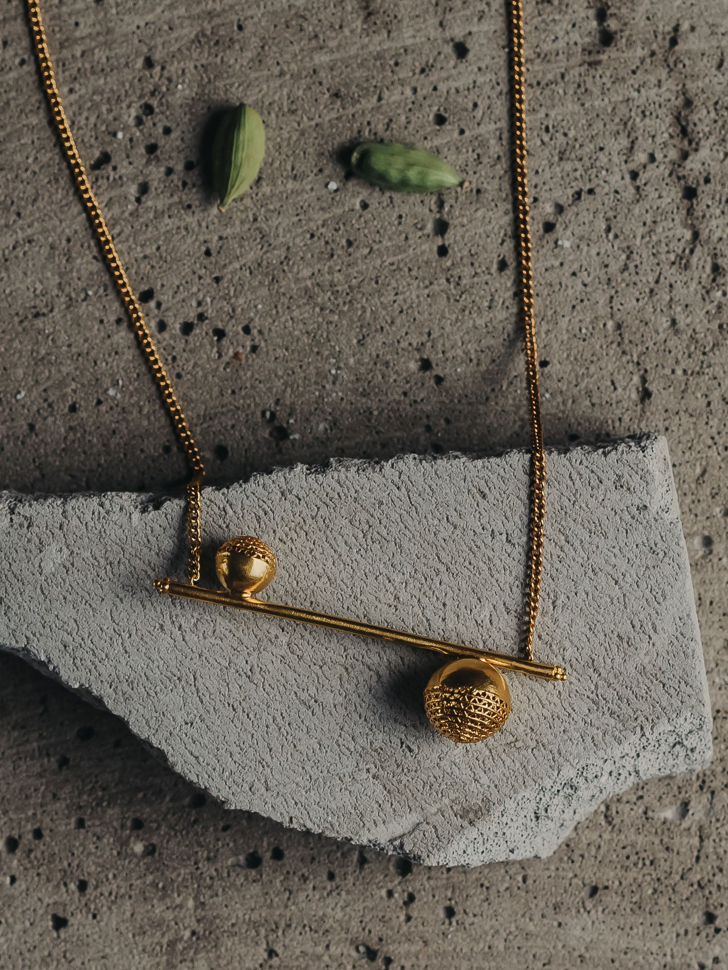 A contemporary, fun bar-pendant ornamented with gorgeous filigree globes. Sewn on a minimal chain that keeps it classy. Recipe for the perfect day-to-evening necklace.
