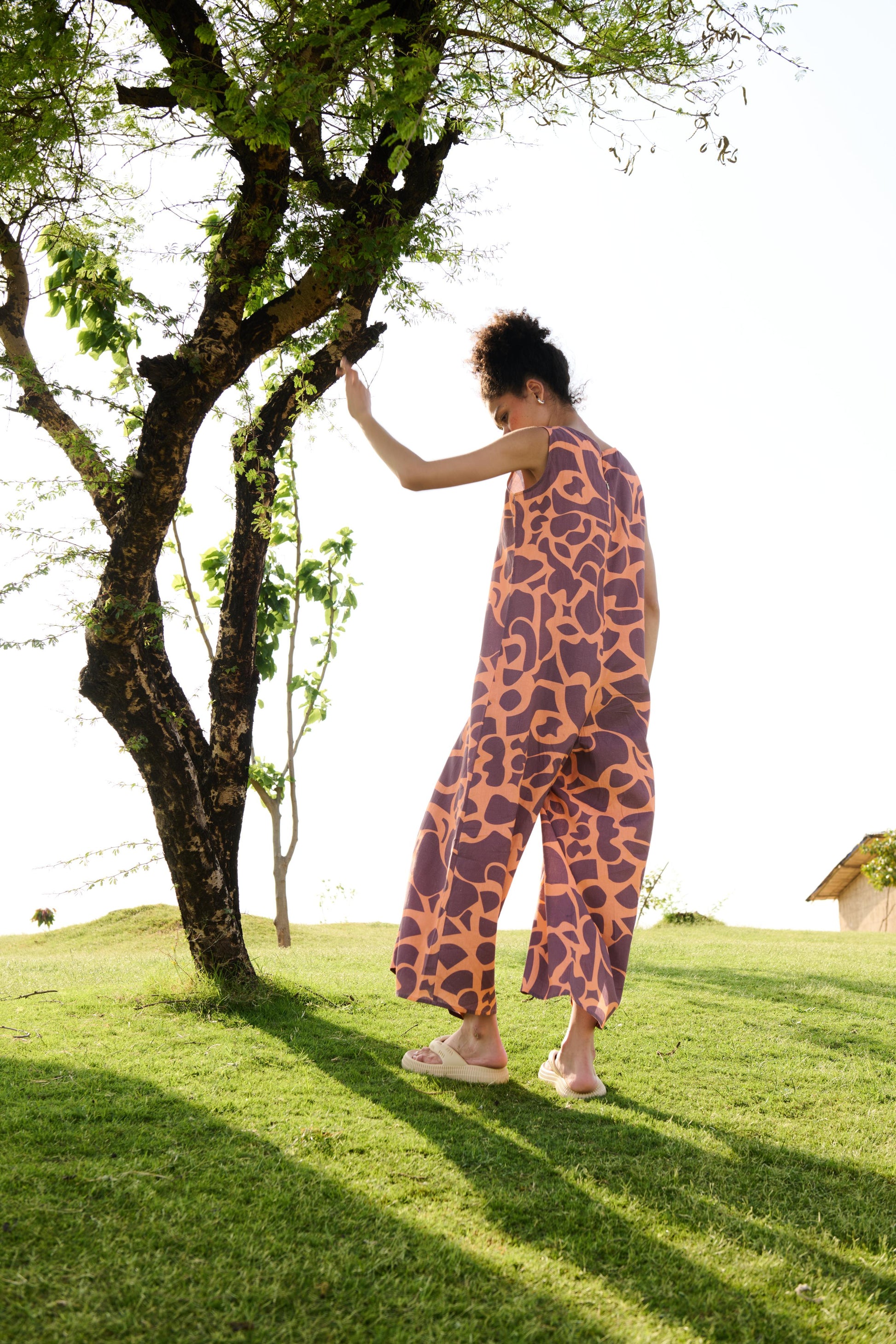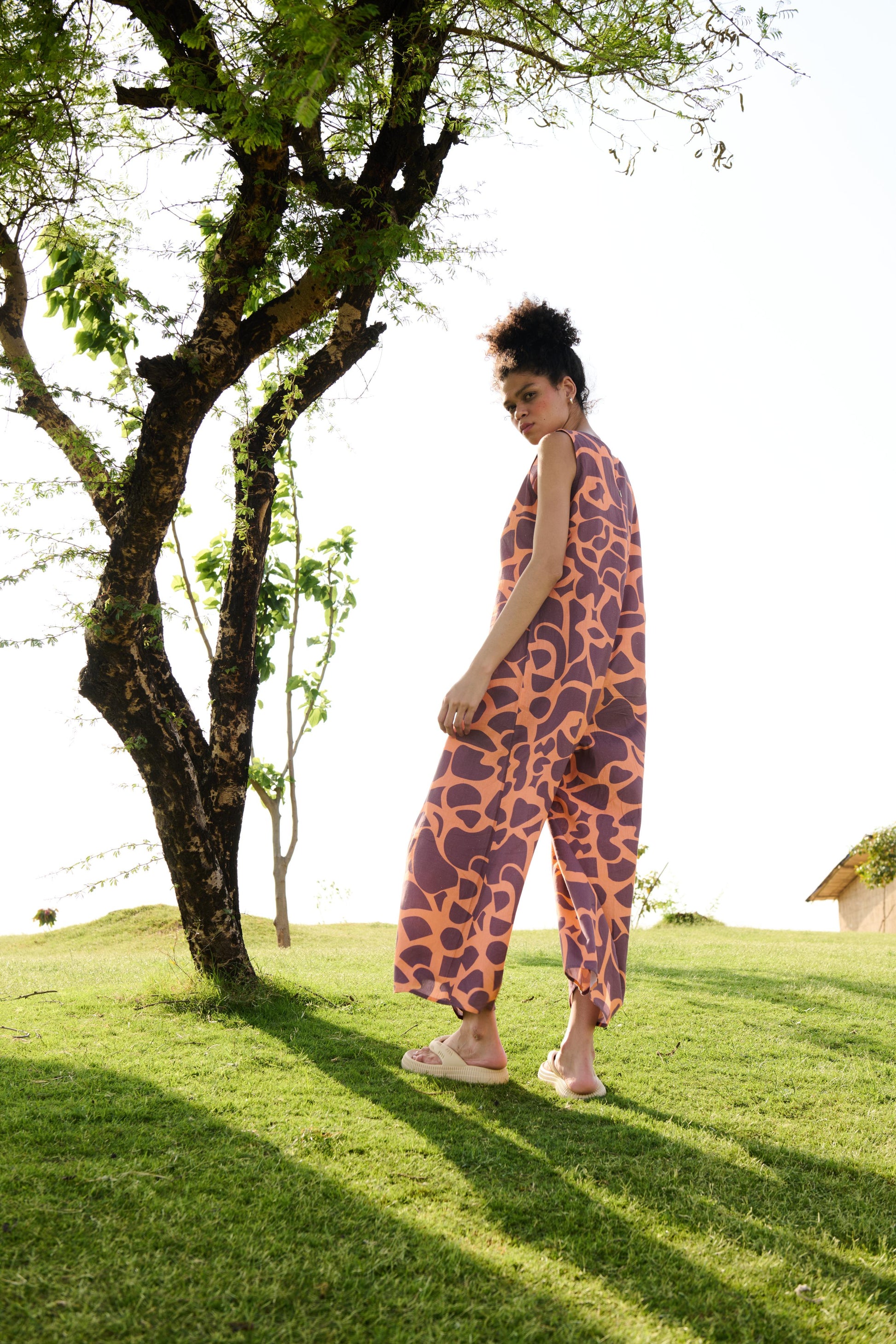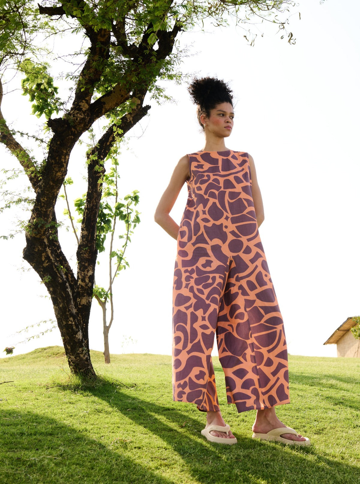 The hot poker jumpsuit is crafted with our linen cotton fabric in our deconstructed jumpsuit print. It has pockets on both the sides and concealed zip at the back.