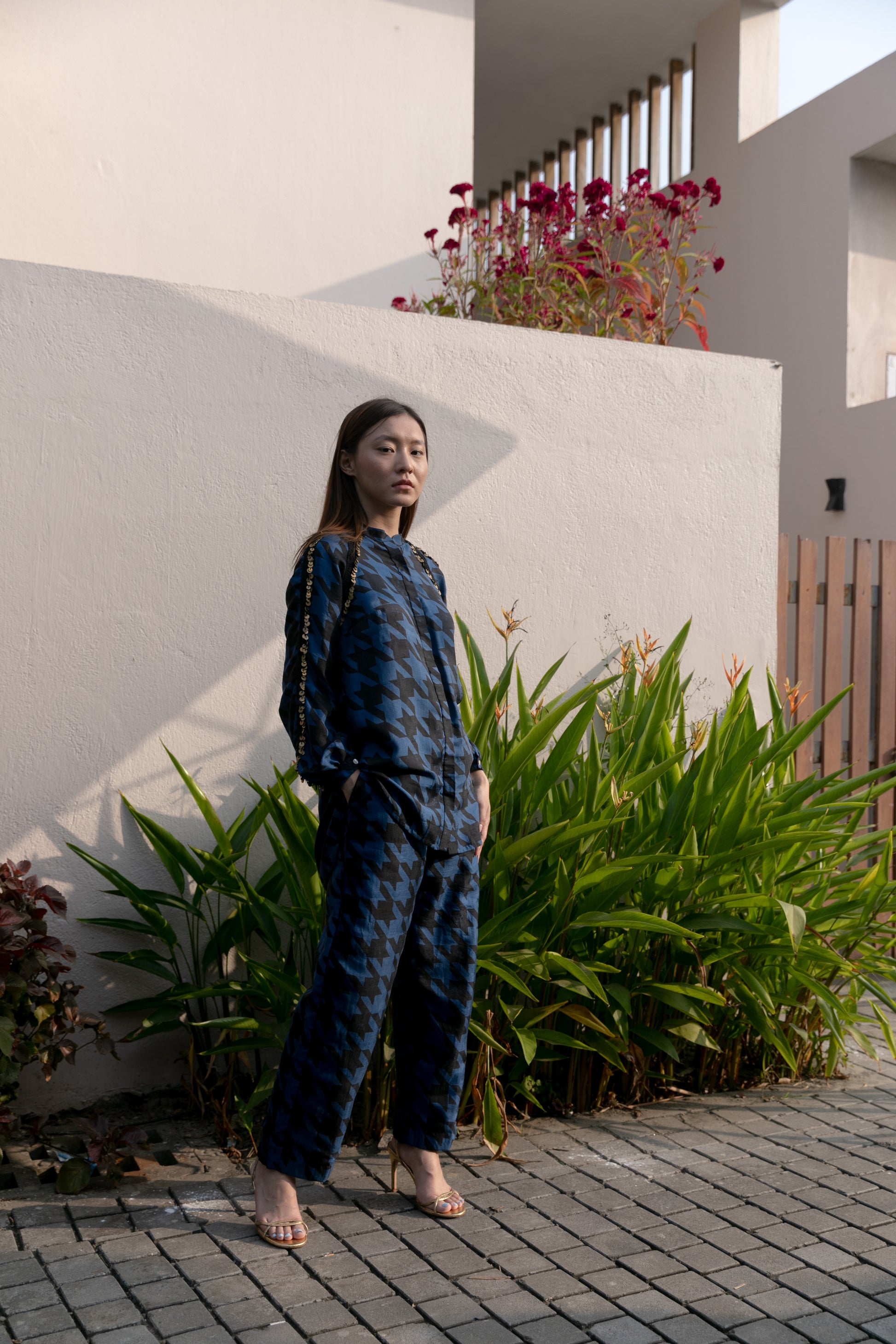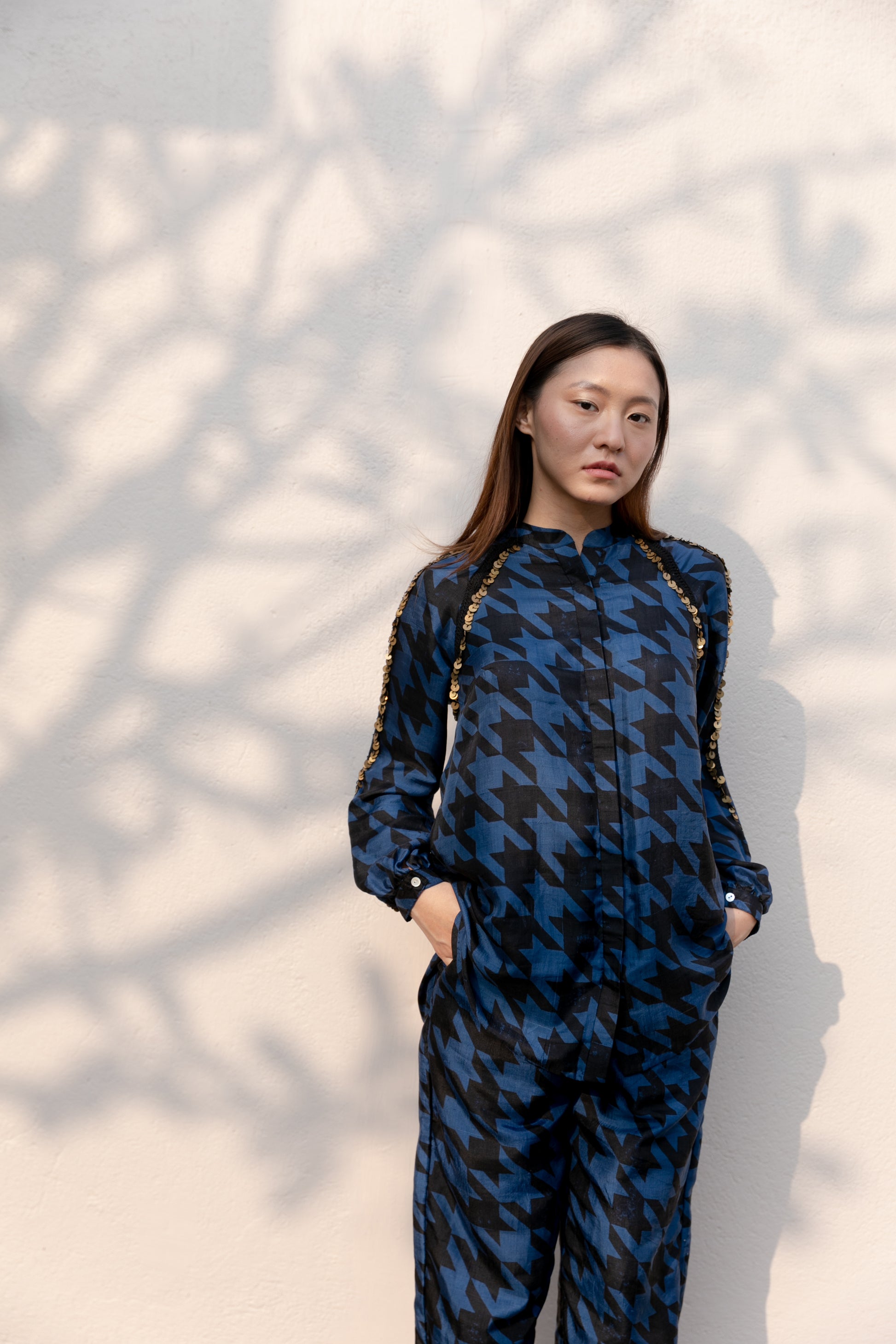 Block printed handwoven silk co-ord set with metal sequin