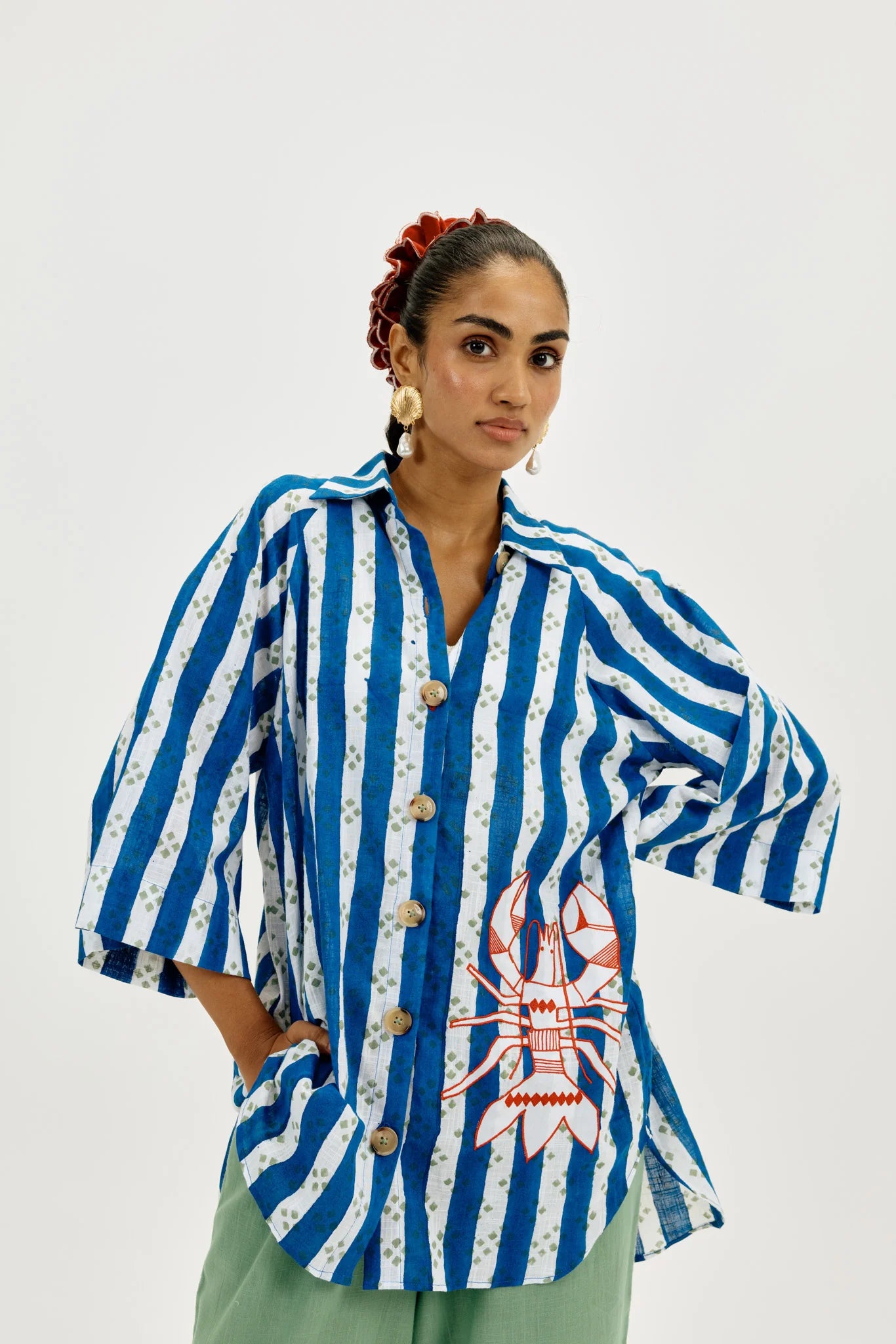 This boxy button-down is equal parts playful and polished. Featuring hand-blocked vertical stripes and a bright red lobster appliqué, it’s got wide sleeves and a relaxed drop-shoulder fit. A must-have for when basics get boring.