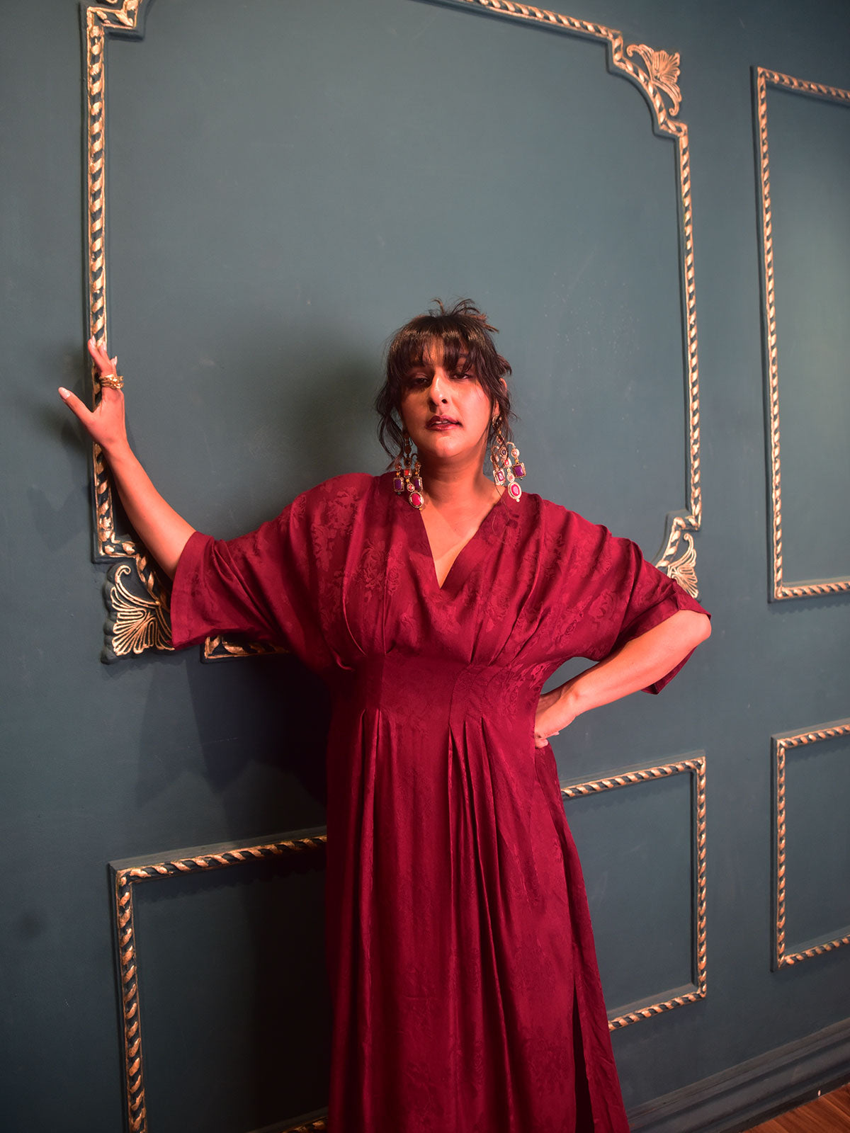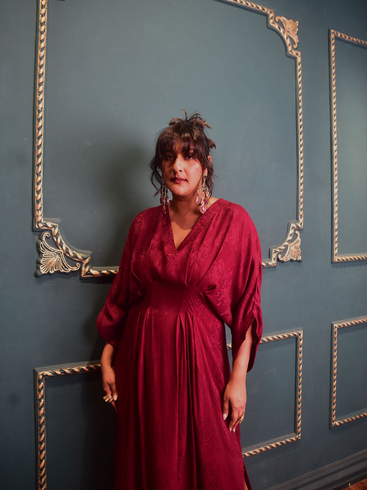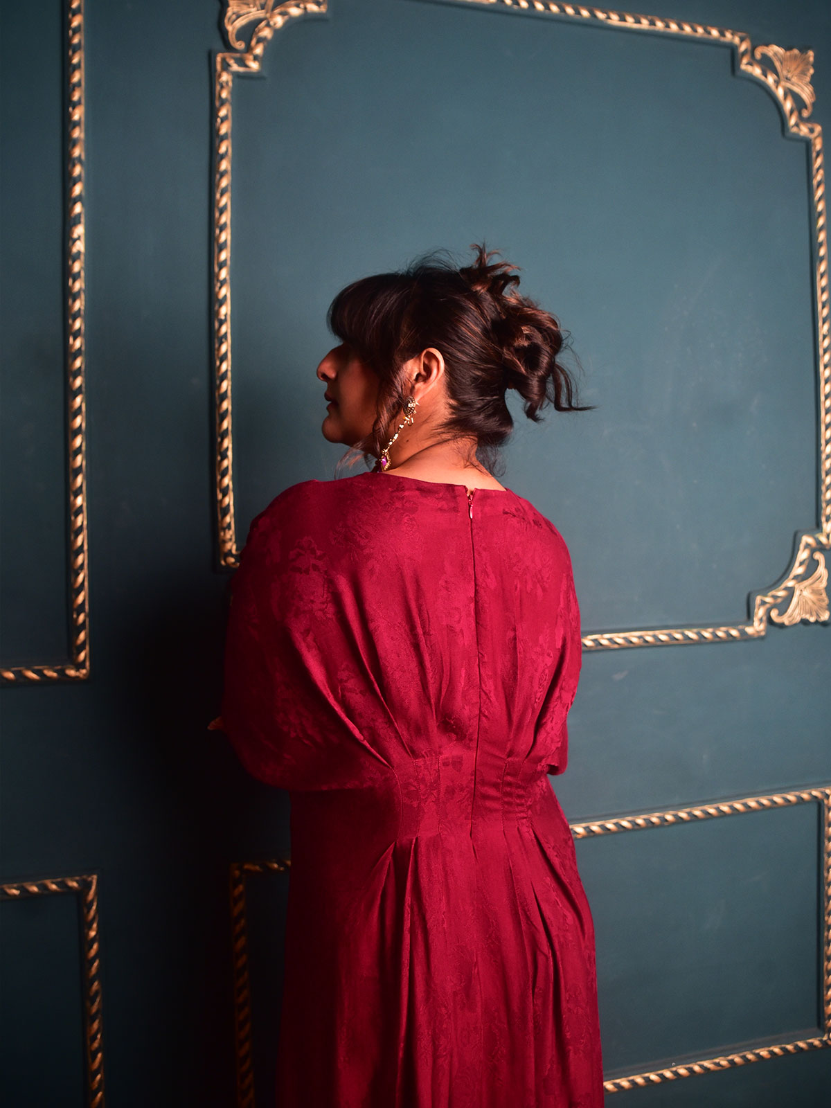Cut in our exclusive rich maroon viscose modal jacquard fabric, with a woven pattern and elevated sheen corset dress with loose fitted sleeves which features four pleats in the front and back of the waistline.