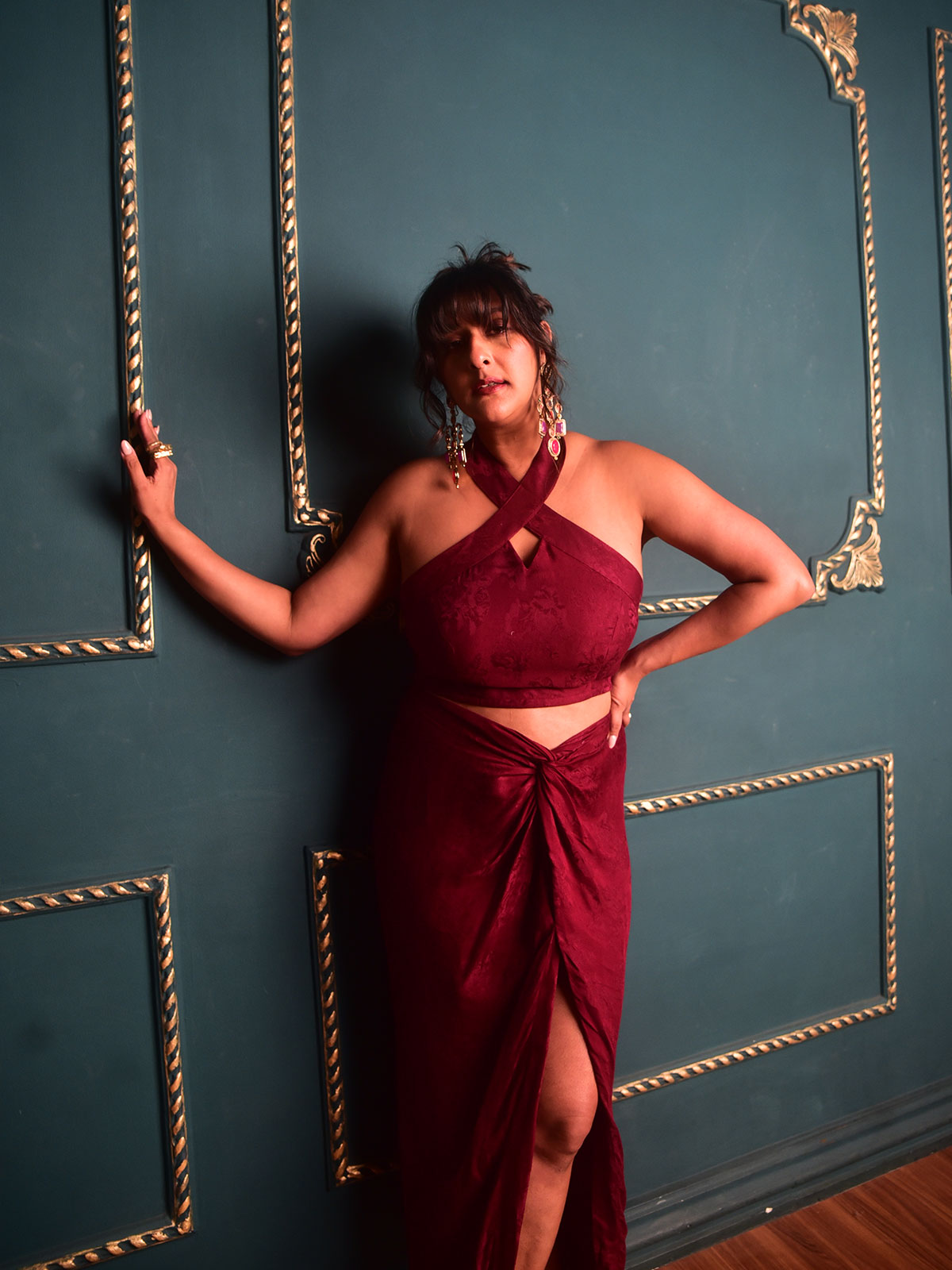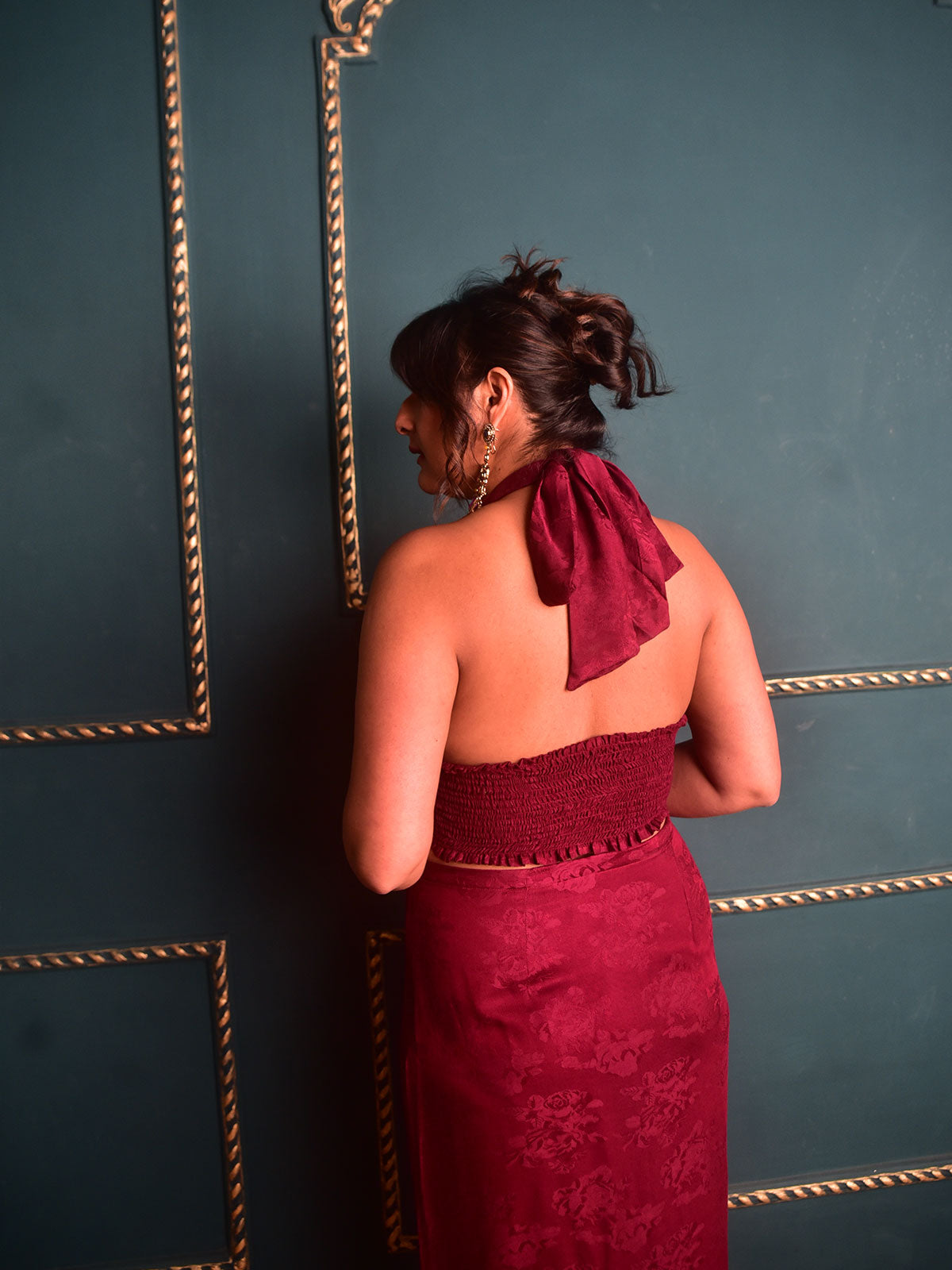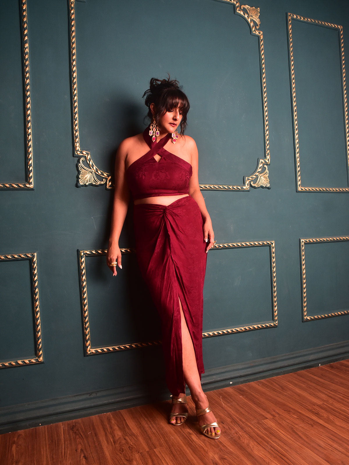 From the screen to the red carpet, this look is one to turn heads. Cut in our exclusive rich maroon viscose modal jacquard fabric, with a woven pattern and elevated sheen skirt with a knot detail in the front. This Co-ord Set comes with Irina Top.