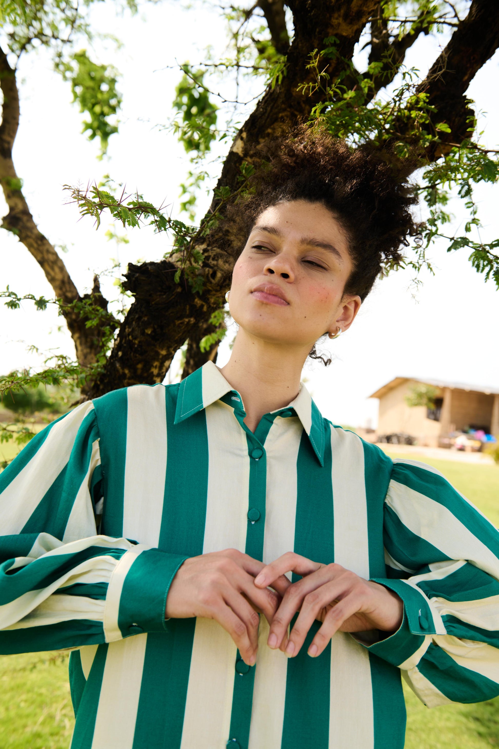 The Iris coord set is crafted with our linen cotton button down long tunic in our green stripe print paired with pyjama pants.