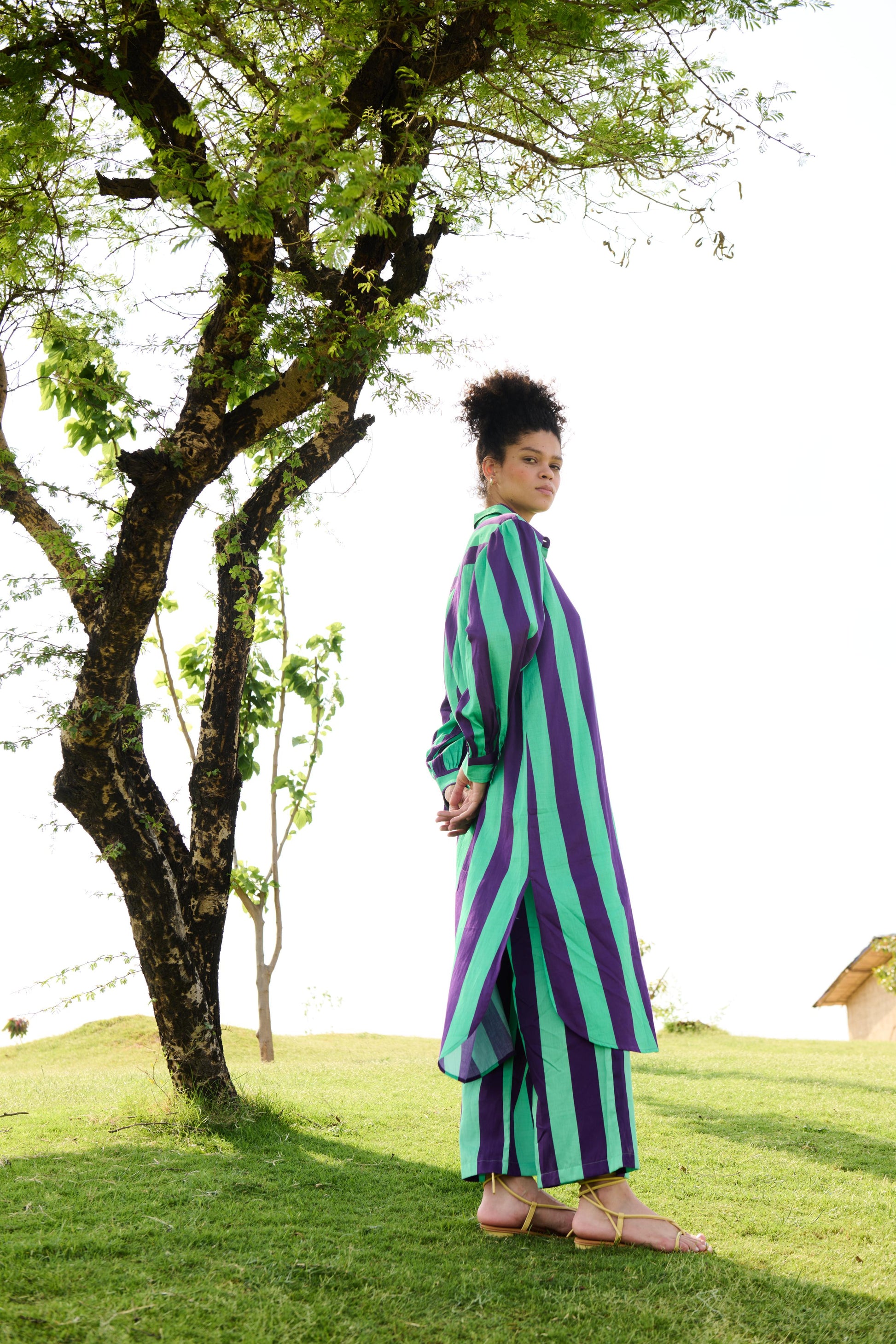 The Iris coord set is crafted with our linen cotton button down long tunic in our purple & green stripe print paired with pyjama pants.