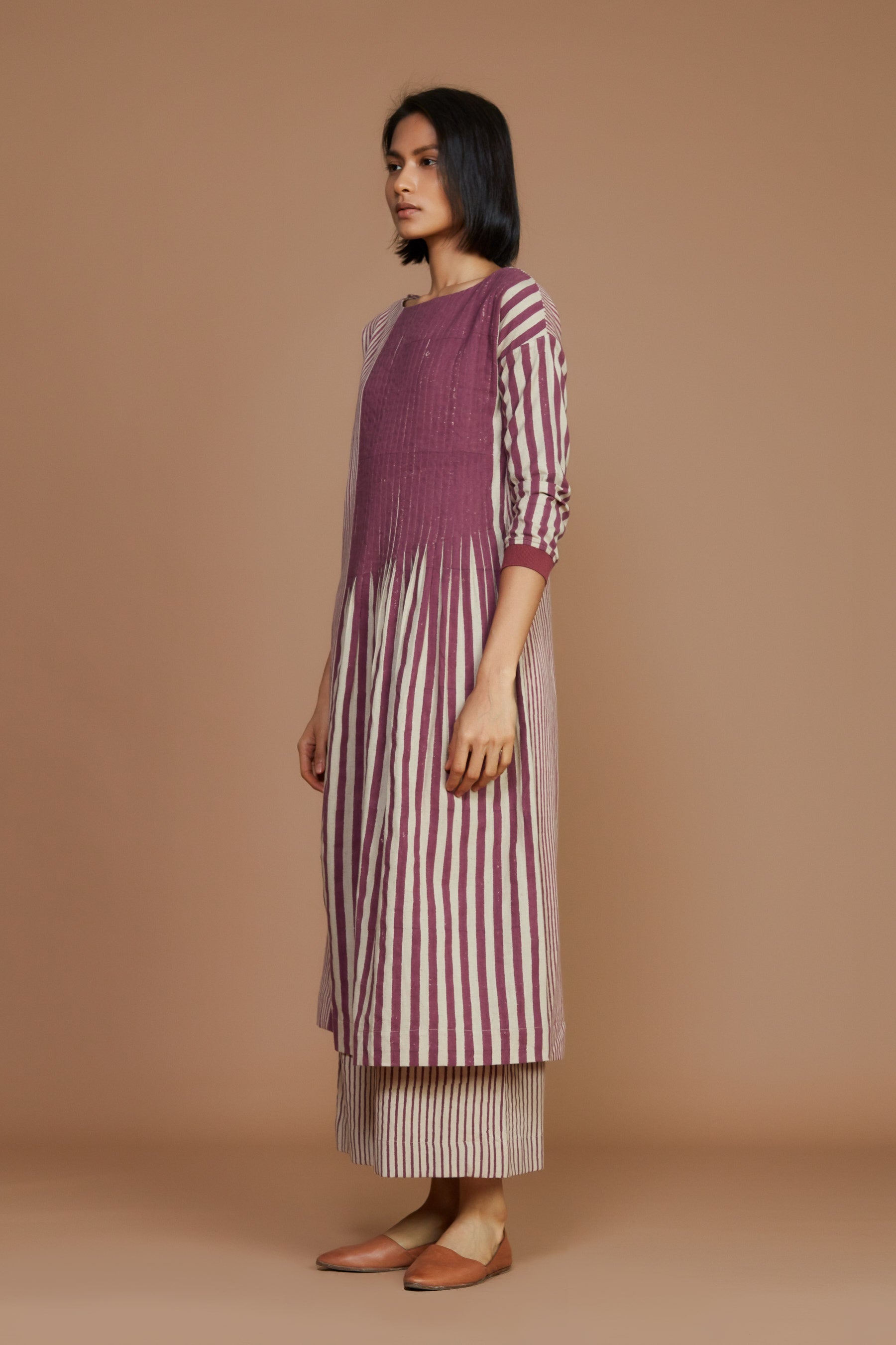 Ivory With Mauve Striped Pleated Dress