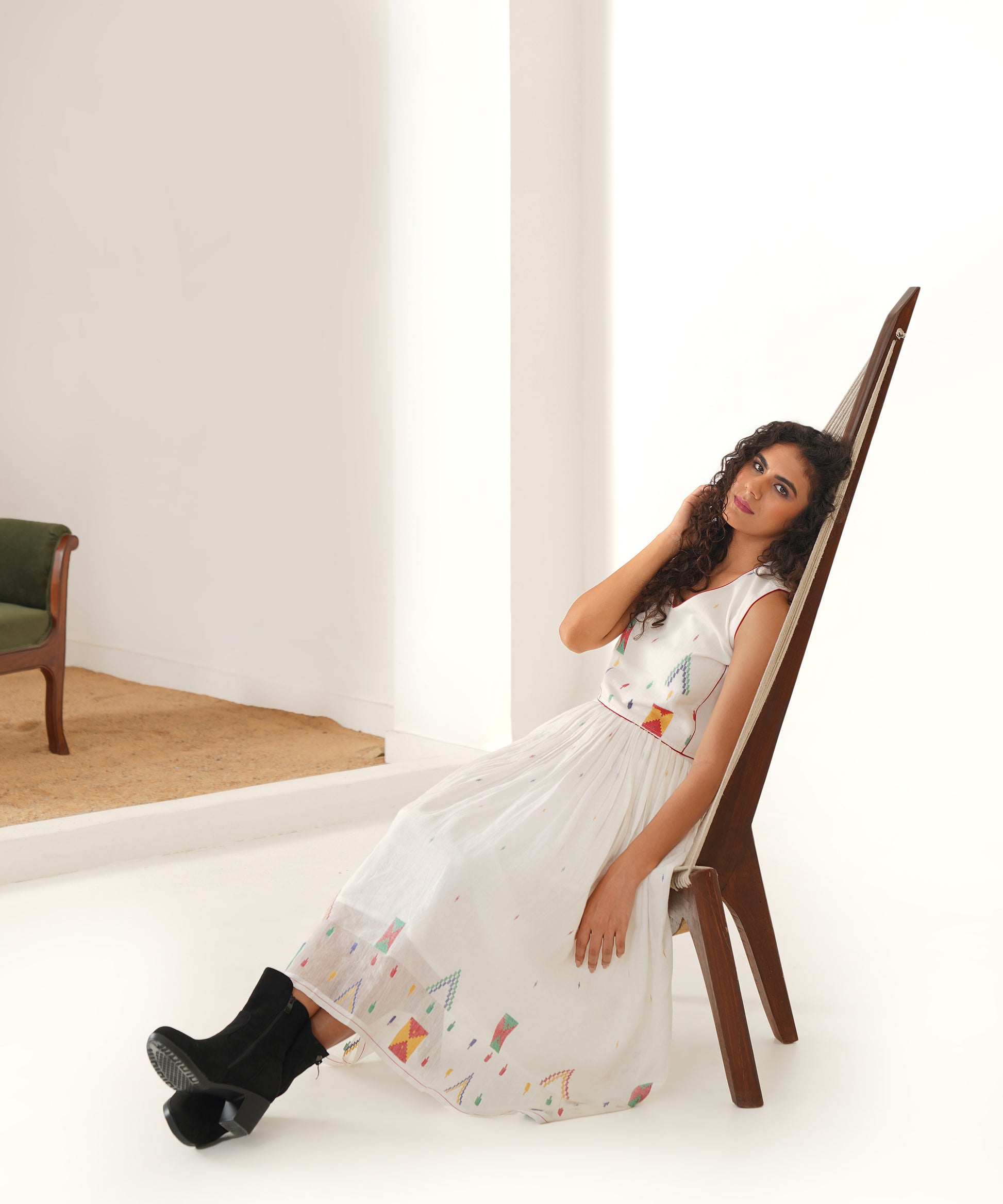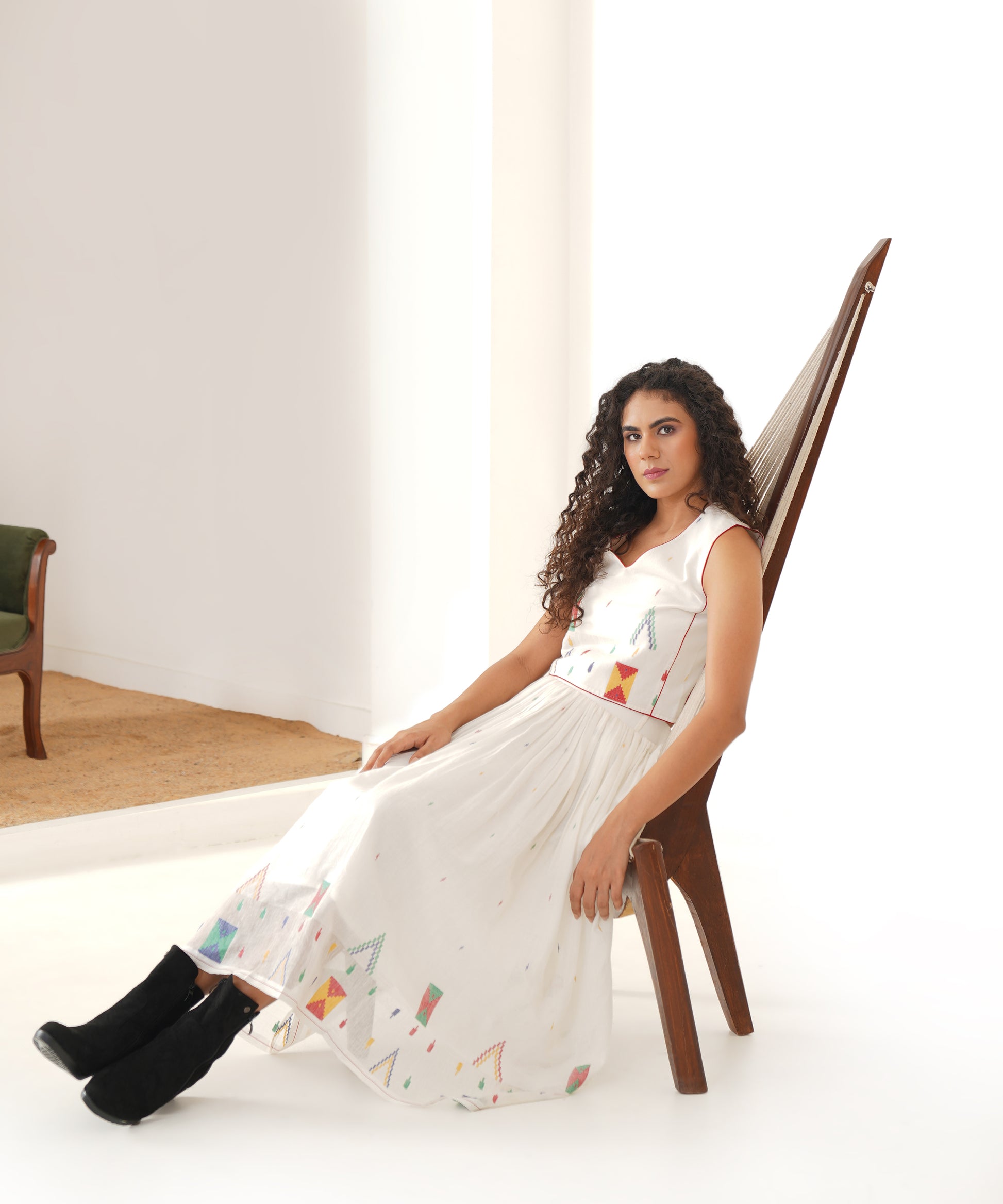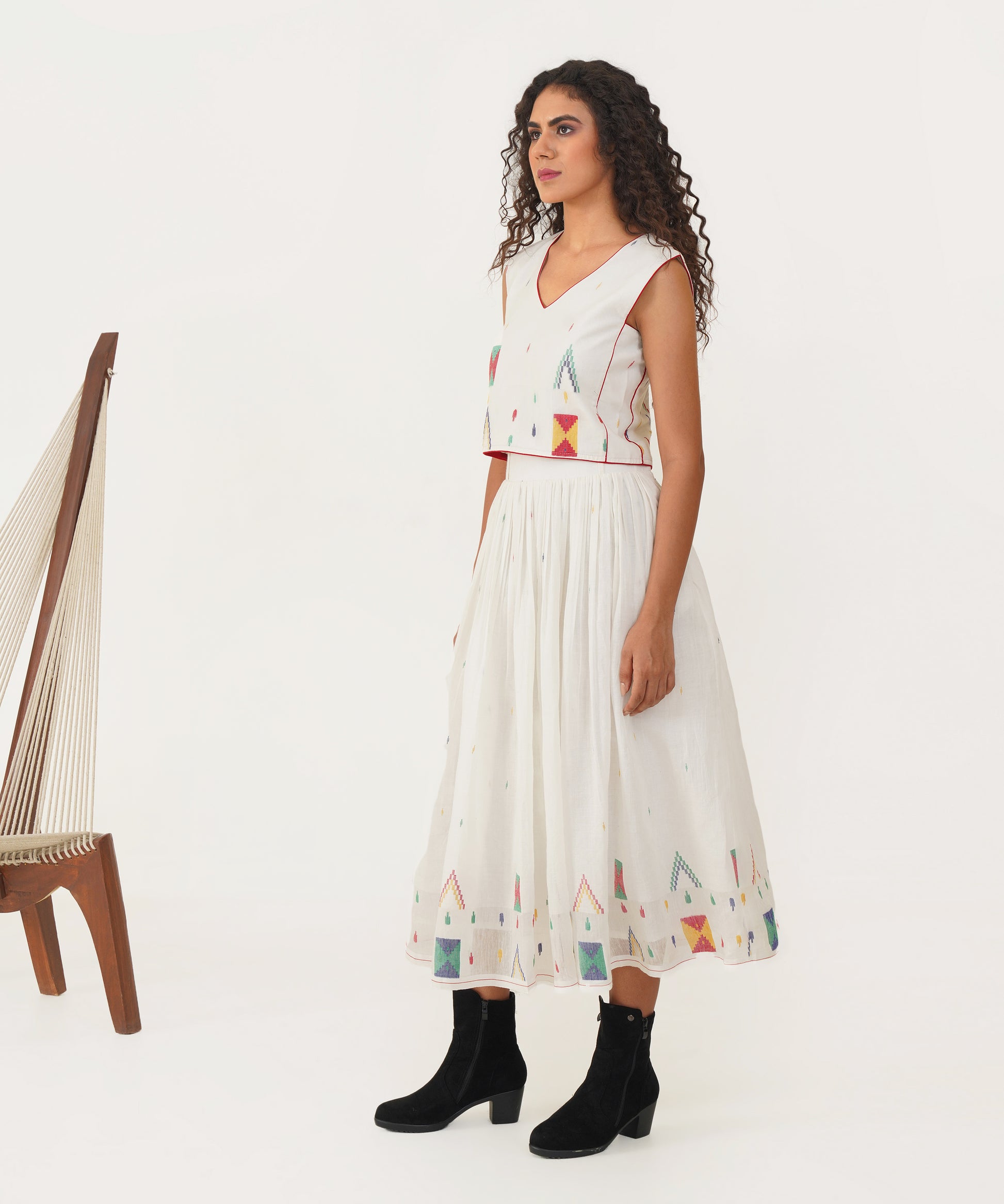 A stunning Jamdani ensemble that merges elegance with sustainability. This beautiful set features a delicately gathered skirt with convenient side pockets, offering both style and practicality. The coordinating top is enhanced with striking contrast piping detailing, and the back zipper closure adds a modern touch. Thoughtfully crafted with sustainability in mind, this ensemble is a perfect addition to a mindful wardrobe, combining timeless design with eco-conscious appeal.