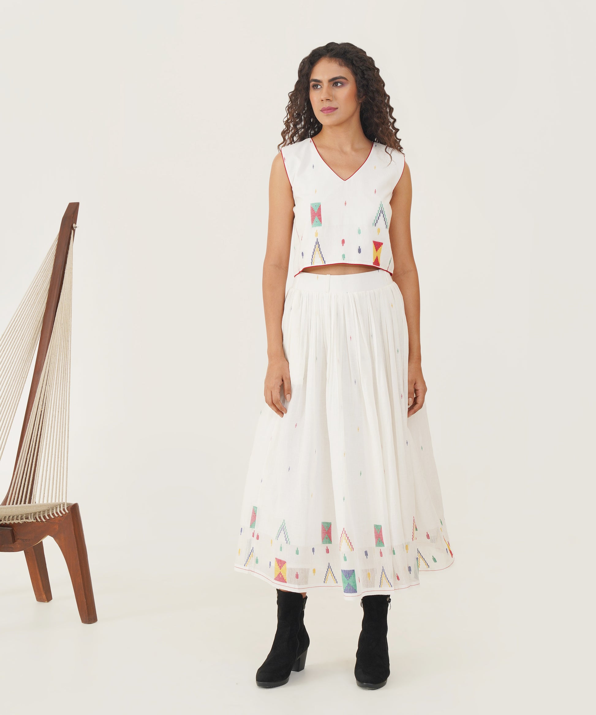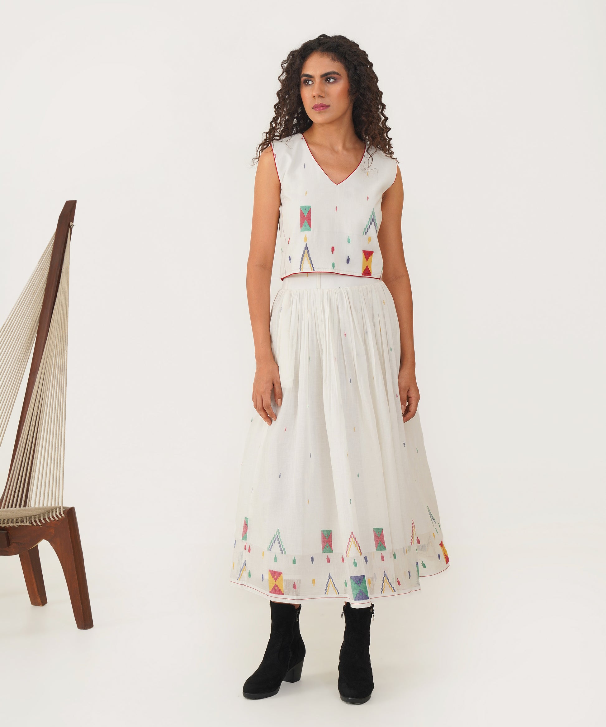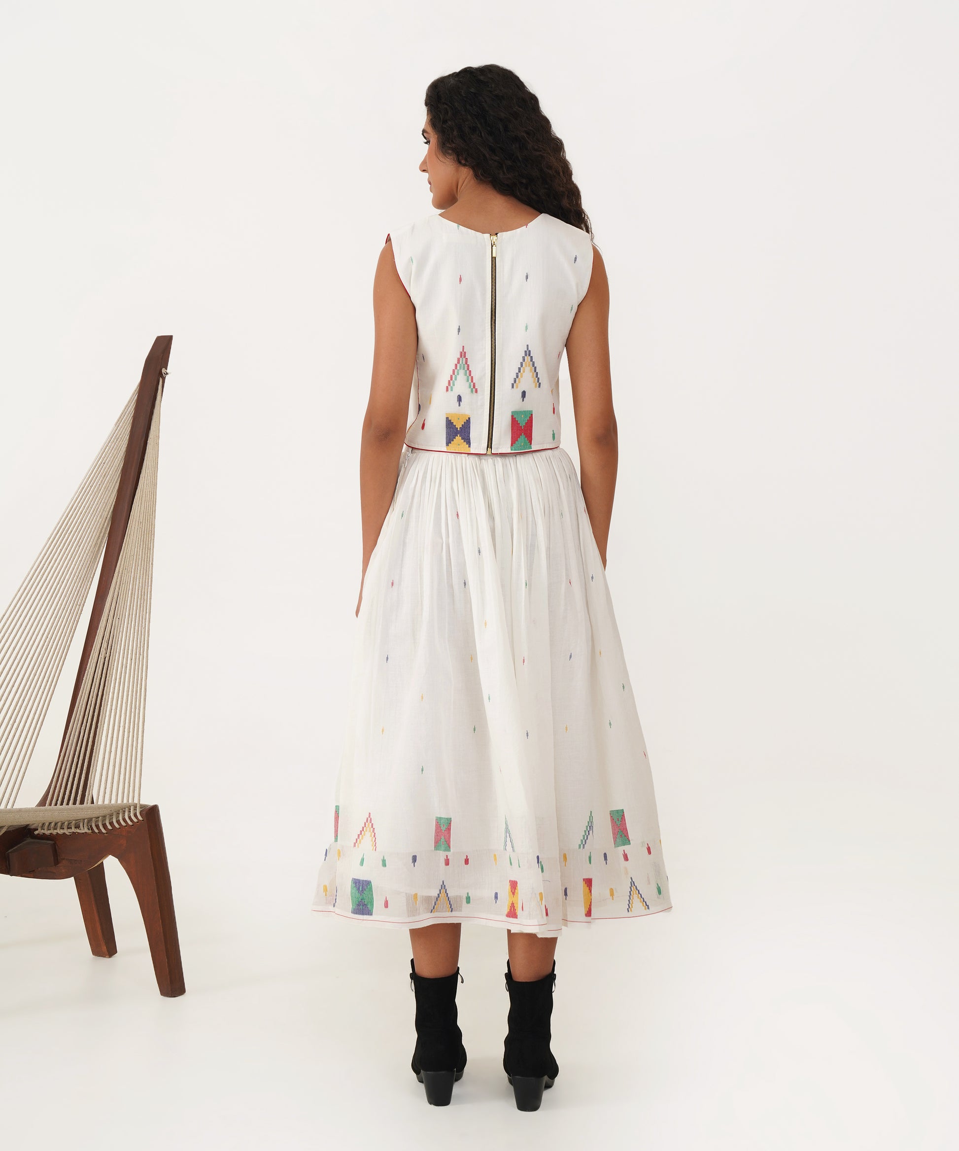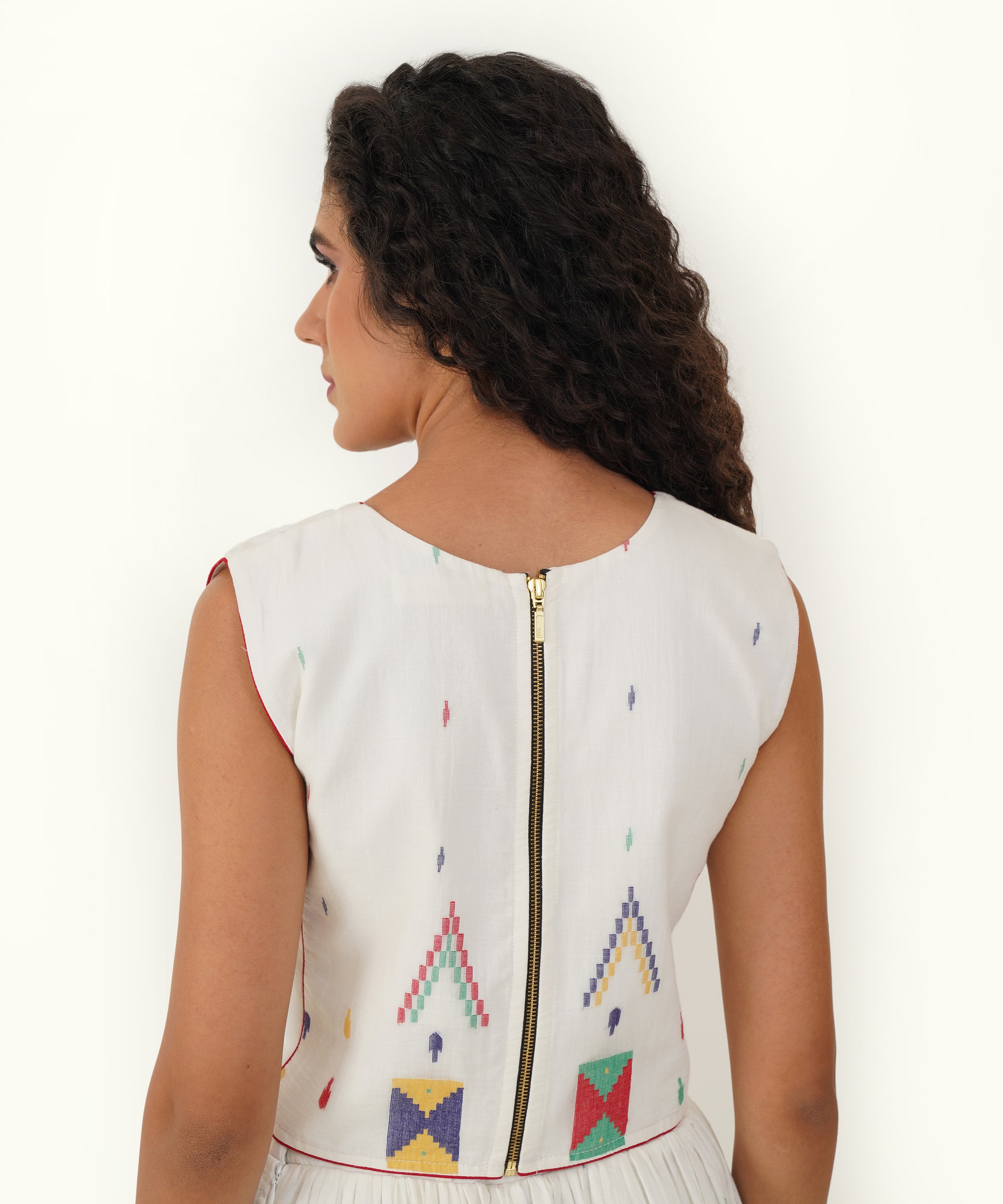 Elevate your sustainable wardrobe with this beautiful Jamdani top, designed to make a statement with its elegant V neckline and striking contrast piping detailing. The back features a sleek jacket zipper fastening, combining functionality with contemporary style. Crafted with care, this top not only enhances your look but also reflects a commitment to thoughtful fashion choices.