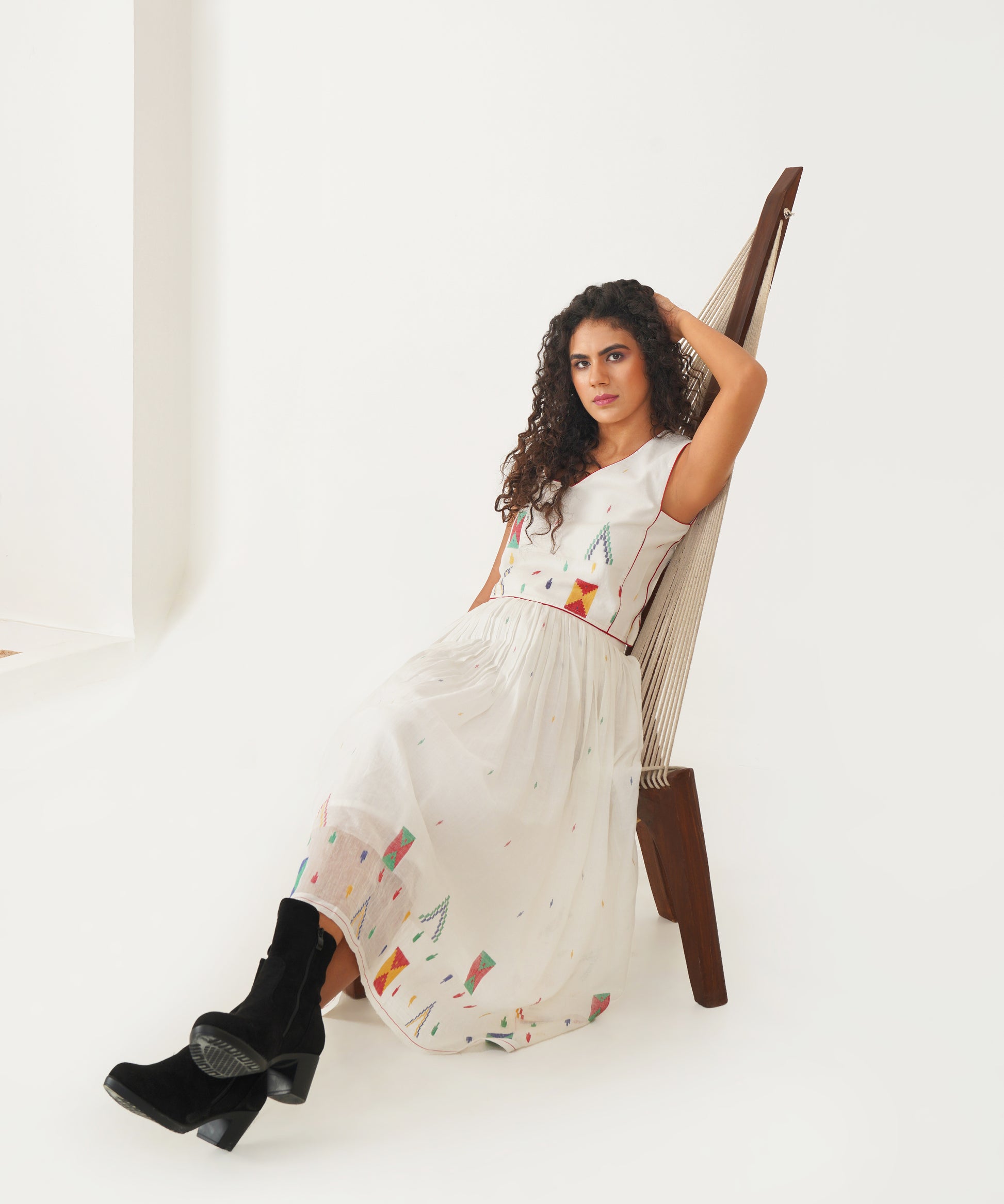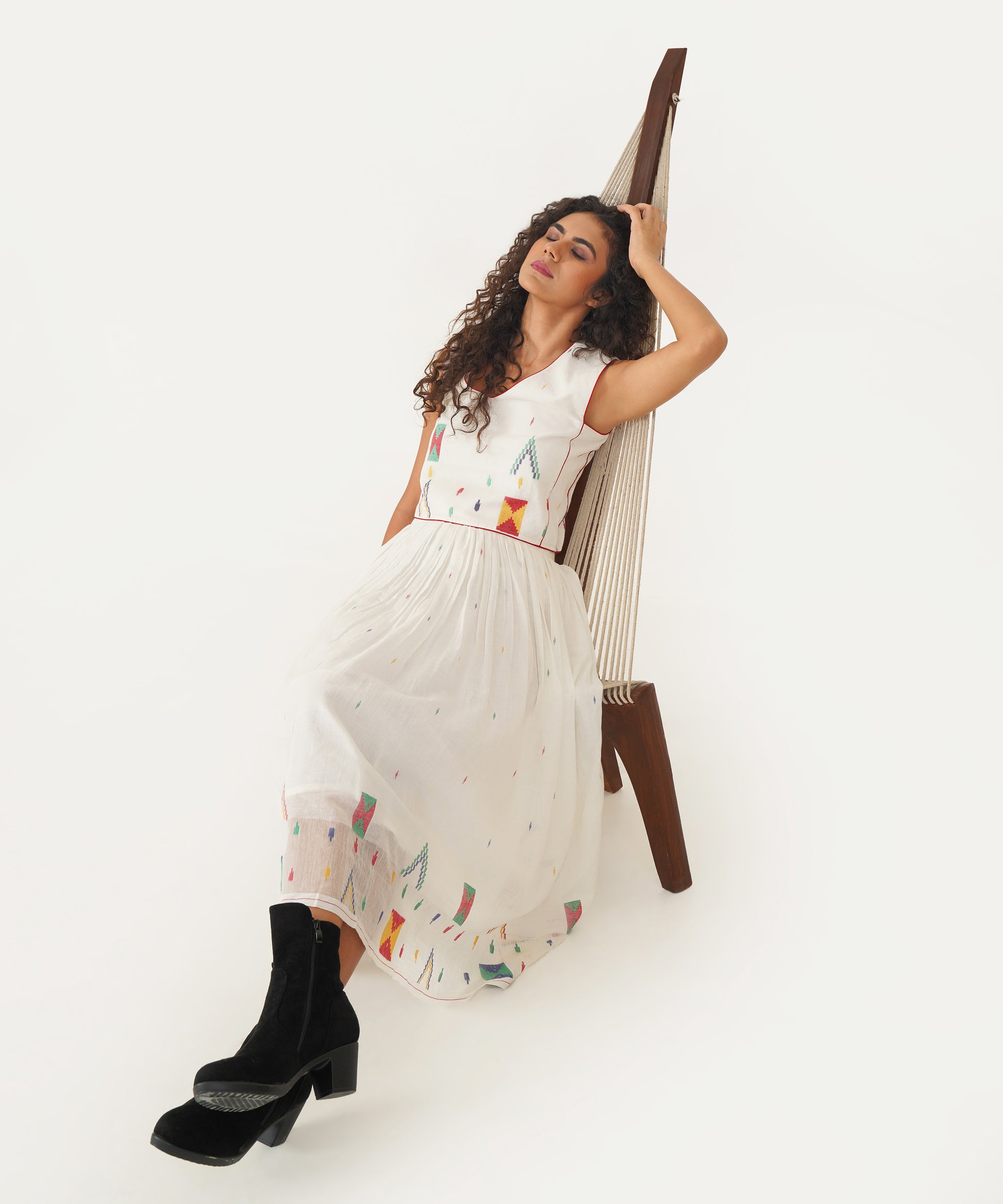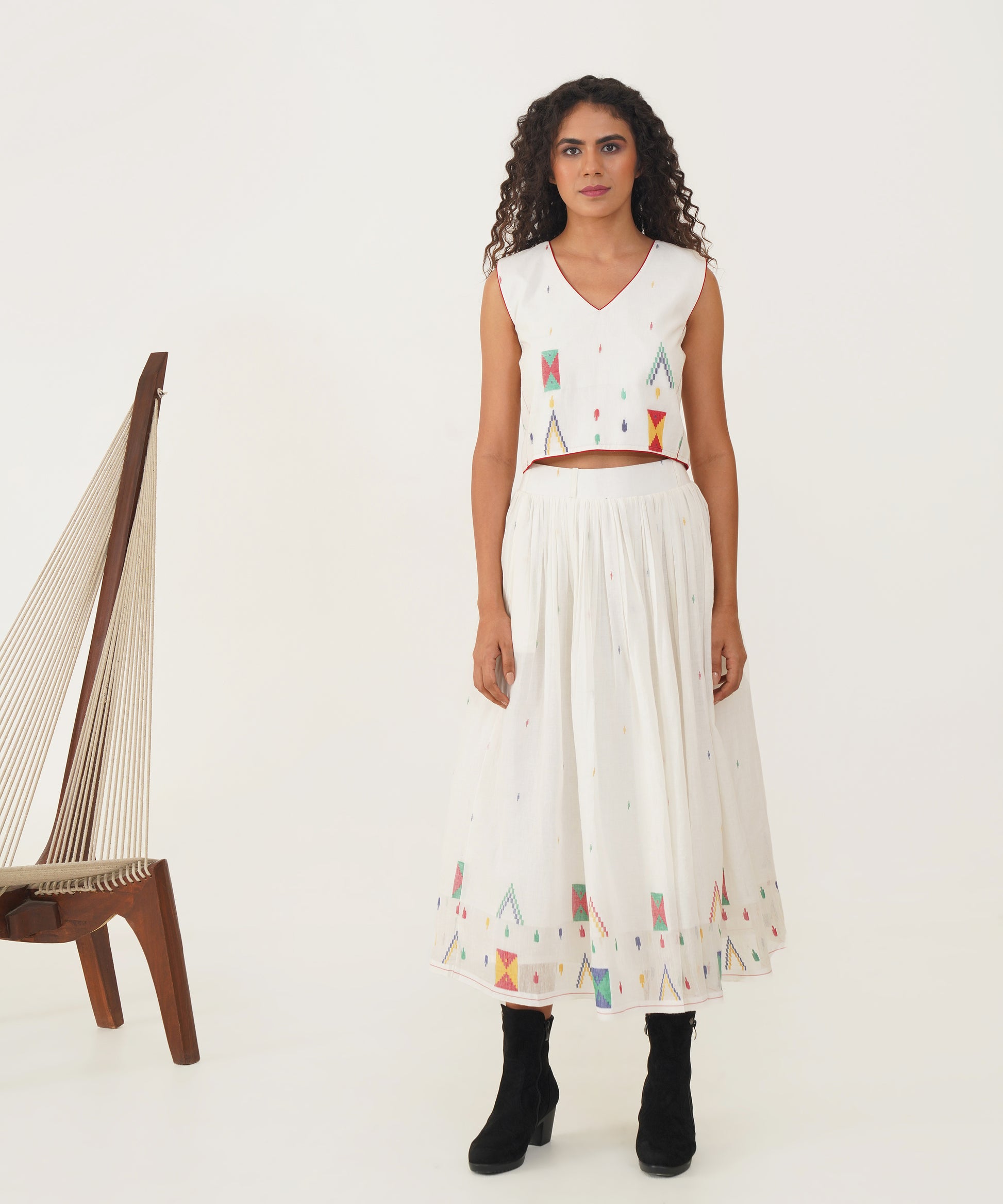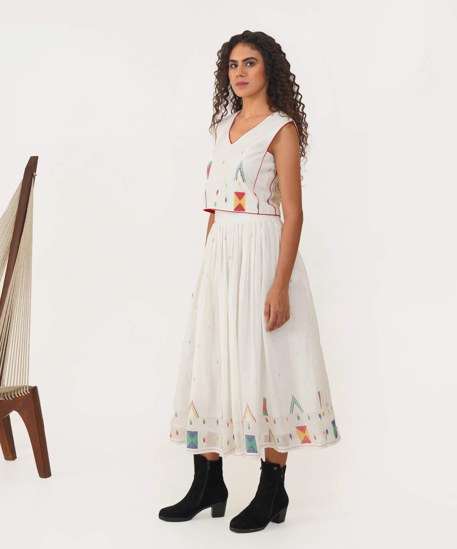 Elevate your sustainable wardrobe with this beautiful Jamdani top, designed to make a statement with its elegant V neckline and striking contrast piping detailing. The back features a sleek jacket zipper fastening, combining functionality with contemporary style. Crafted with care, this top not only enhances your look but also reflects a commitment to thoughtful fashion choices.