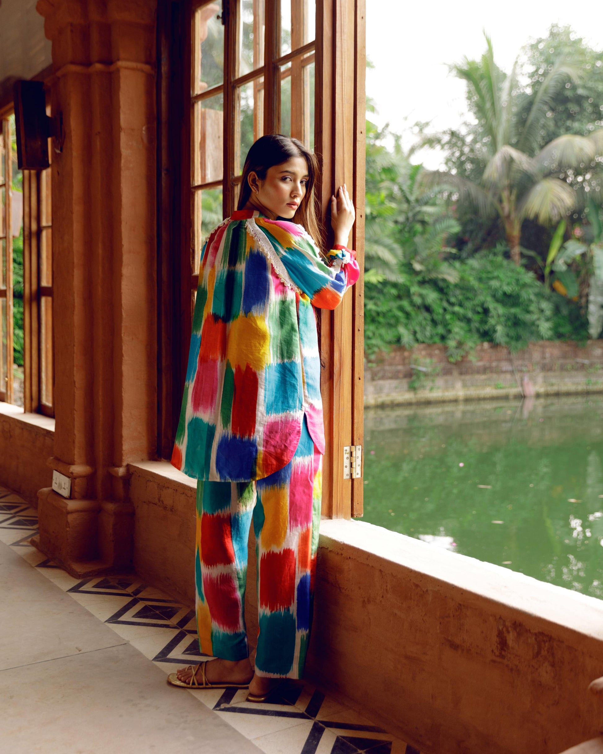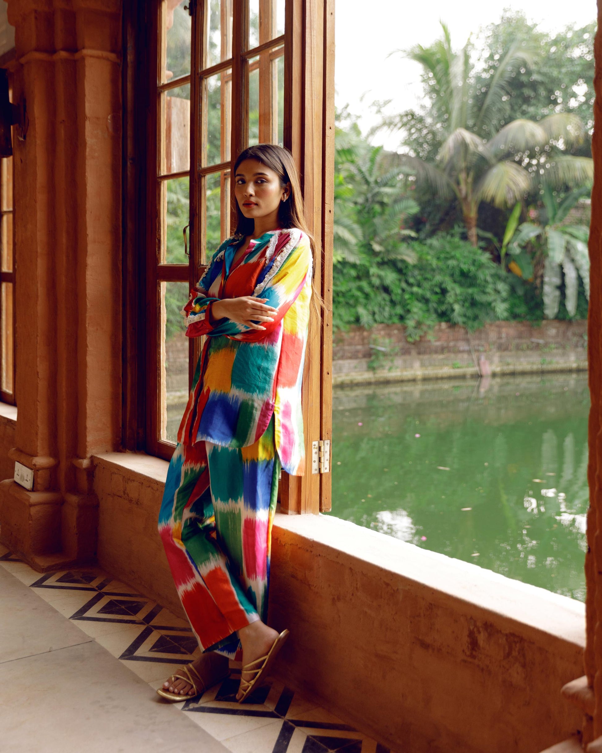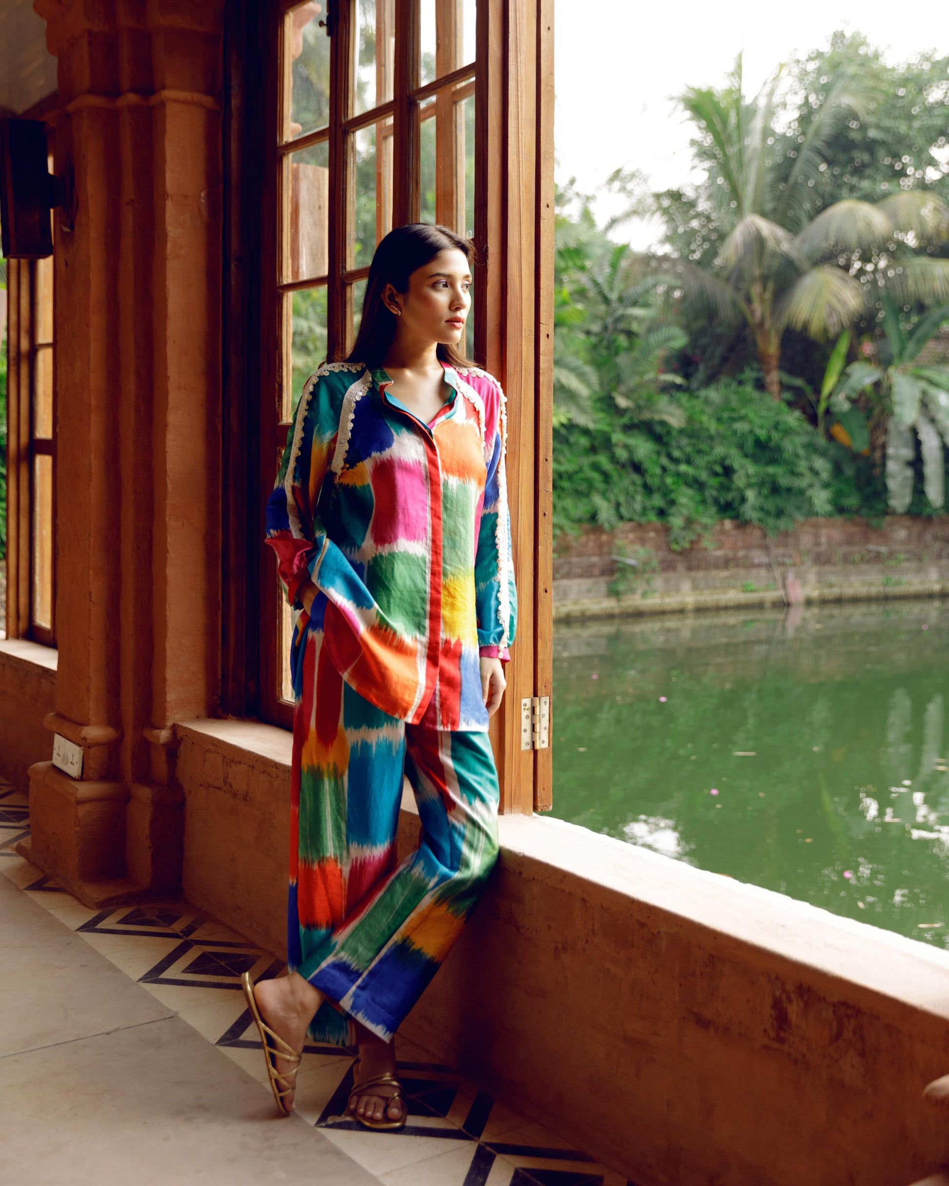 Multicolour brush stroke print, handwoven mulberry silk shirt with a woven shell trim edging along the shoulder and neckline. Paired with multicolour brush stroke print, handwoven mulberry silk trouser.