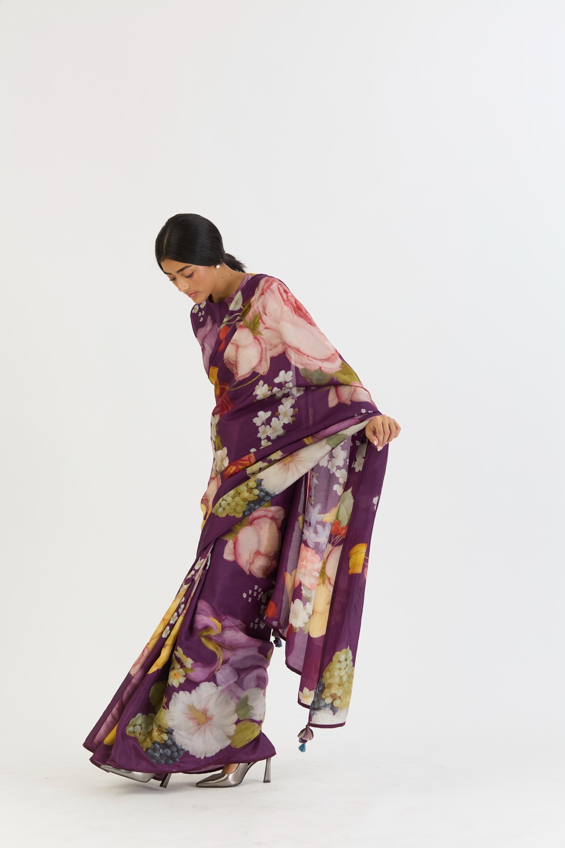 The saree is in pure silk and It is finished with a delicate satin piping in Aubergine all around with a tassel bunch on the Pallu.