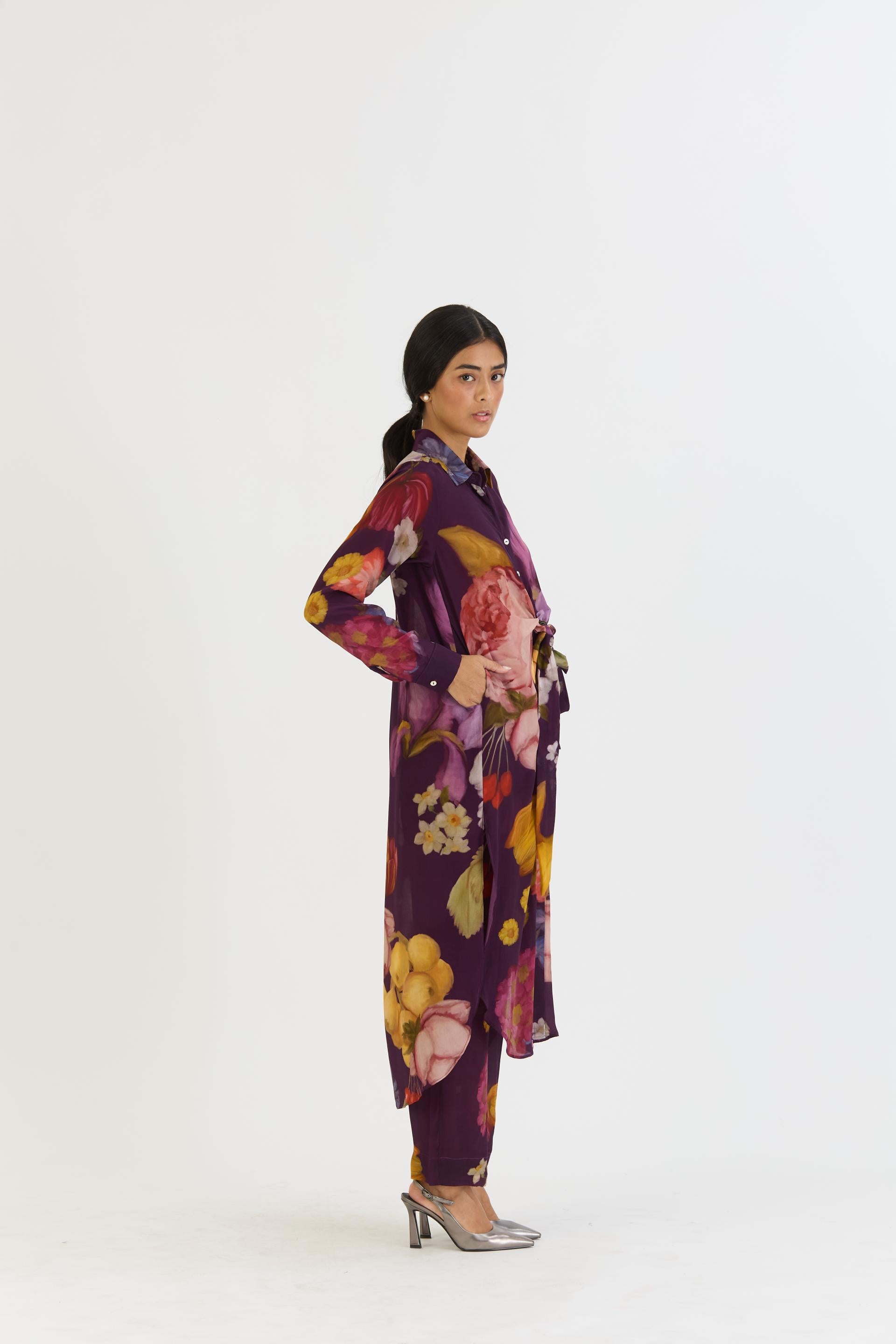 The shirt collar and button-down design of the kurta with a wrap detail exudes a classic aesthetic with a twist. The sleeves are straight with cuffs. Paired seamlessly with the kurta is a set of straight-fit pants which has side pockets , meticulously crafted from high-quality crepe fabric for a luxurious feel and comfortable wear.