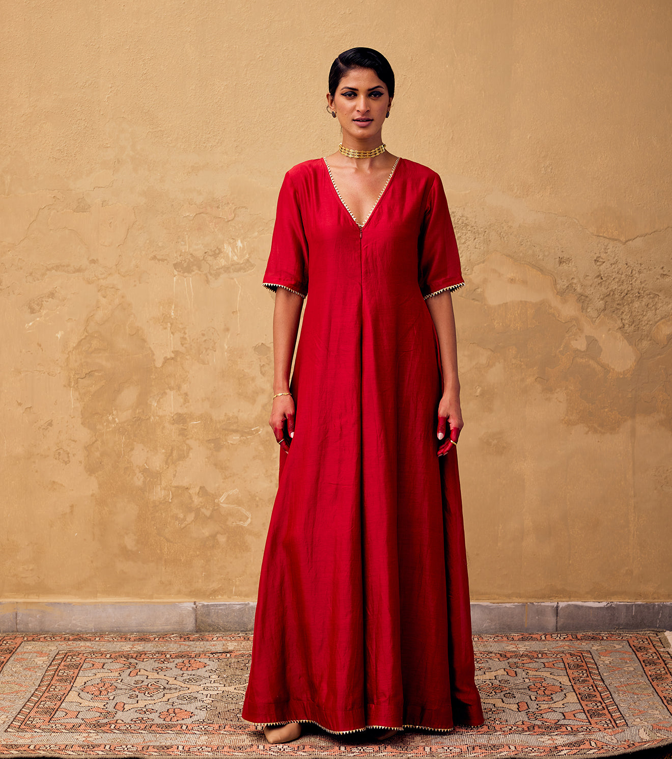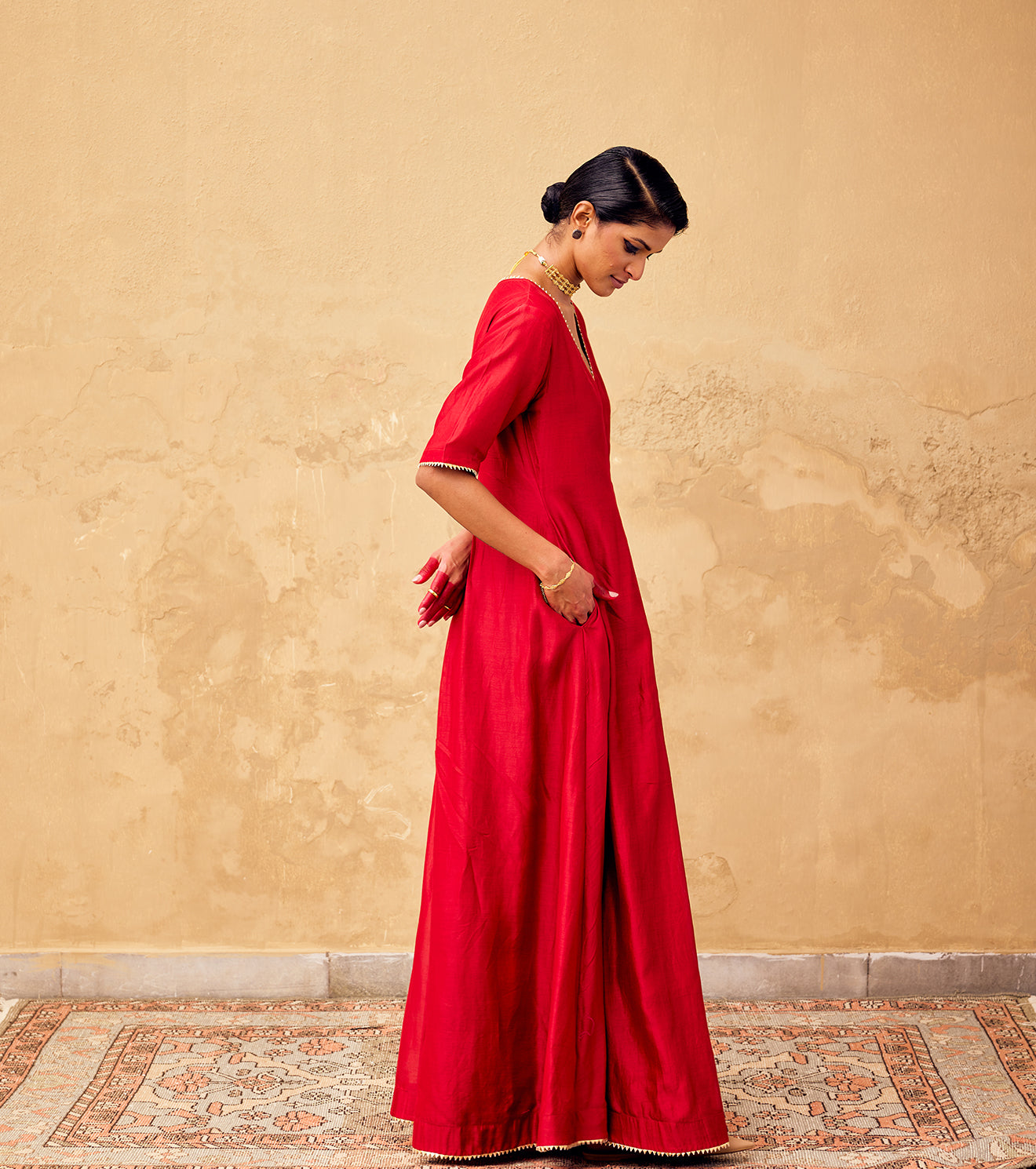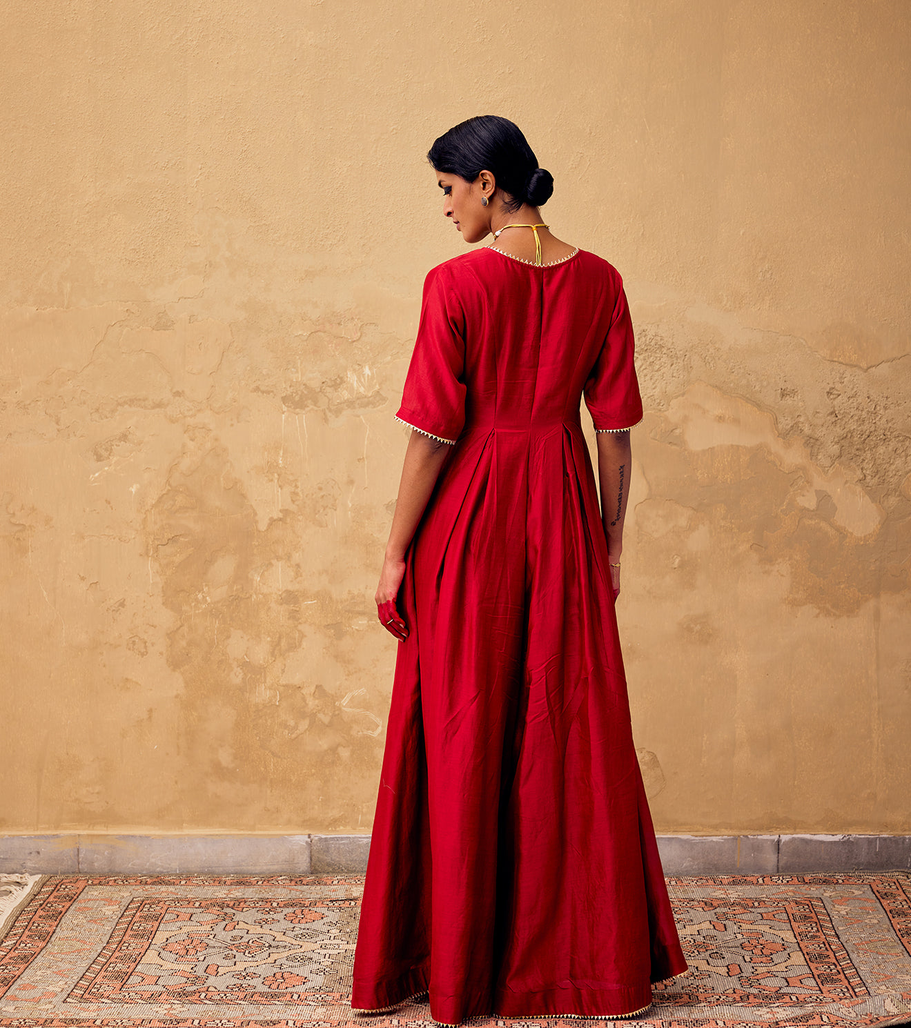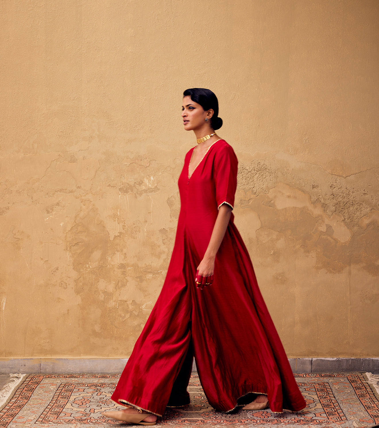 A rich Chanderi silk red jumpsuit with bijiya gota detailing in the neckline and hemline and sleeves, with front zipper opening, crafted in chanderi fabric.