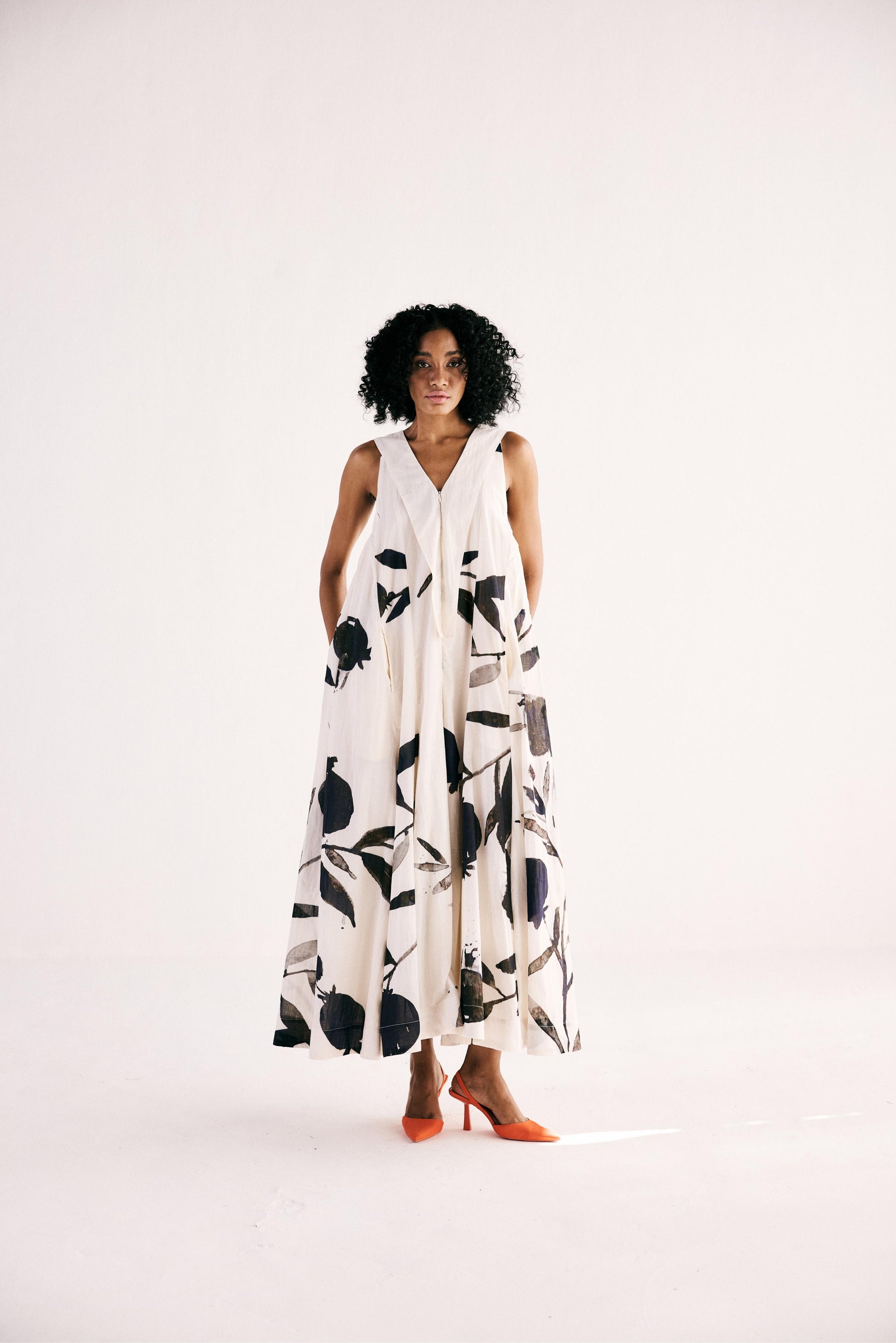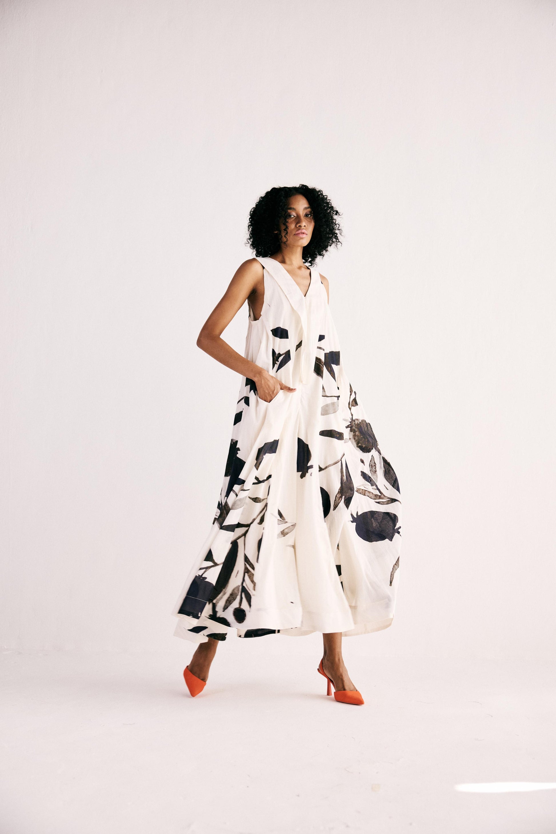 A classic off white floral art printed jumpsuit with a front zip opening, V neckline and side pleats crafted in soft cotton mul