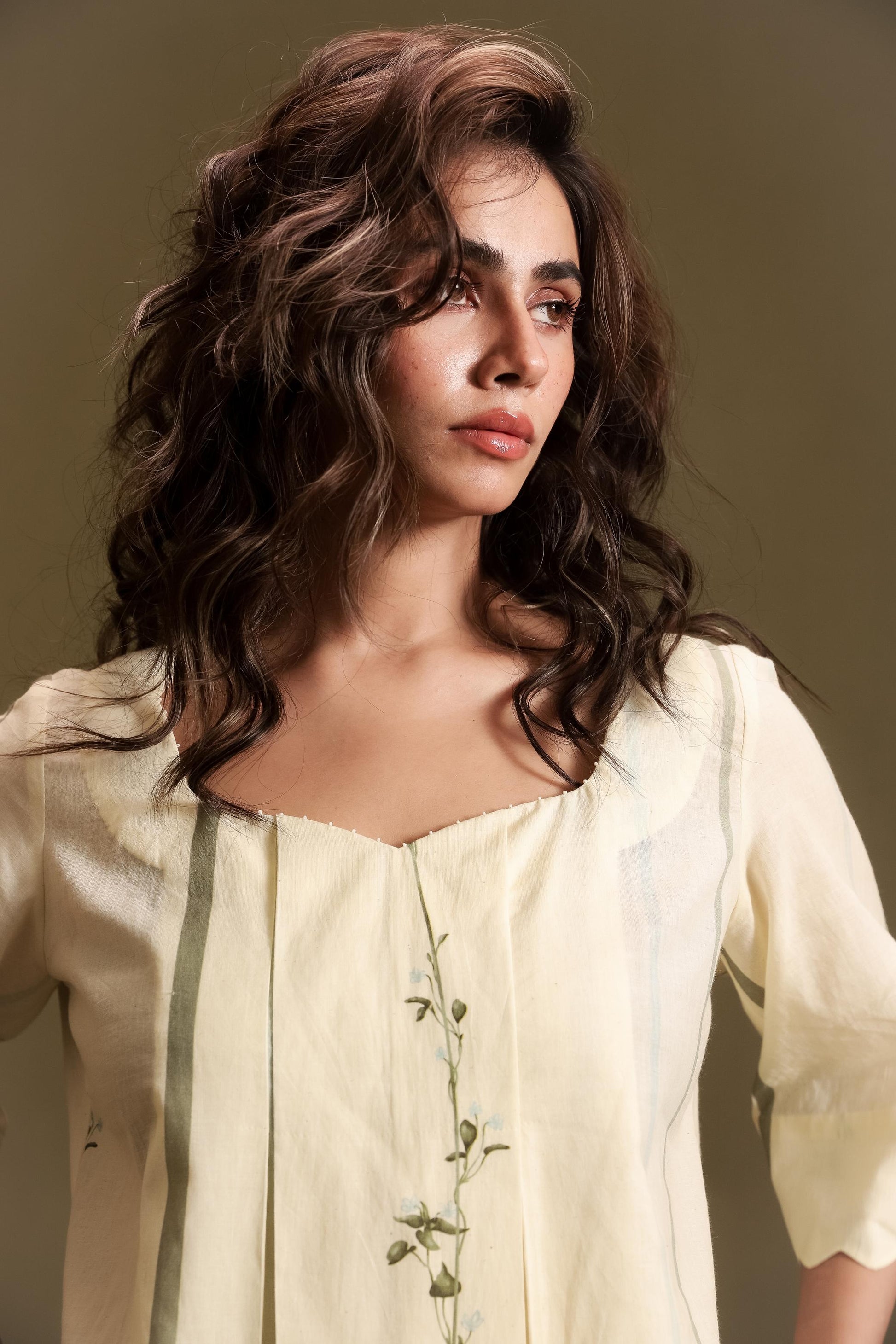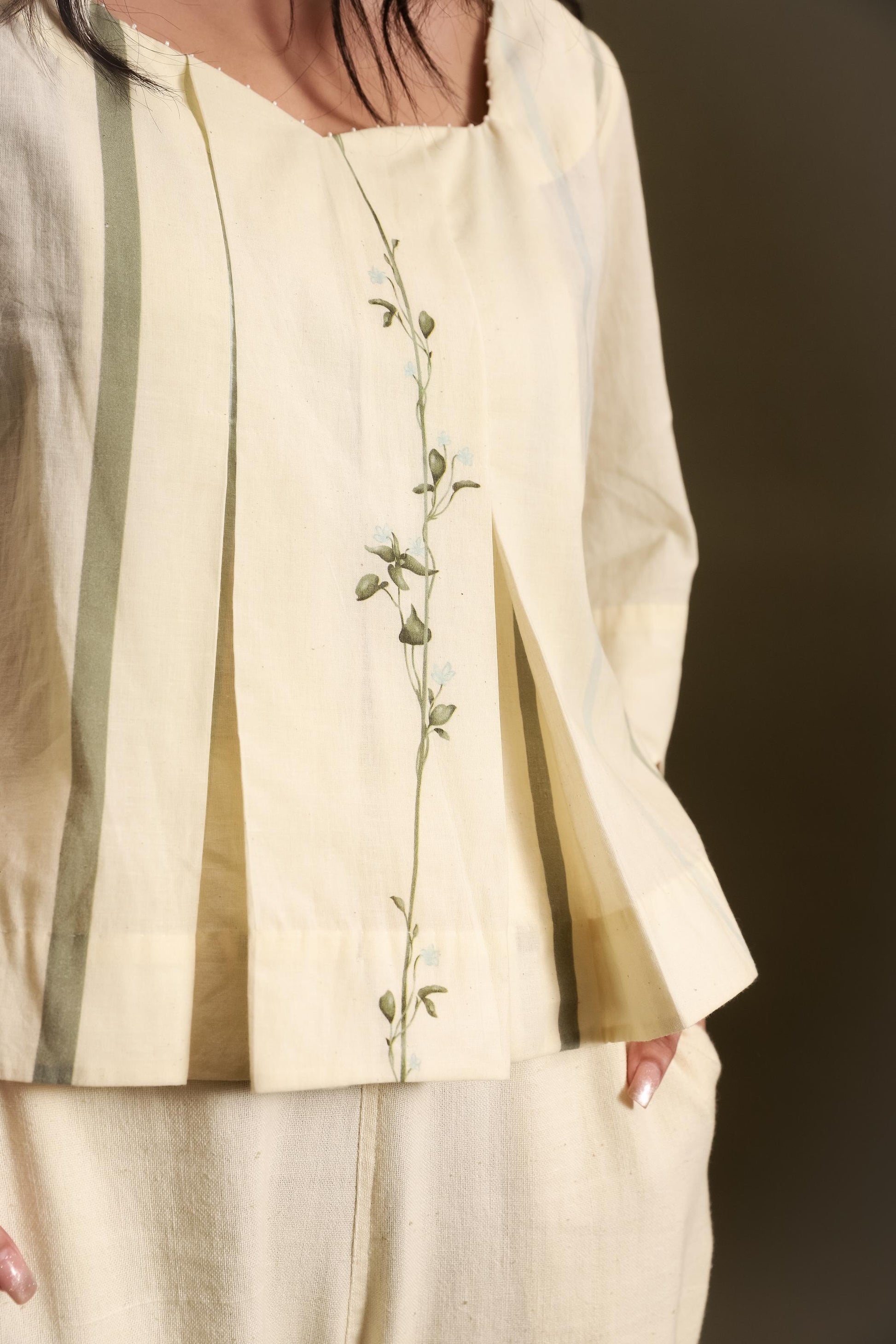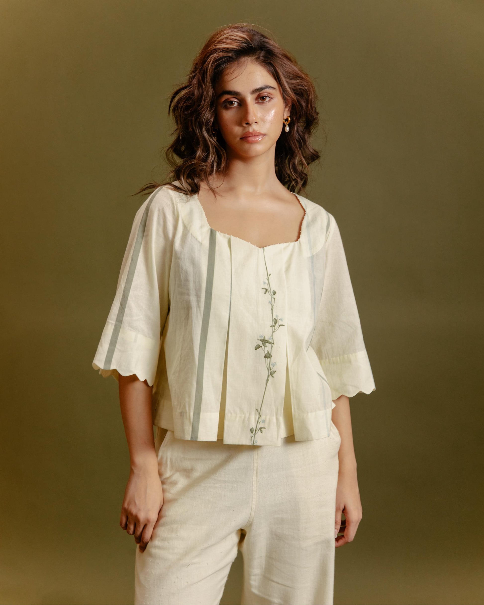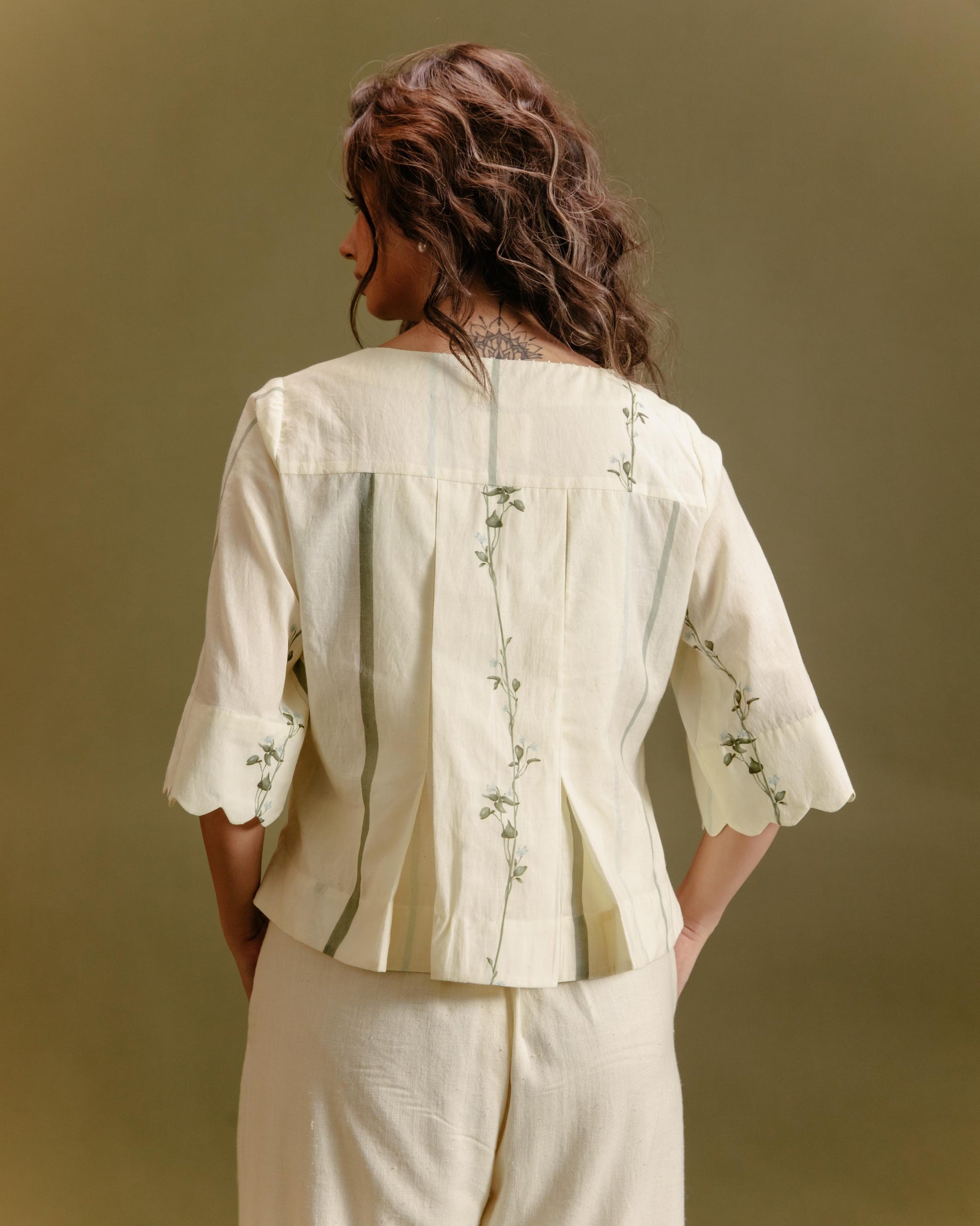 Printed pleated top with scallop elbow length sleeves and embroidered neckline