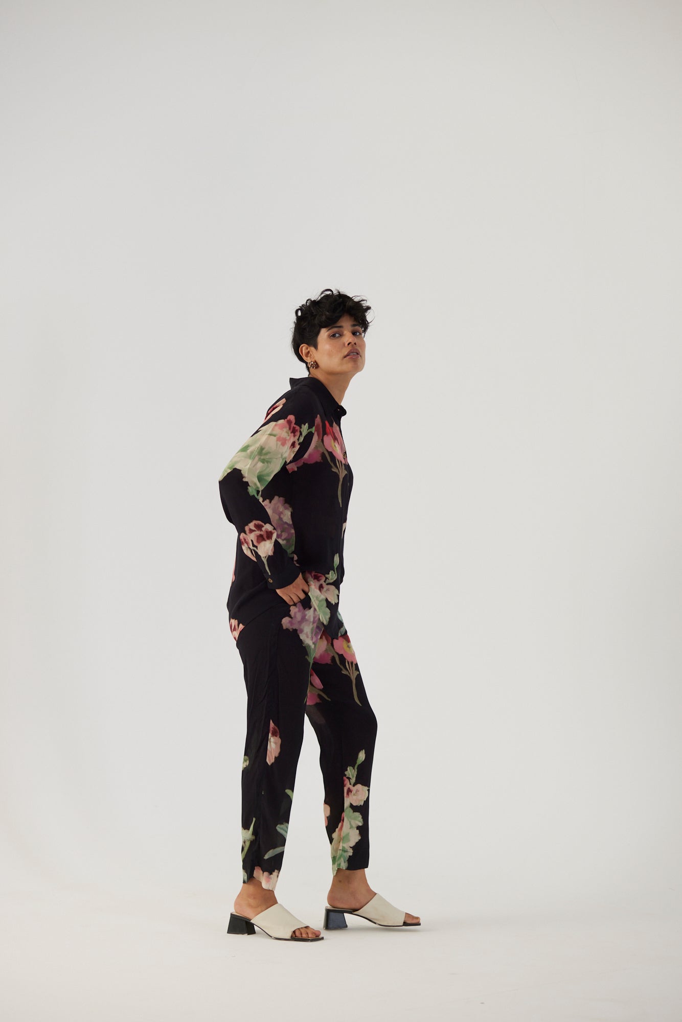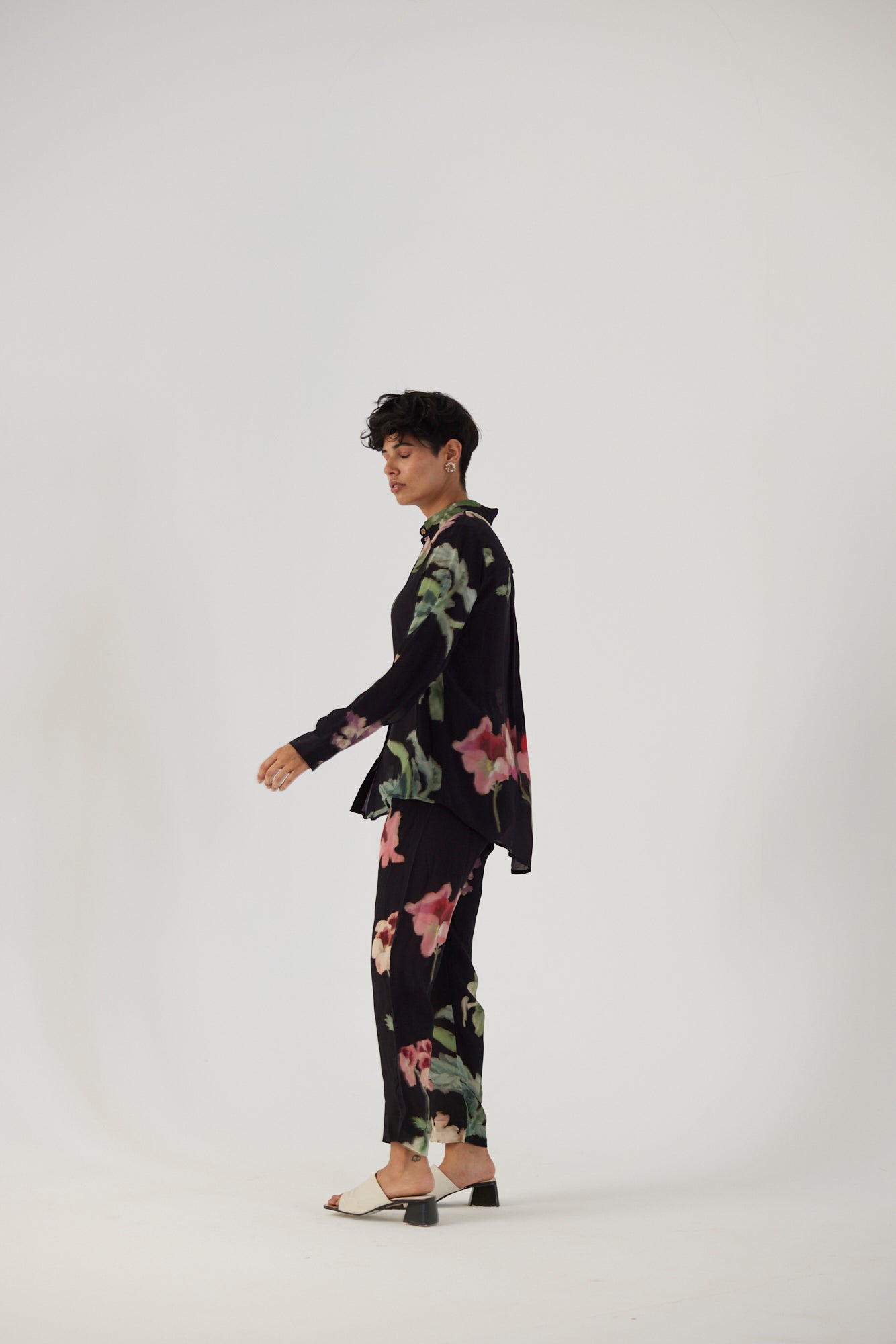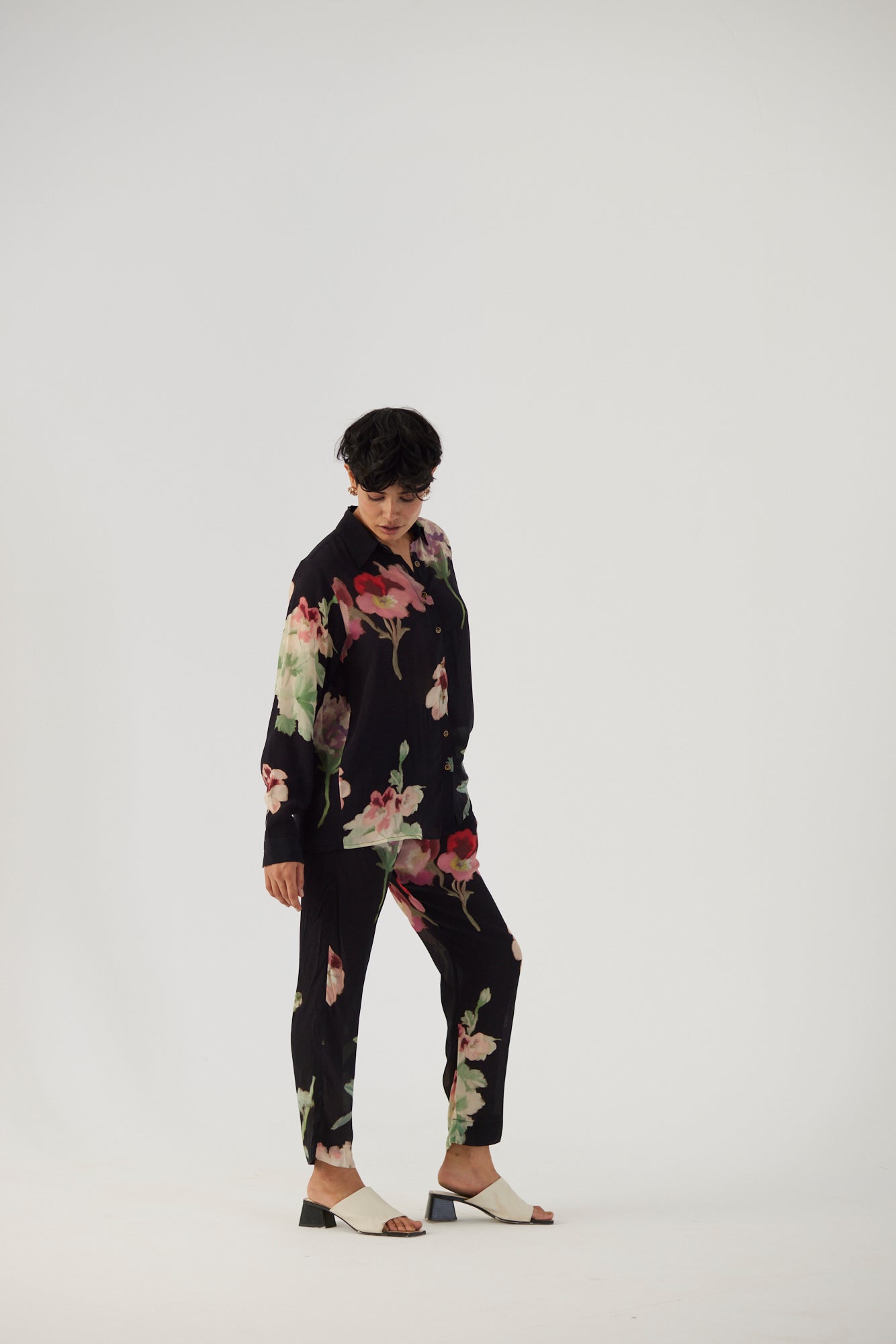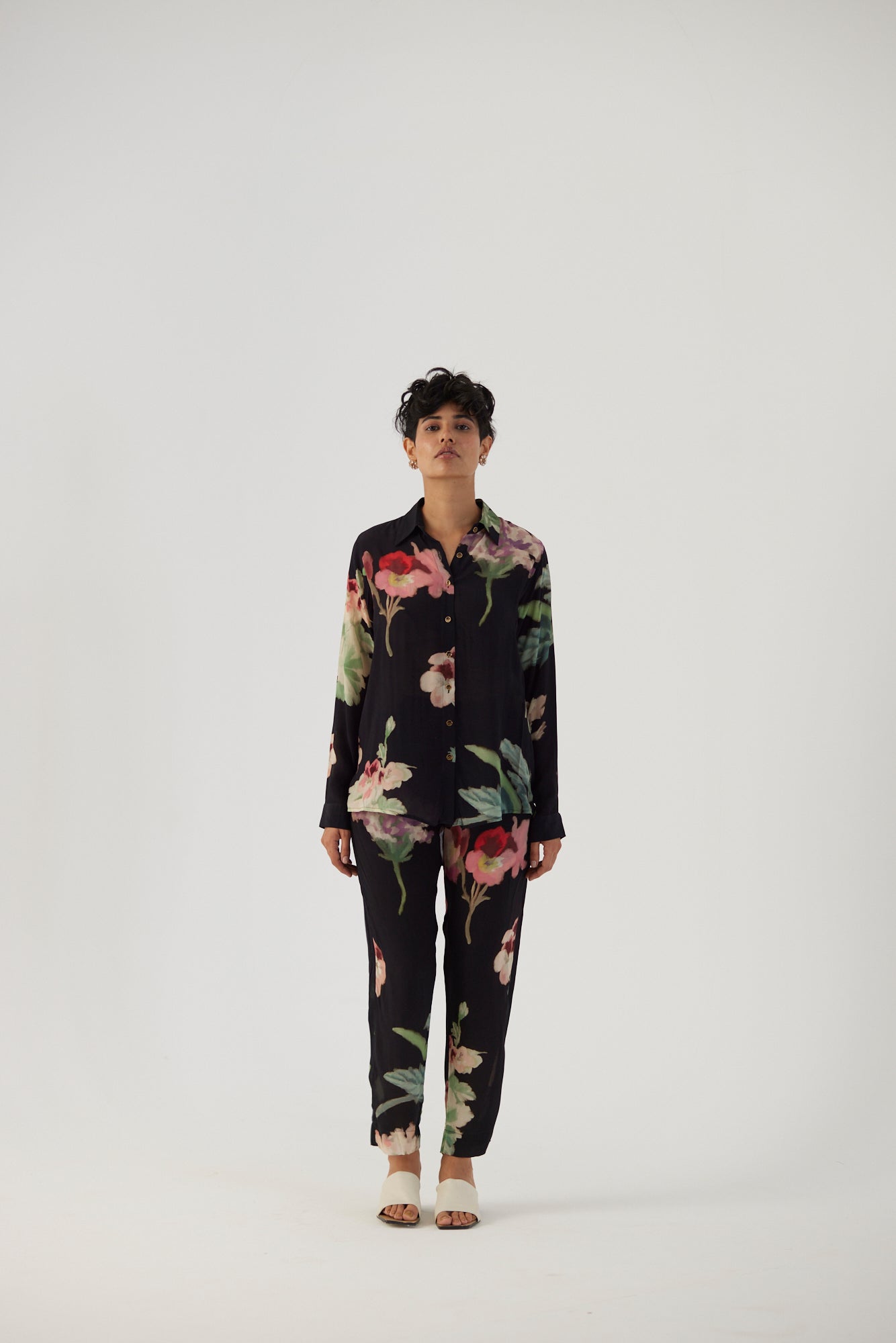 The print features hand drawn botanical motifs in a black base. This set is crafted in the Juliet print carefully printed on crepe featuring a set of shirt and pants.