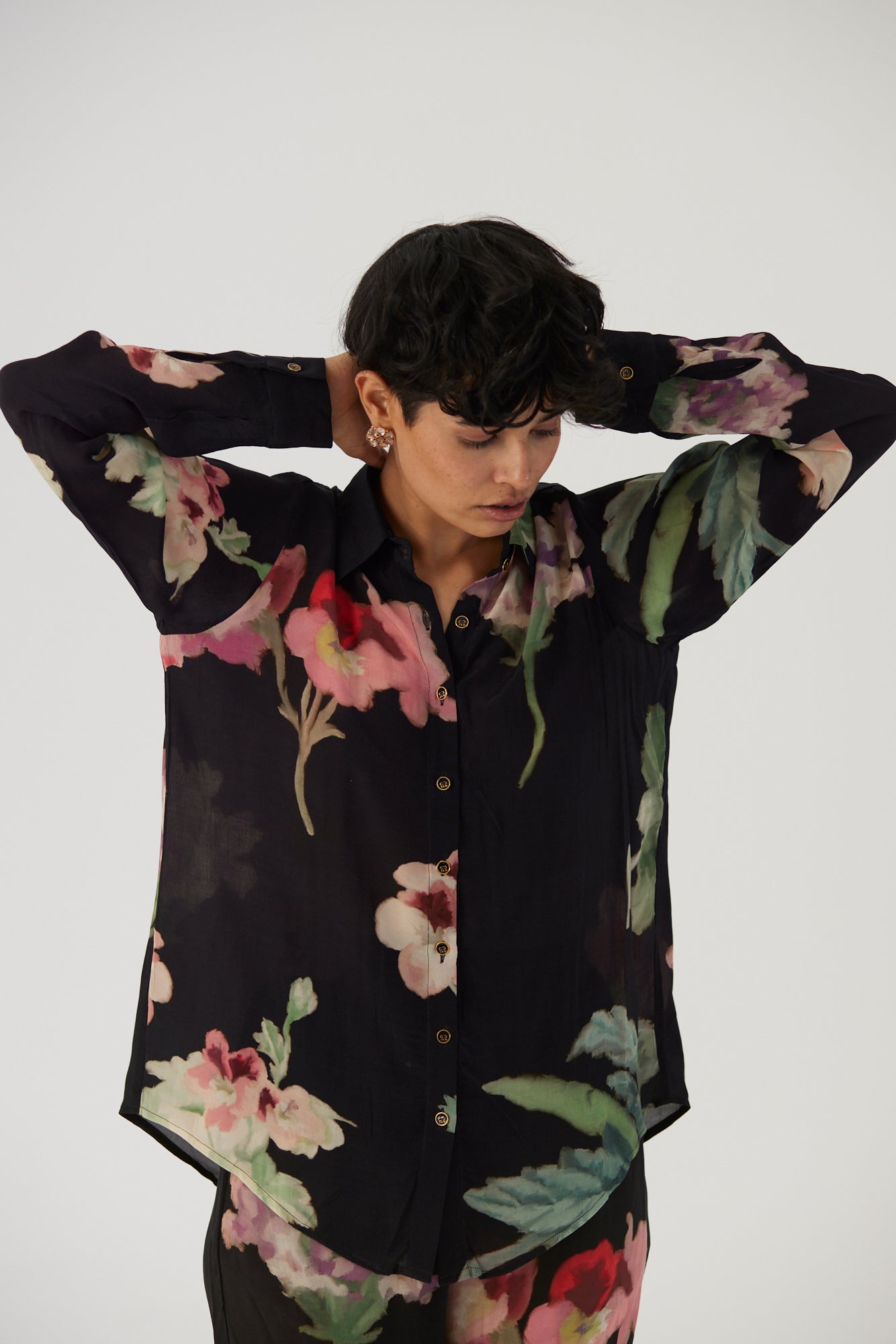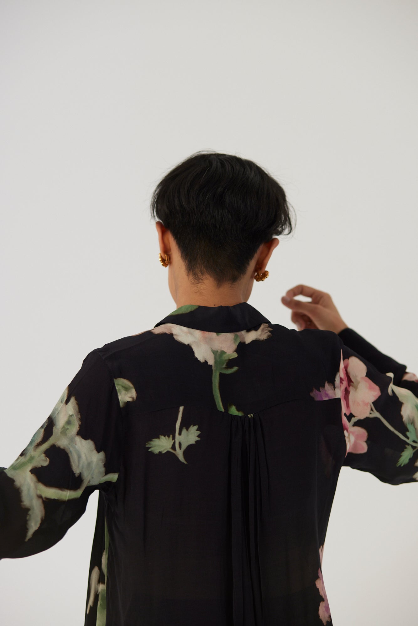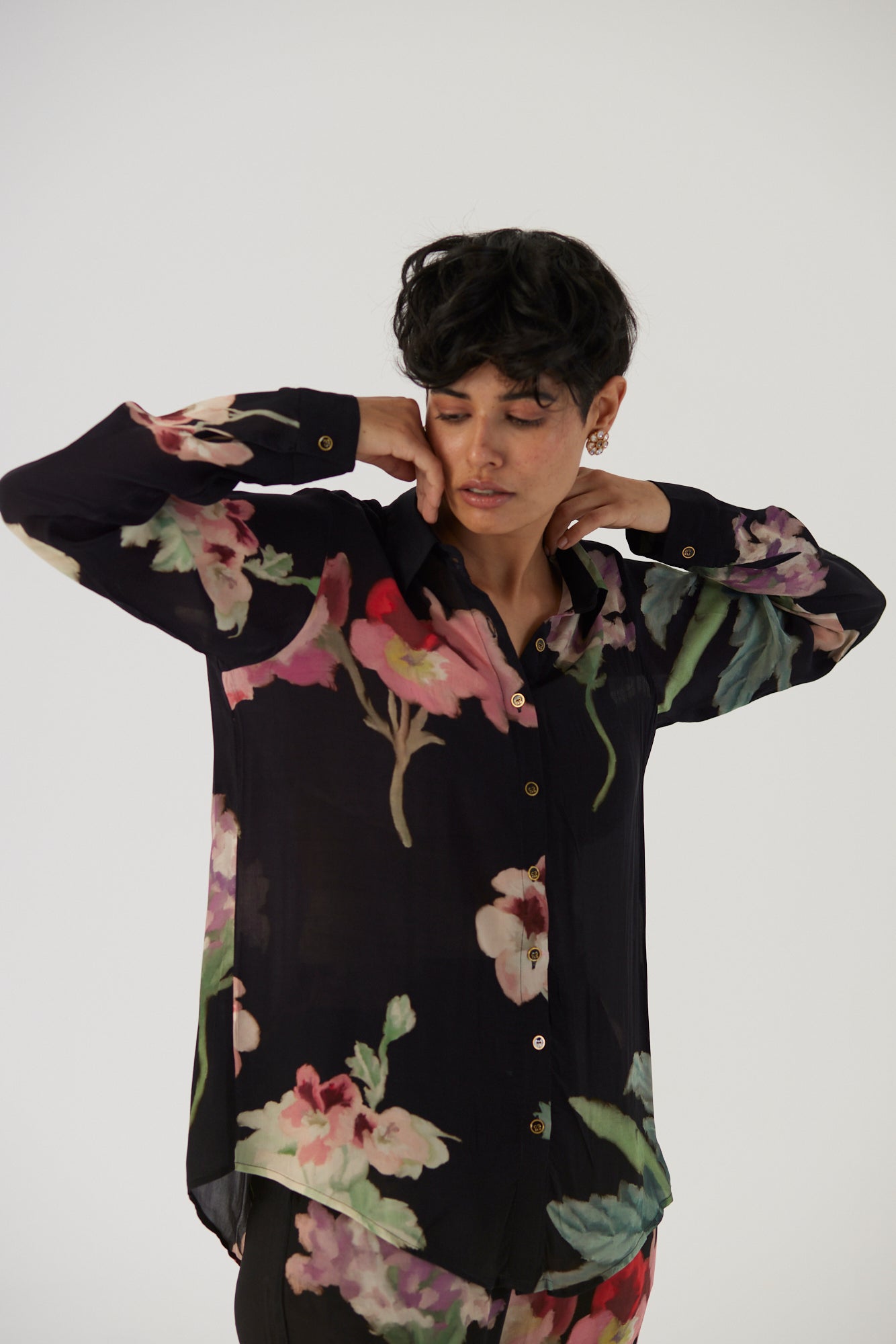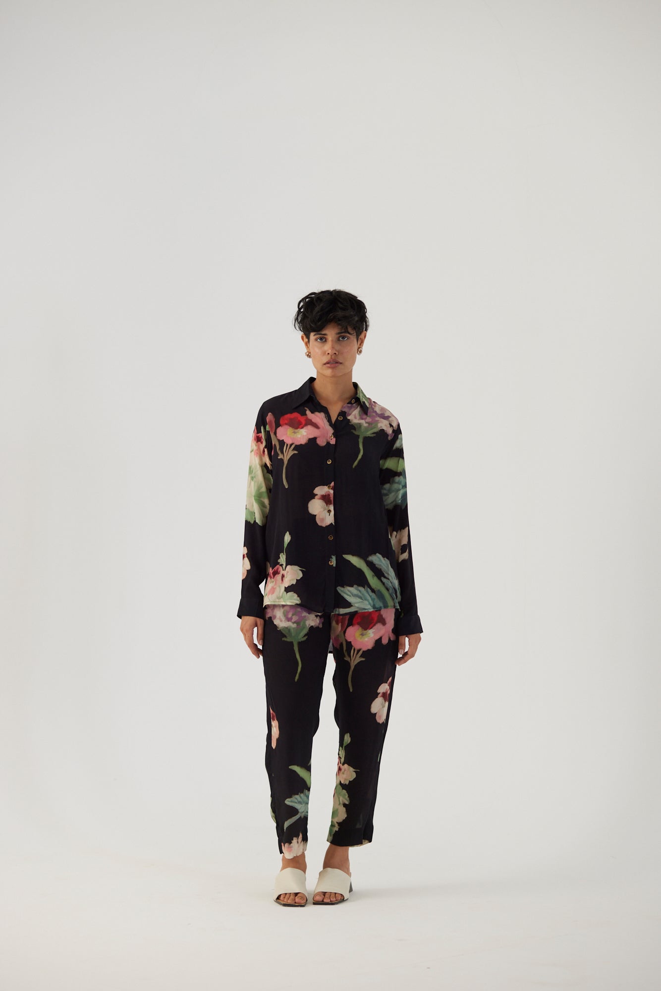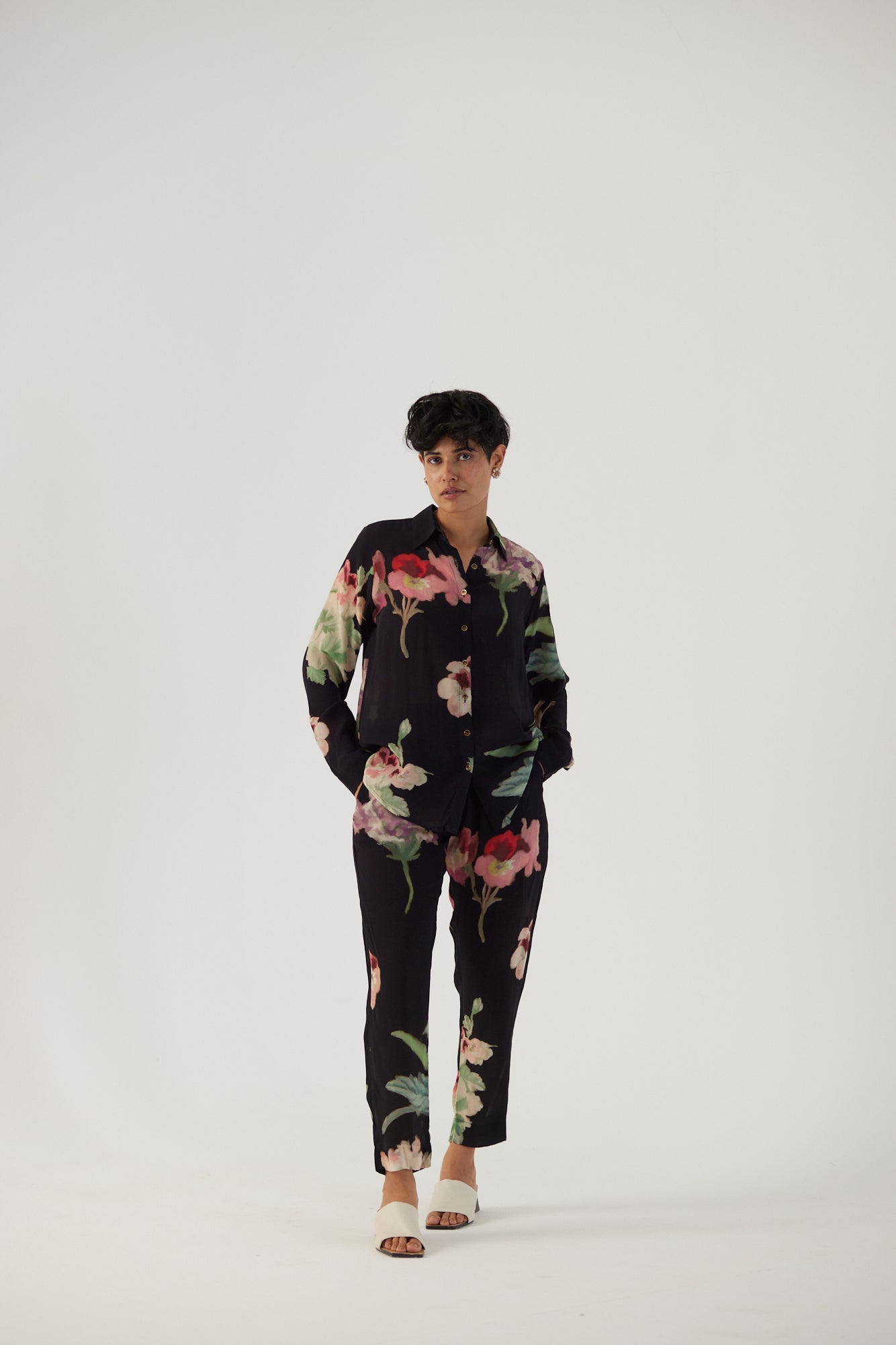 The print features hand drawn botanical motifs in a black base. This set is crafted in the Juliet print carefully printed on crepe featuring a set of shirt and pants.