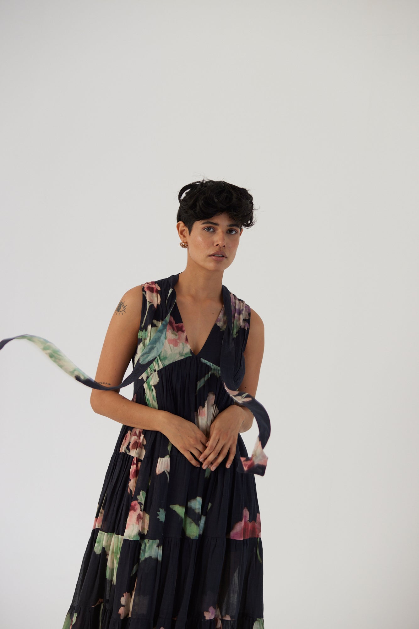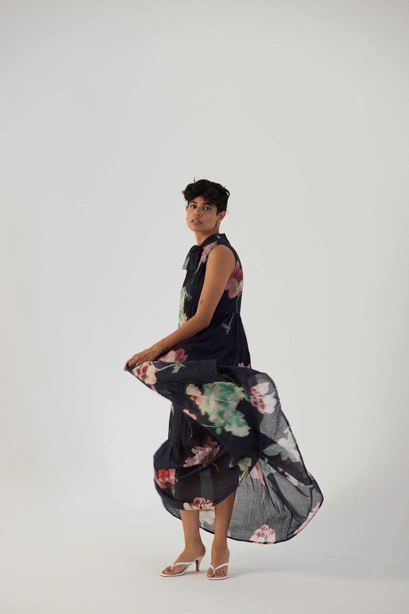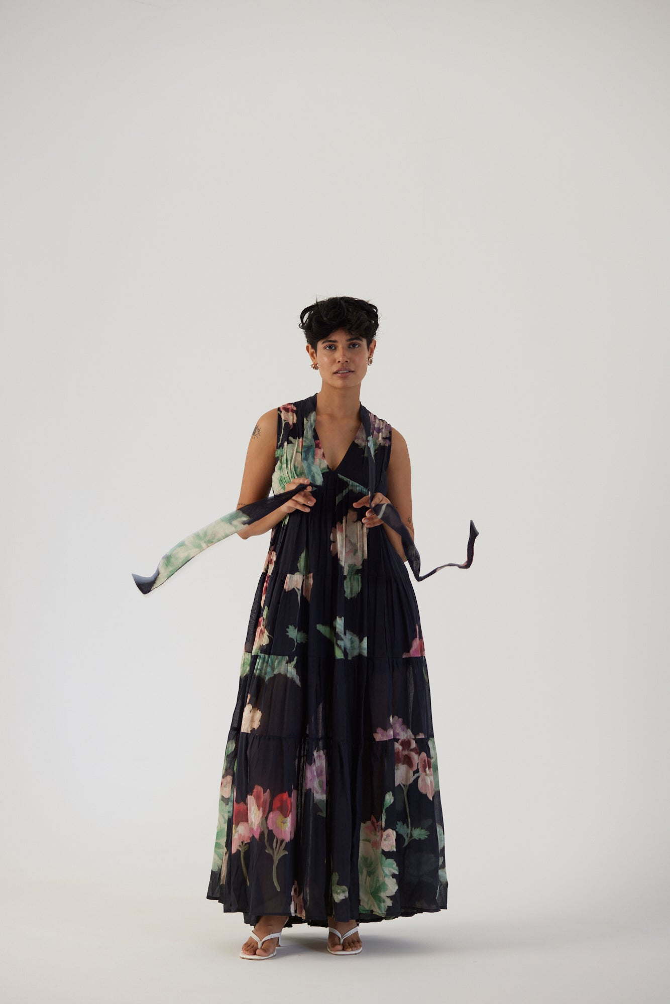 The print features hand drawn botanical motifs in a black base. This set is crafted in the Juliet print carefully printed on cotton featuring a long length tier dress.