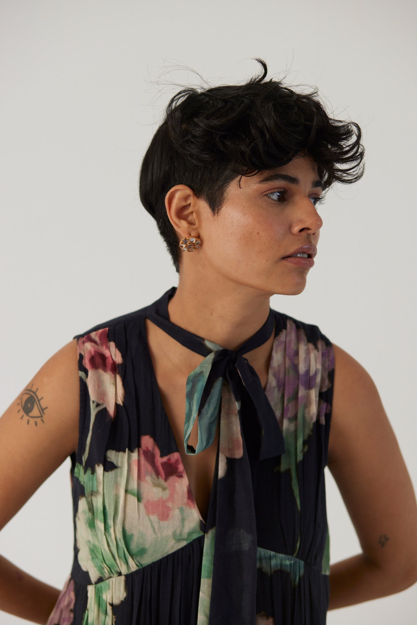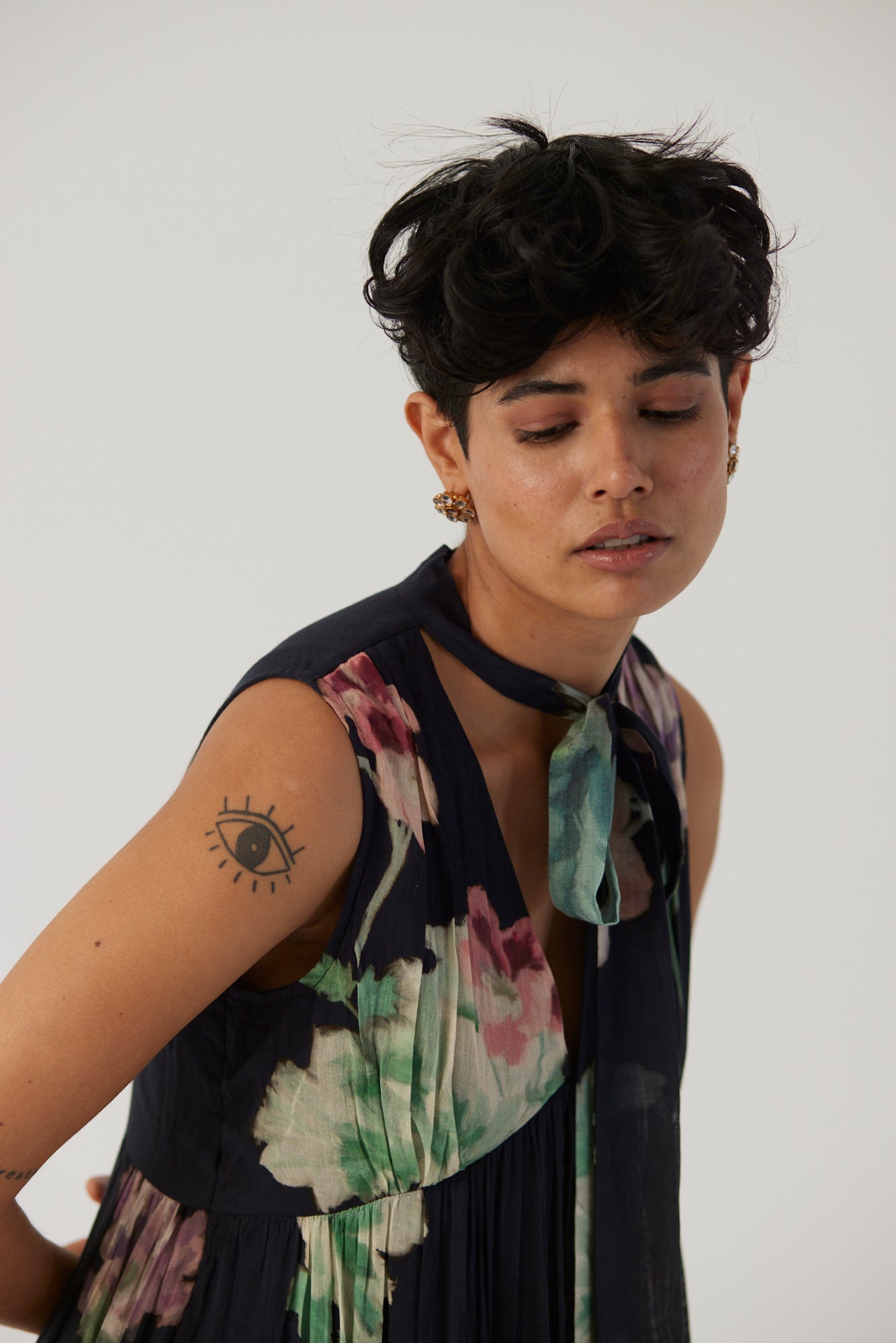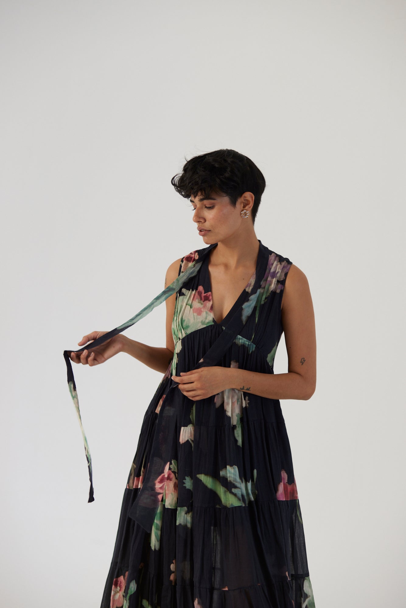 The print features hand drawn botanical motifs in a black base. This set is crafted in the Juliet print carefully printed on cotton featuring a long length tier dress.