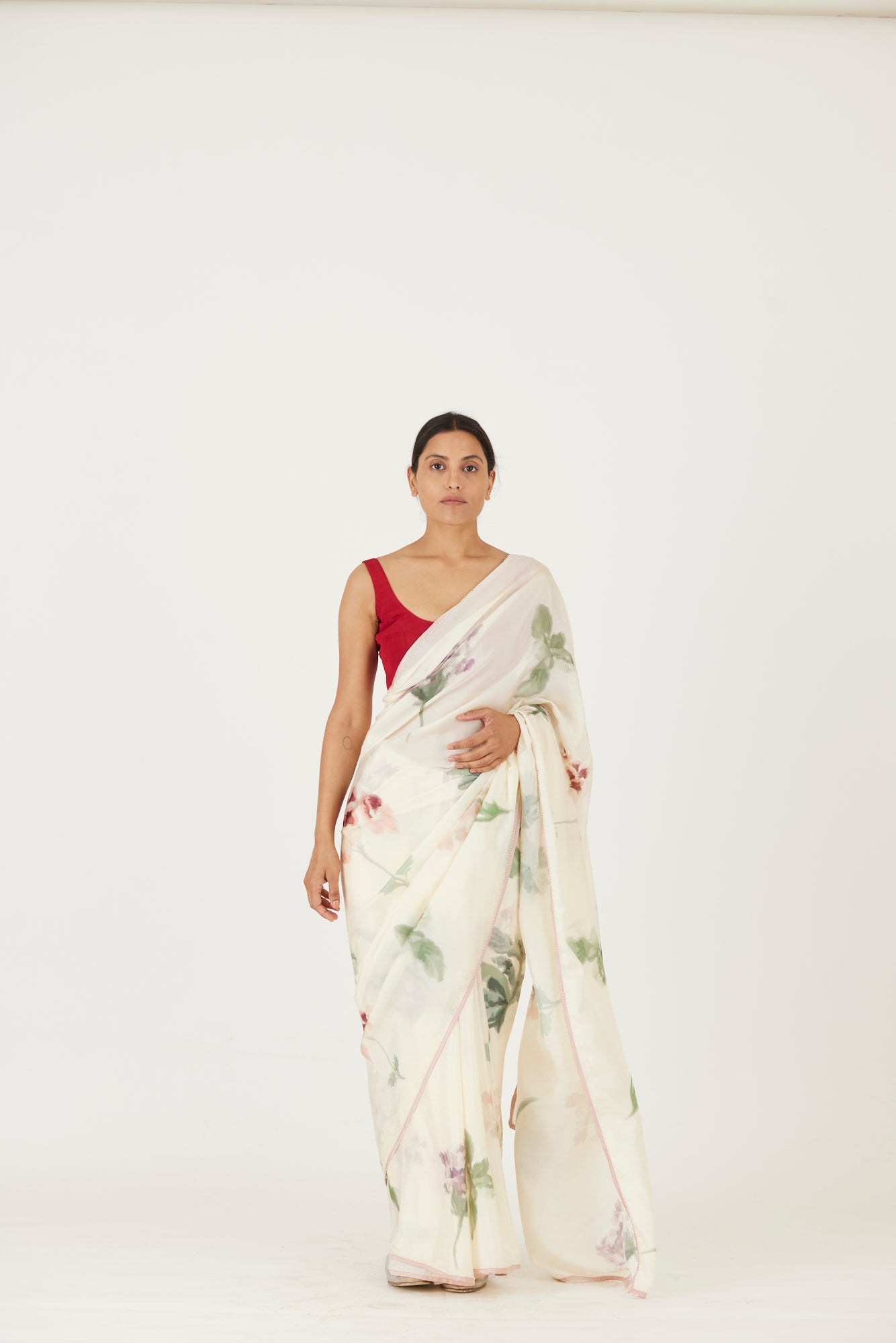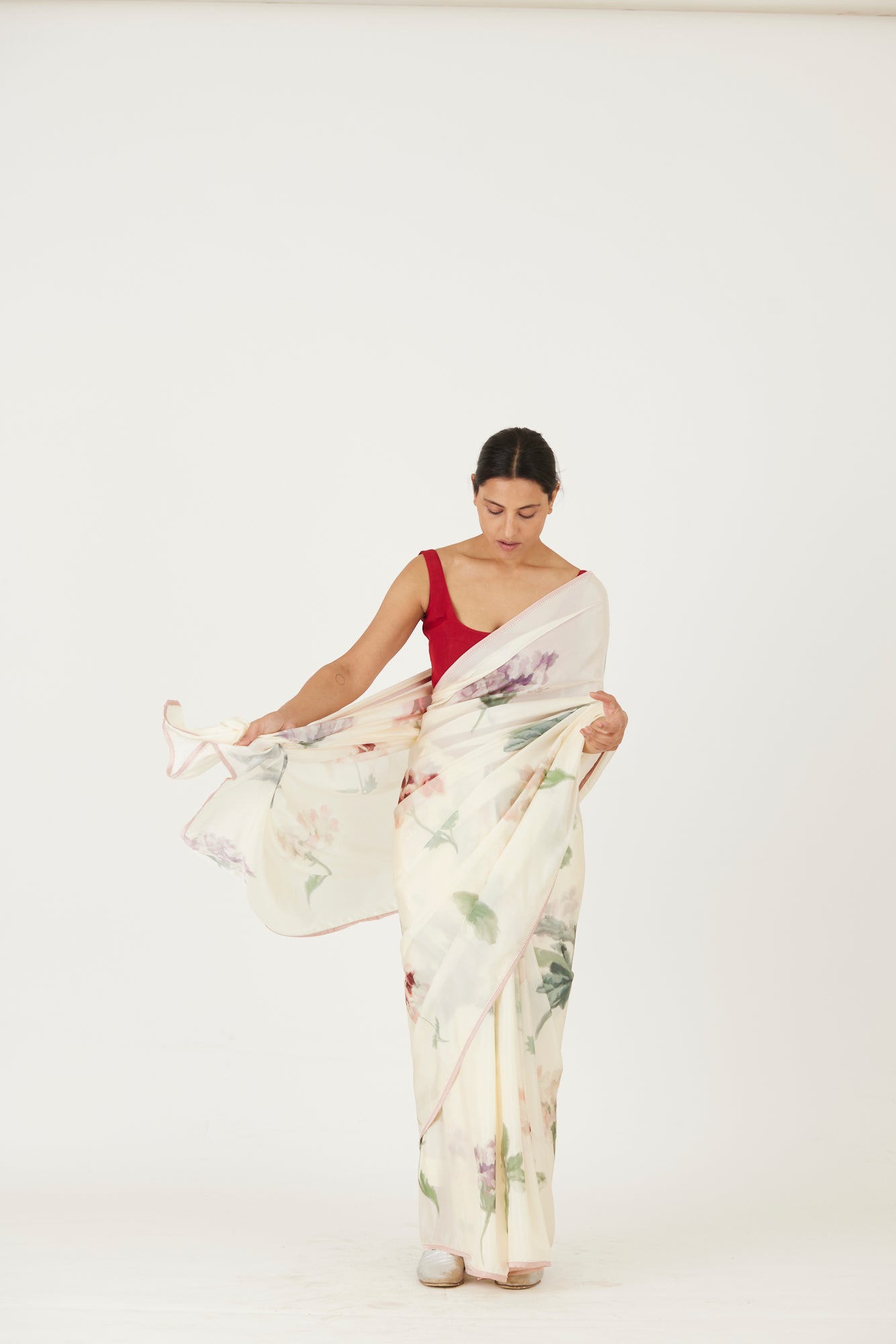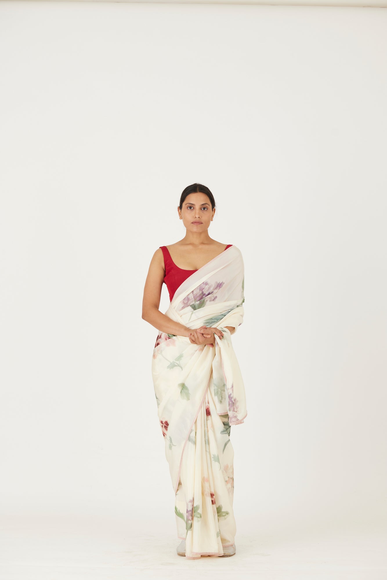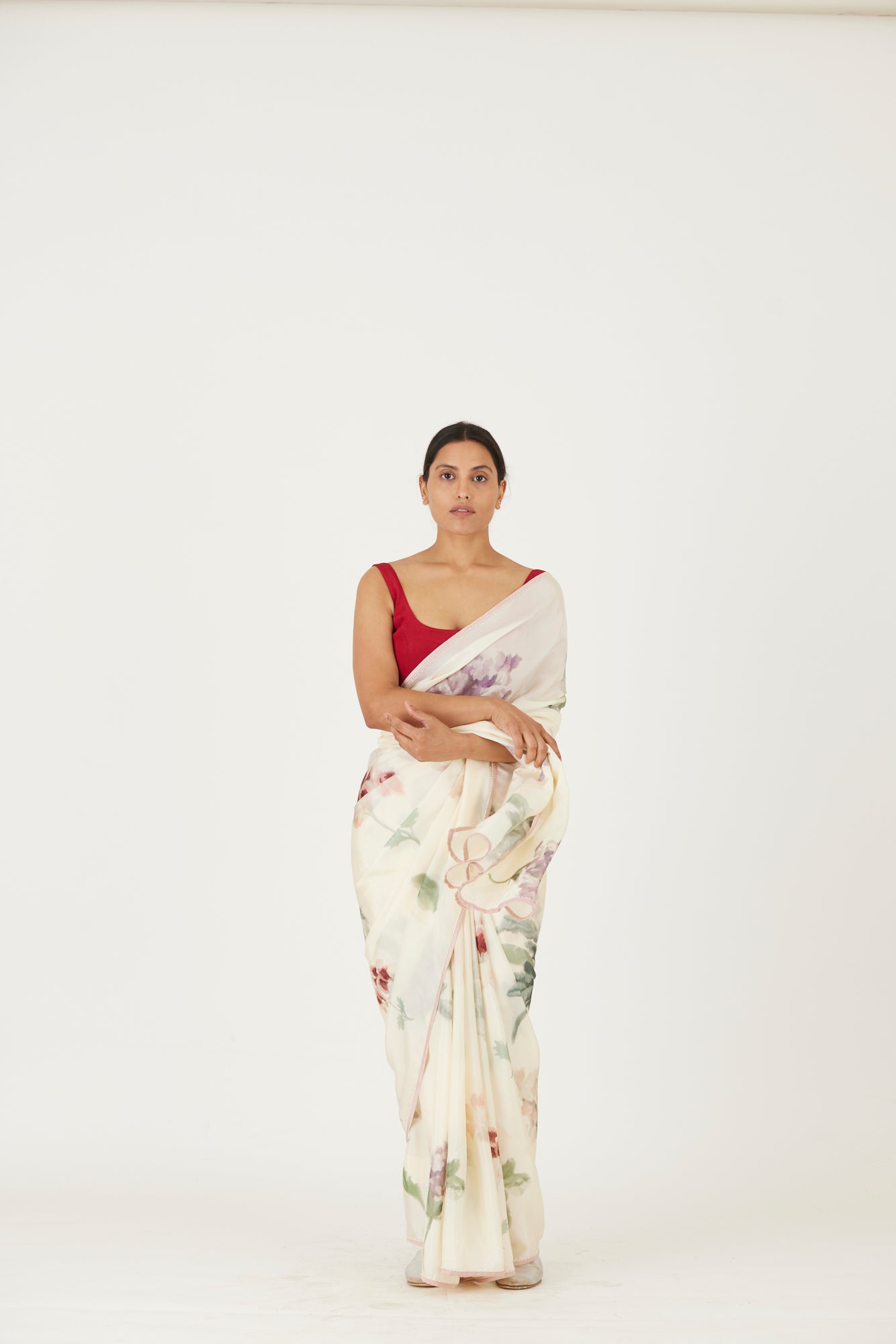 The saree is in pure silk and is finished with blush piping and pearls on the edges.