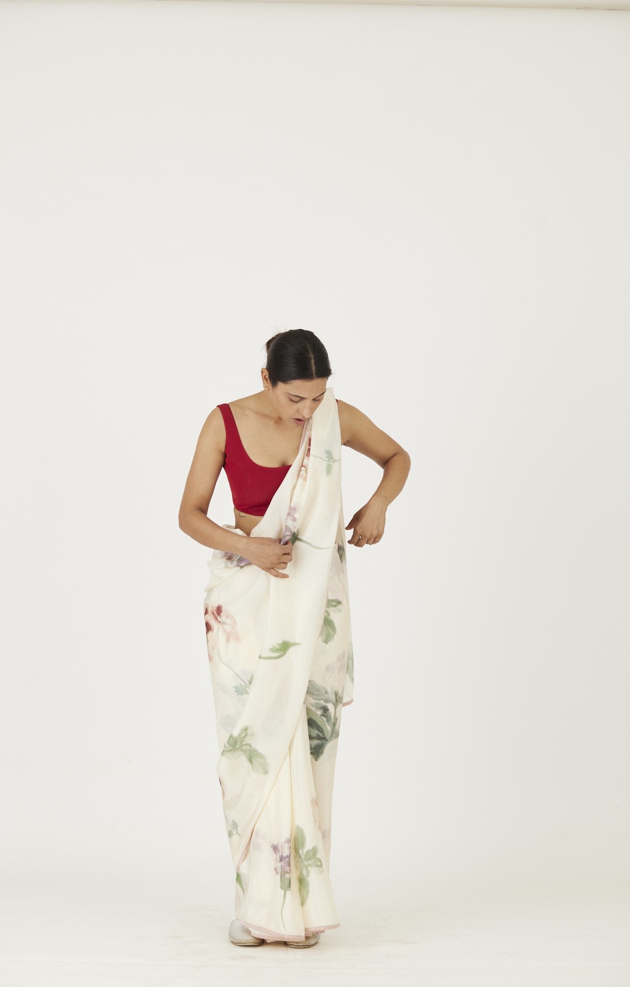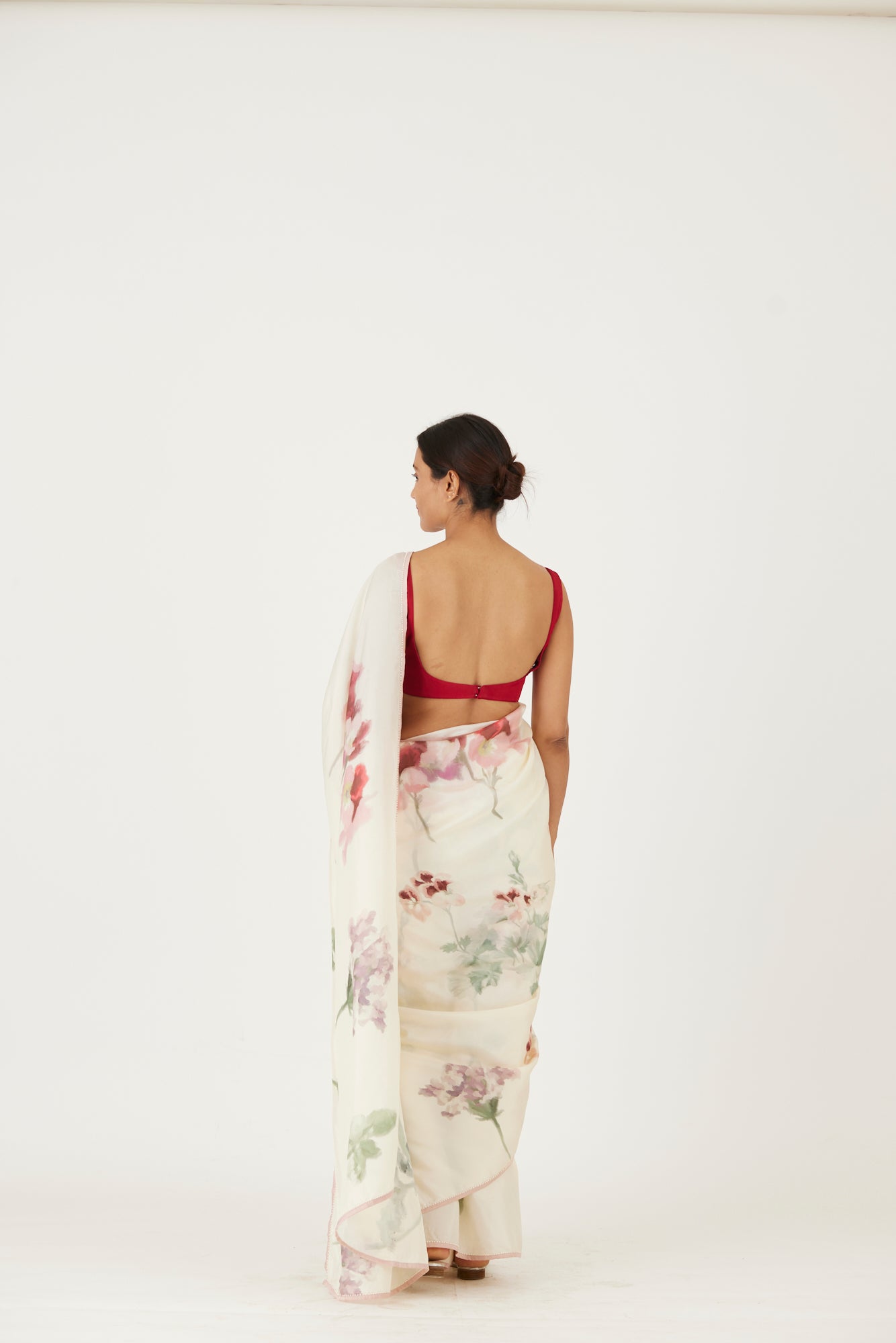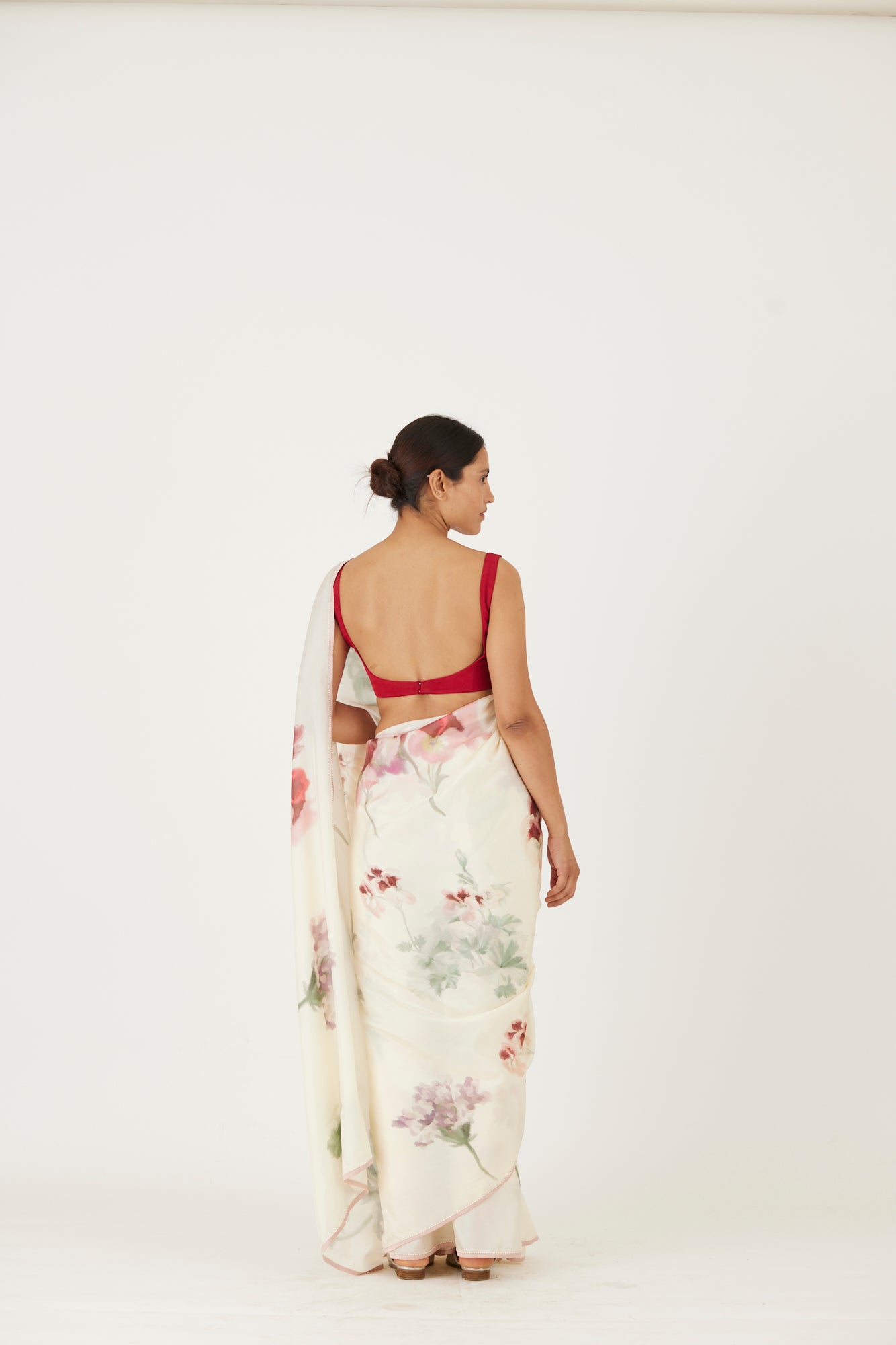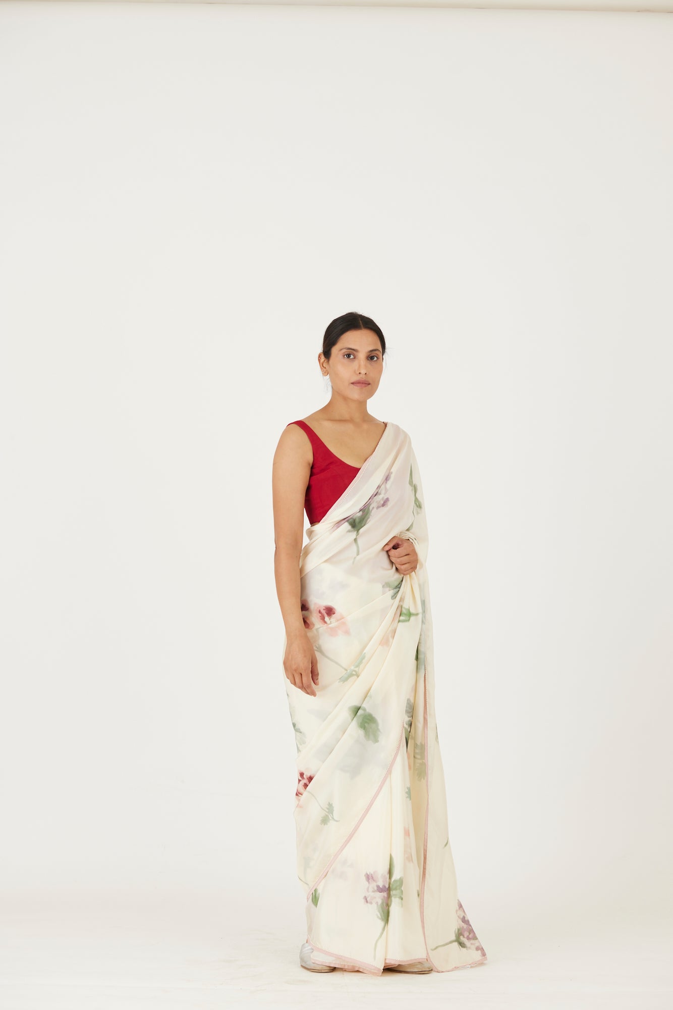 The saree is in pure silk and is finished with blush piping and pearls on the edges.