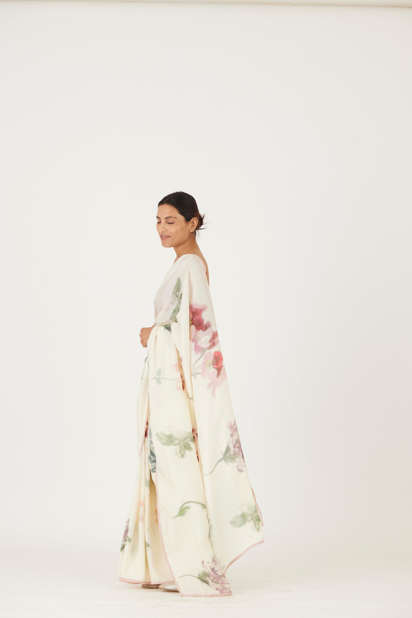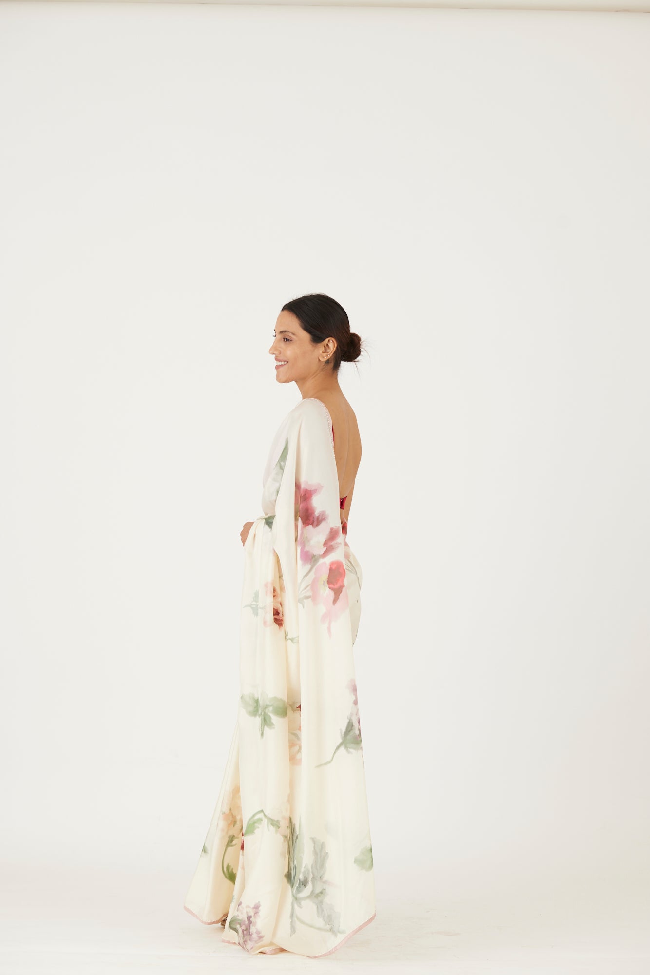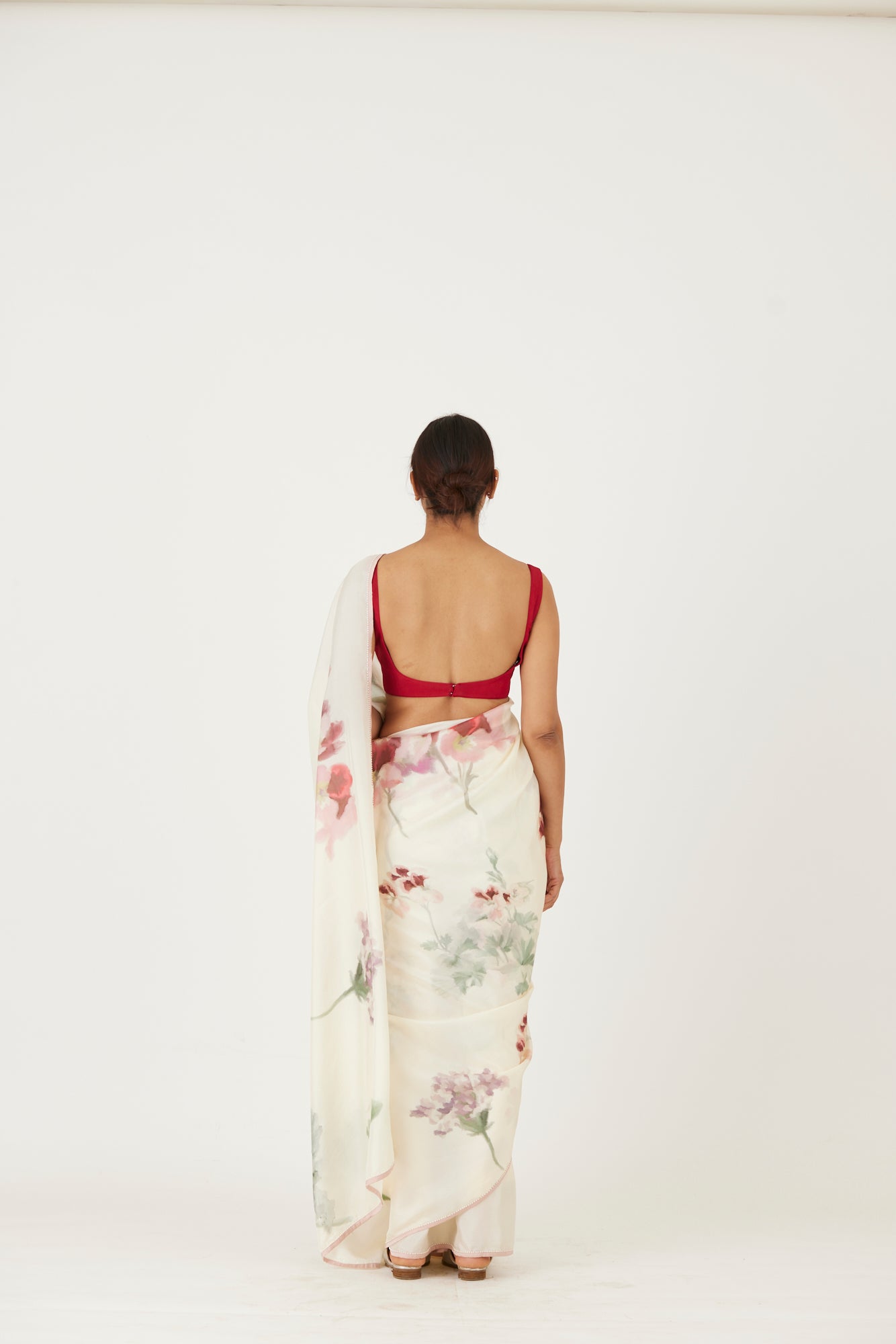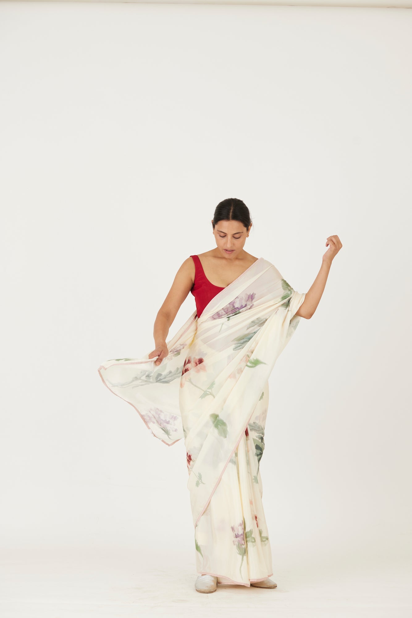 The saree is in pure silk and is finished with blush piping and pearls on the edges.