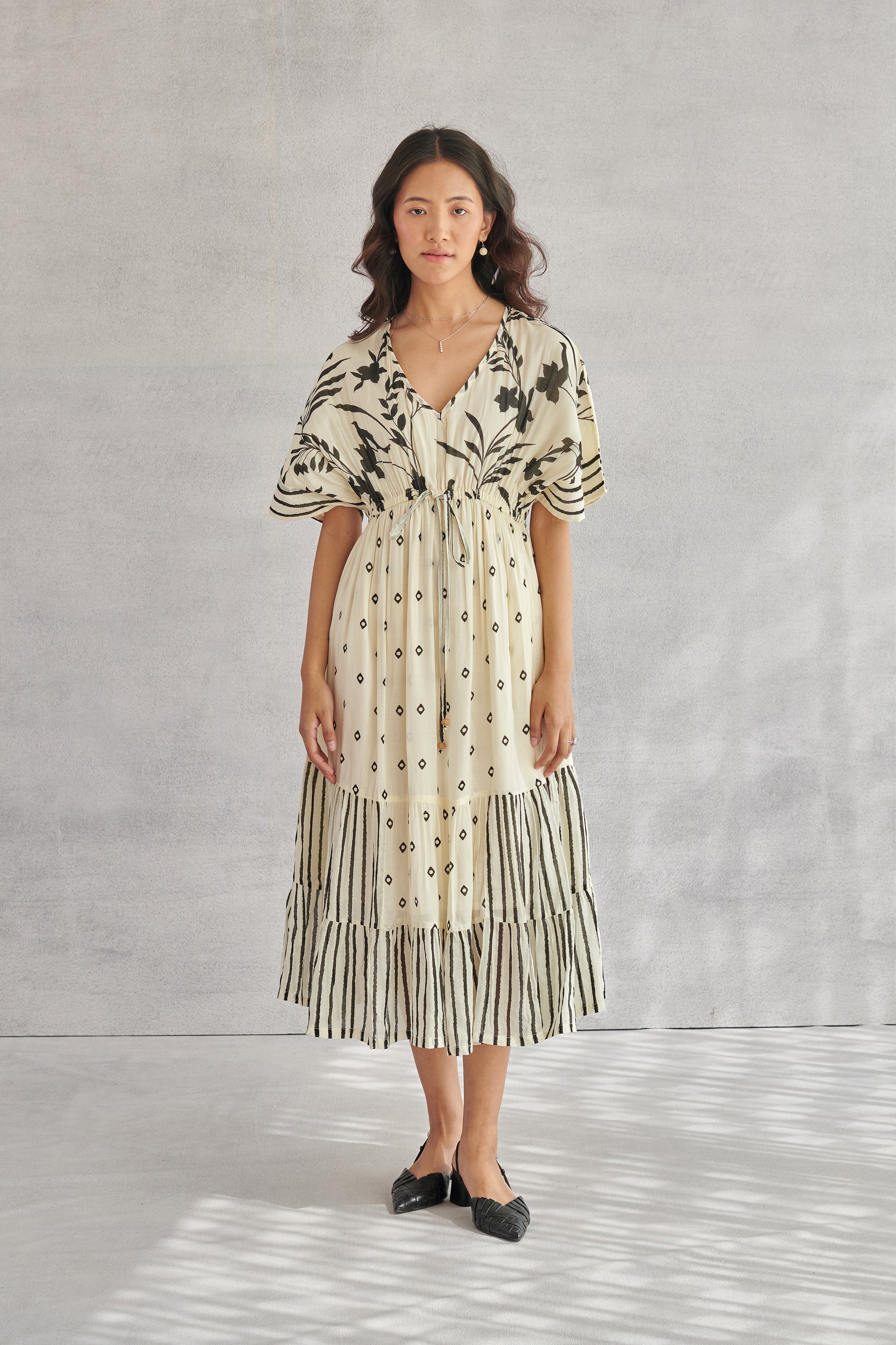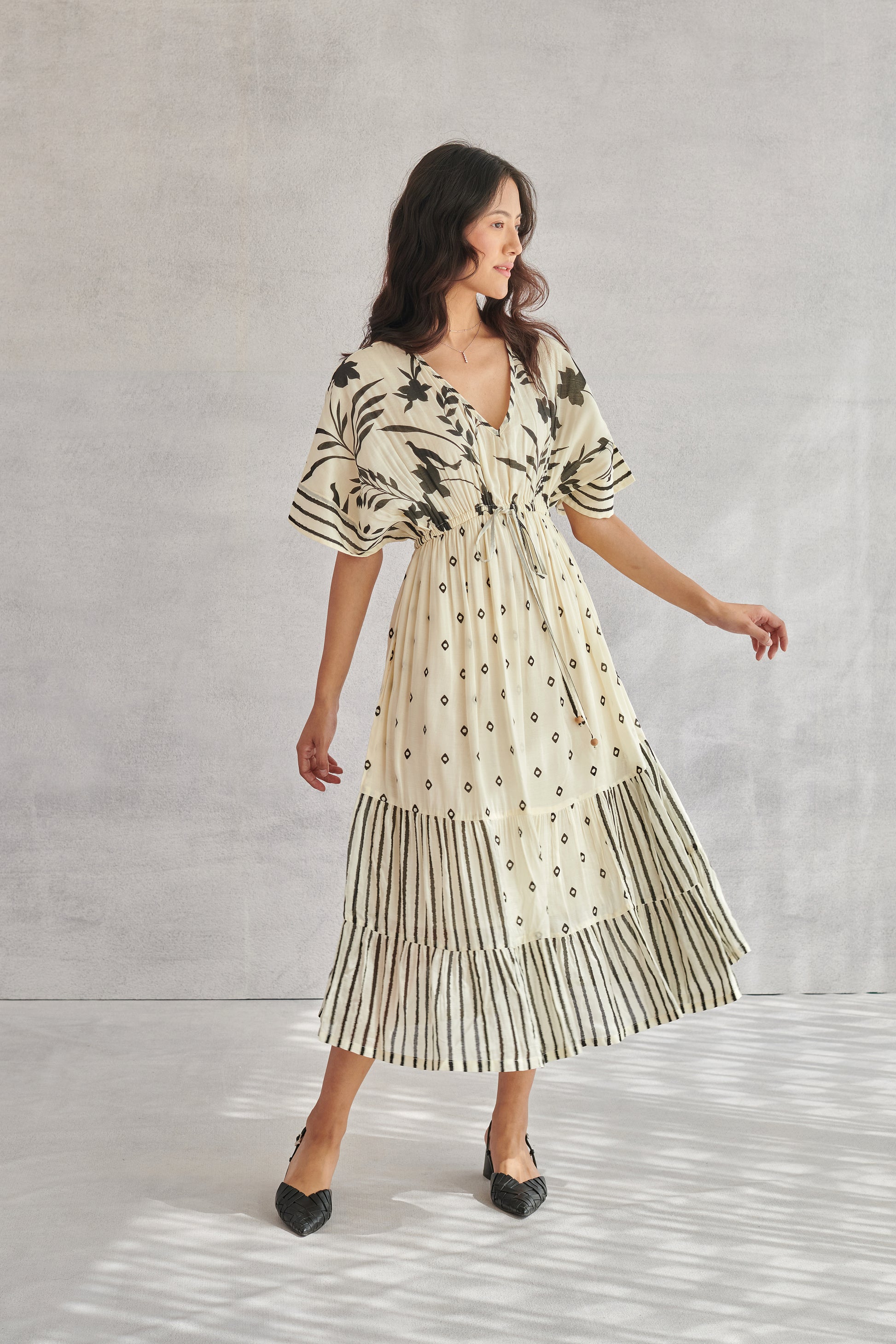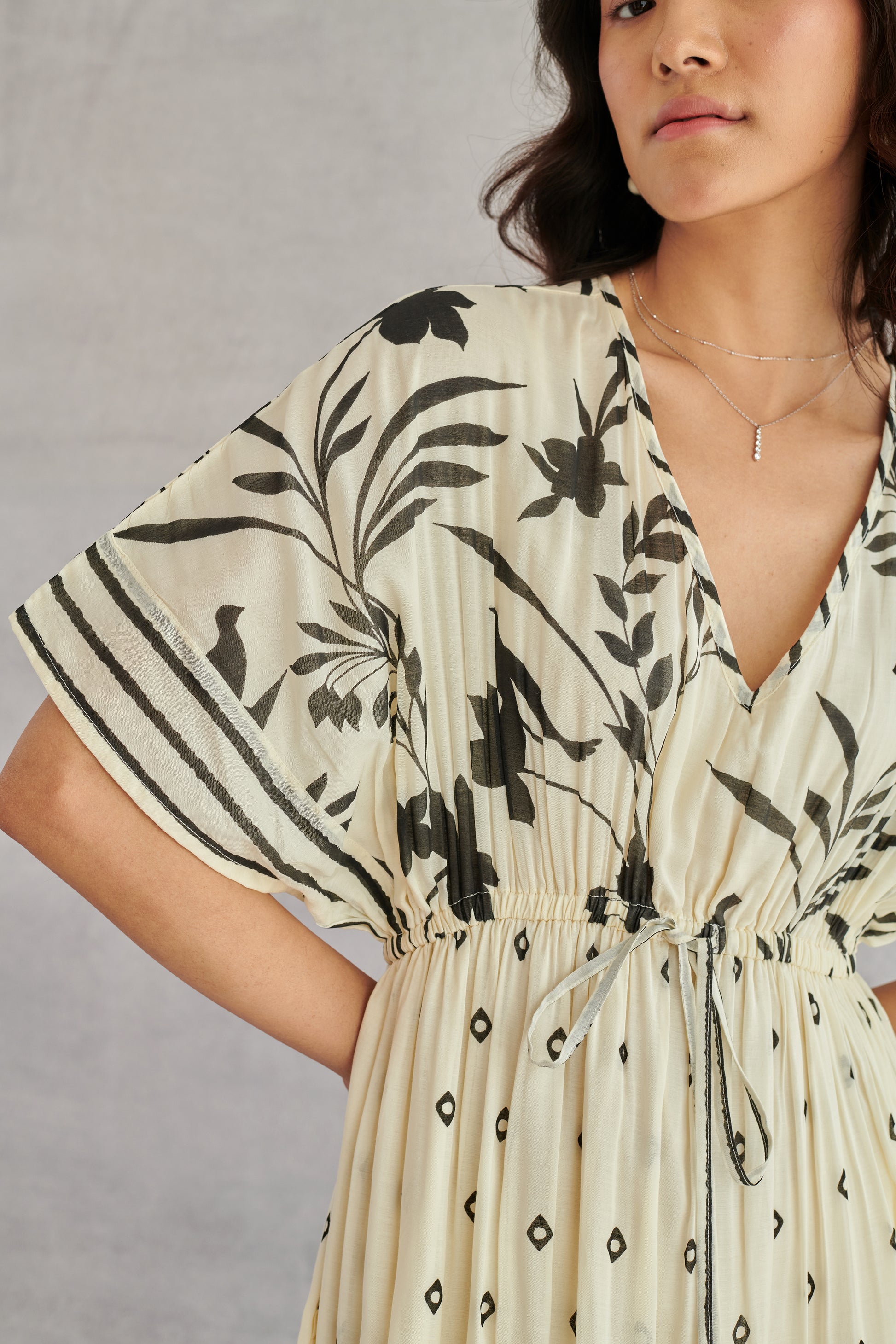 A fluid silhouette with a striking interplay of monochrome geometric and tropical prints, this kaftan dress blends comfort with effortless elegance.