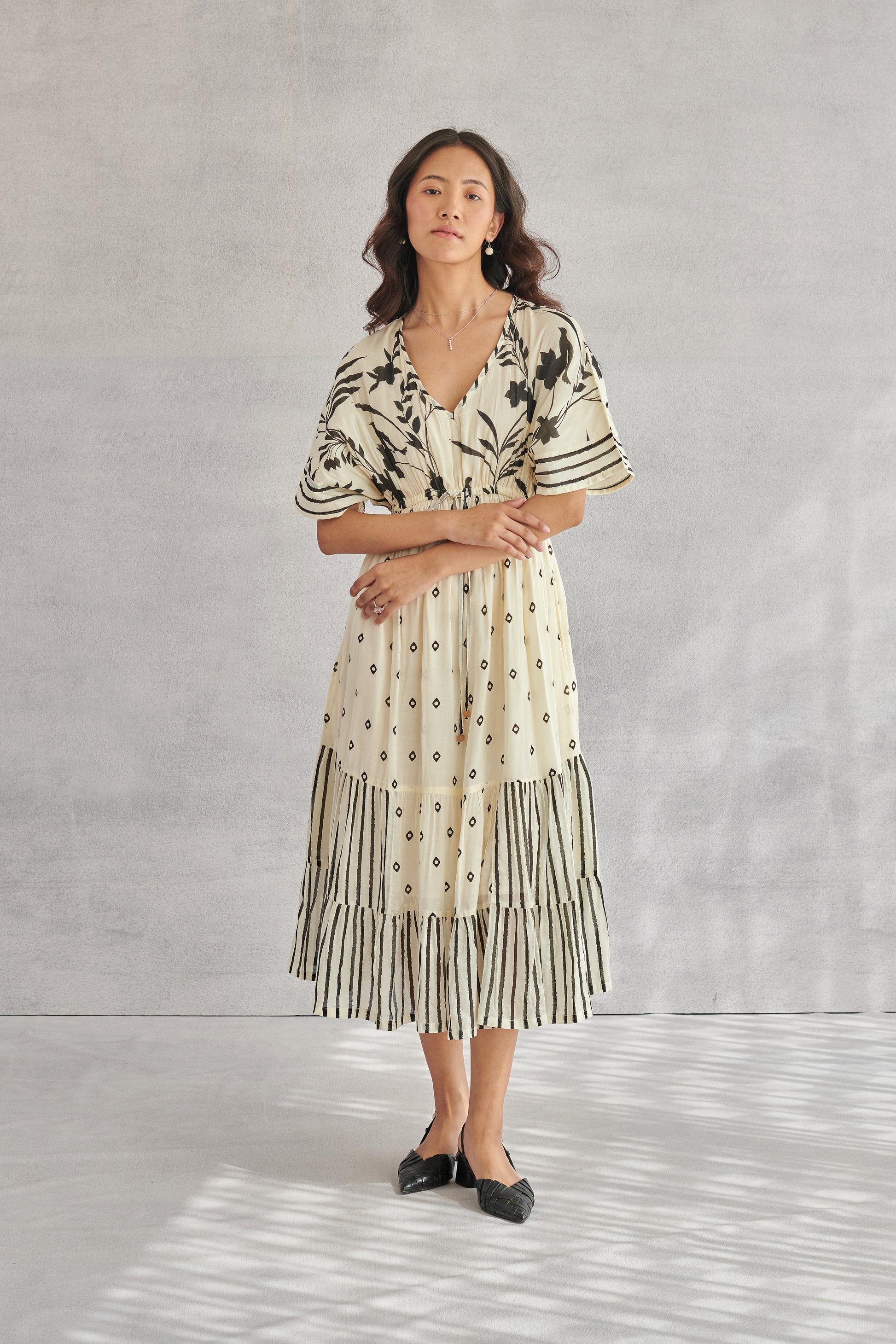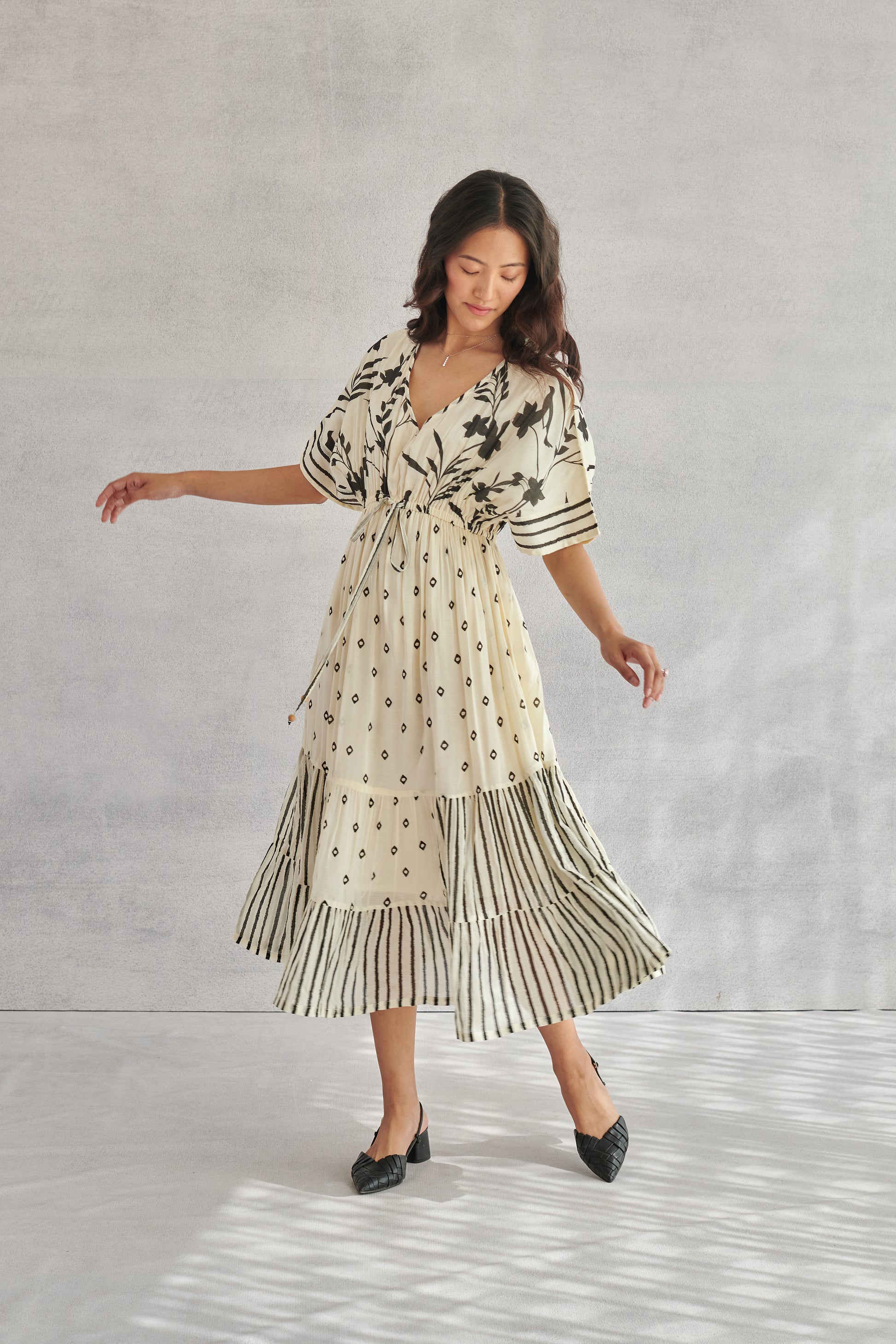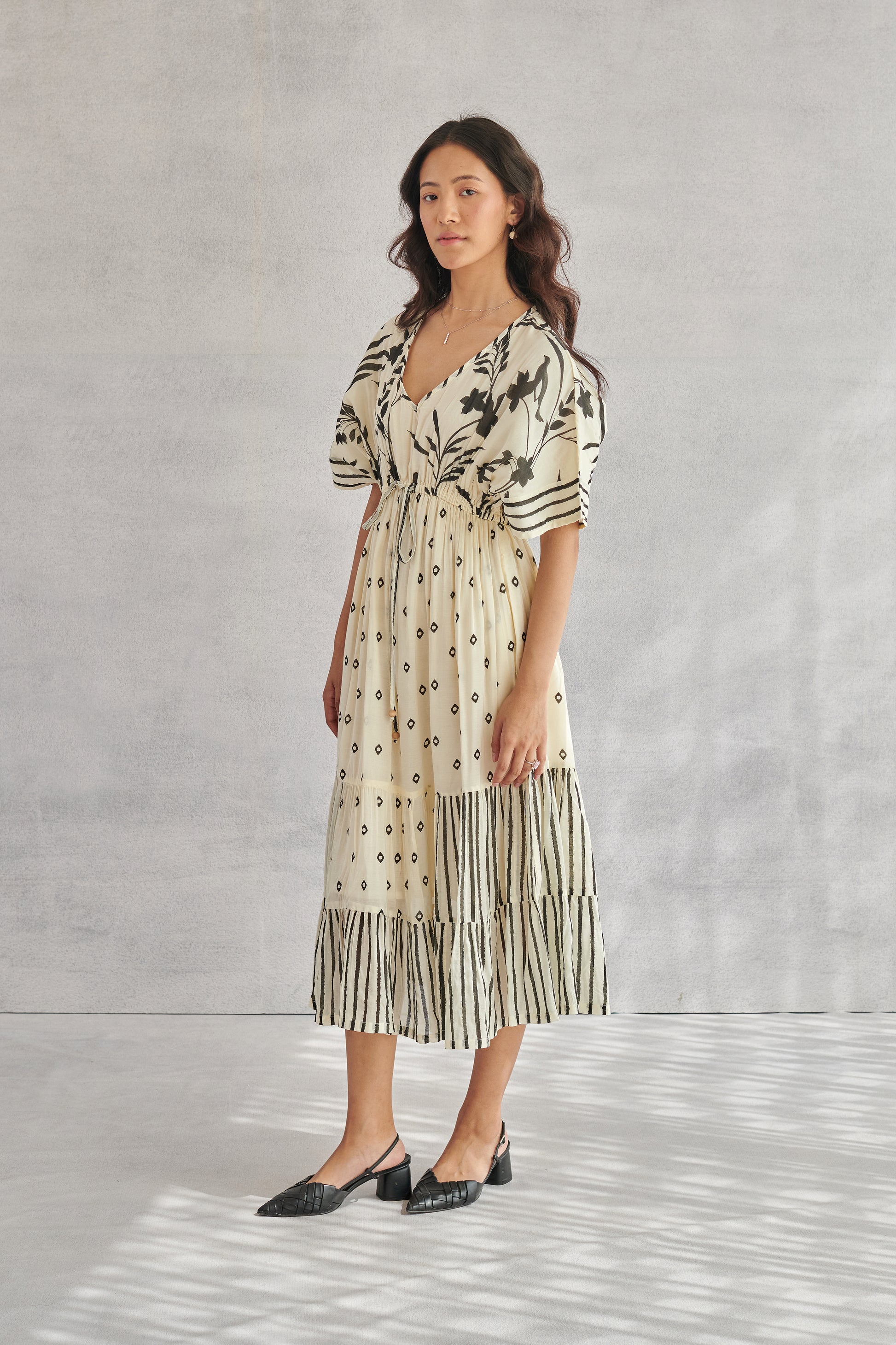 A fluid silhouette with a striking interplay of monochrome geometric and tropical prints, this kaftan dress blends comfort with effortless elegance.