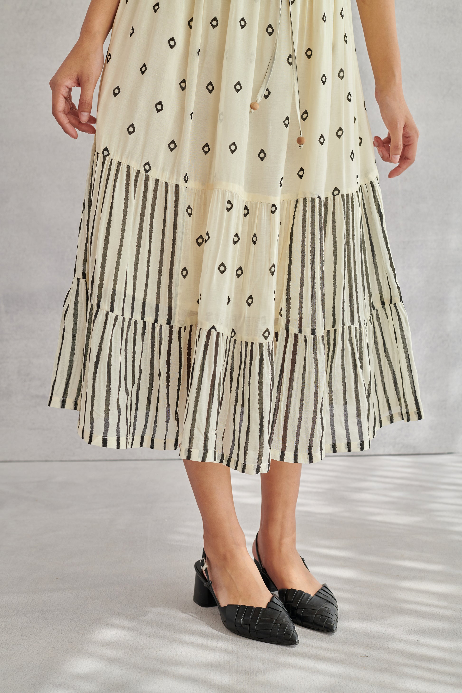 Unique mix of stripes, geometric rhombus, and tropical prints in monochrome
