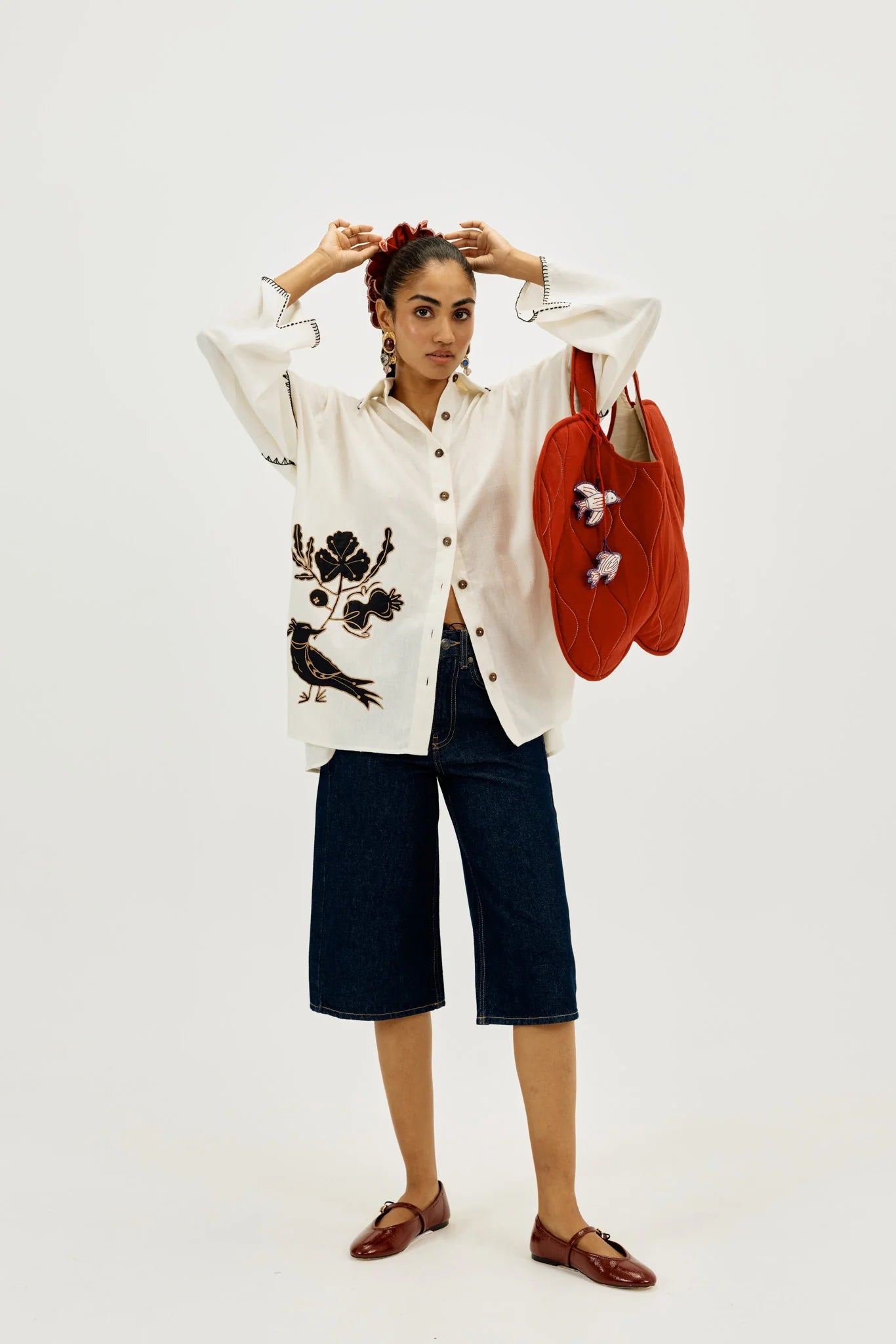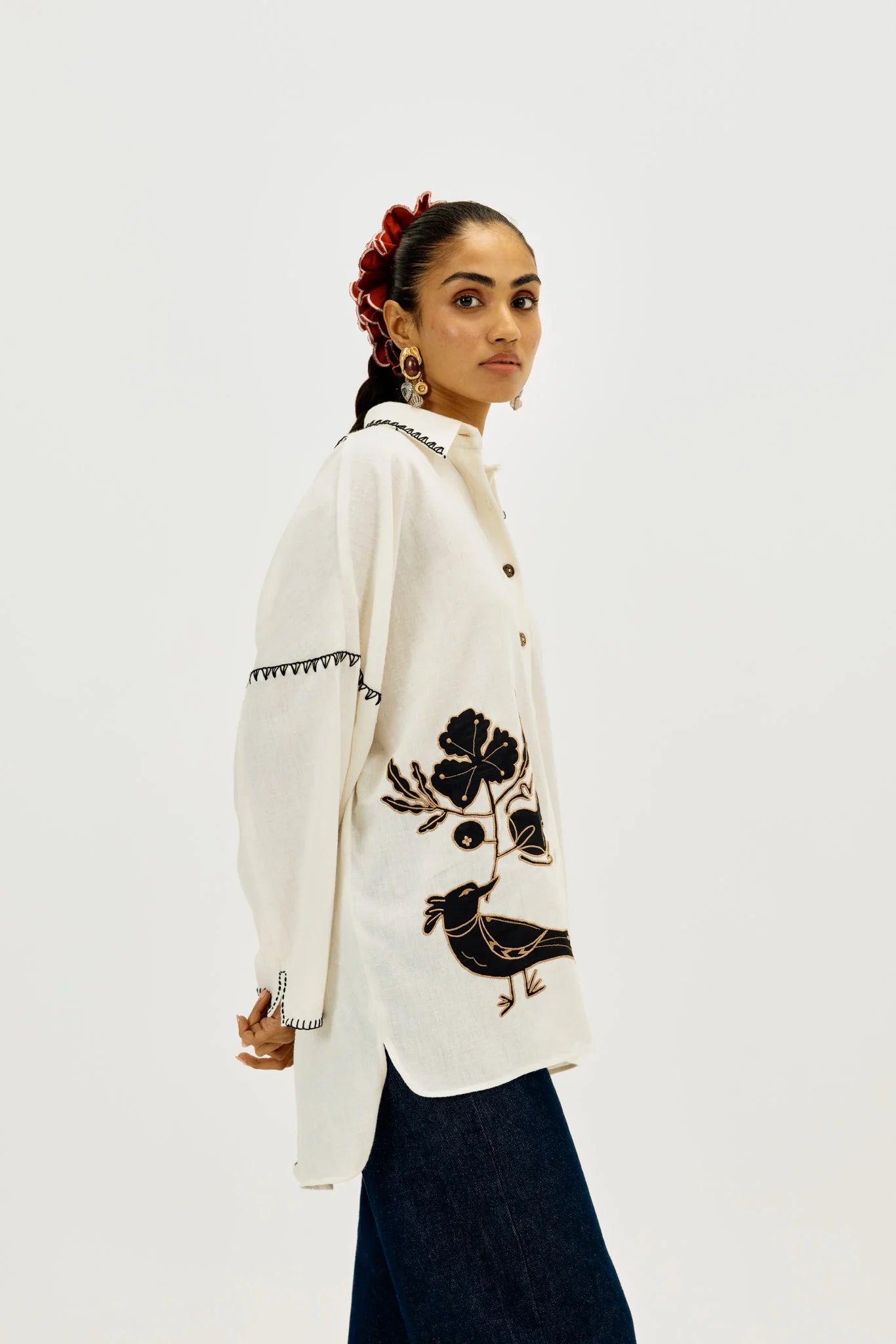 Introducing effortless drama with this oversized shirt, a staple piece with a unique twist. Made from handwoven Kala Cotton, it showcases exquisite appliqué work inspired by traditional folk motifs. The boxy silhouette features dropped shoulders and contrasting thread detailing at the cuffs, sleeves, and back, making it a striking yet easy choice for everyday wear.