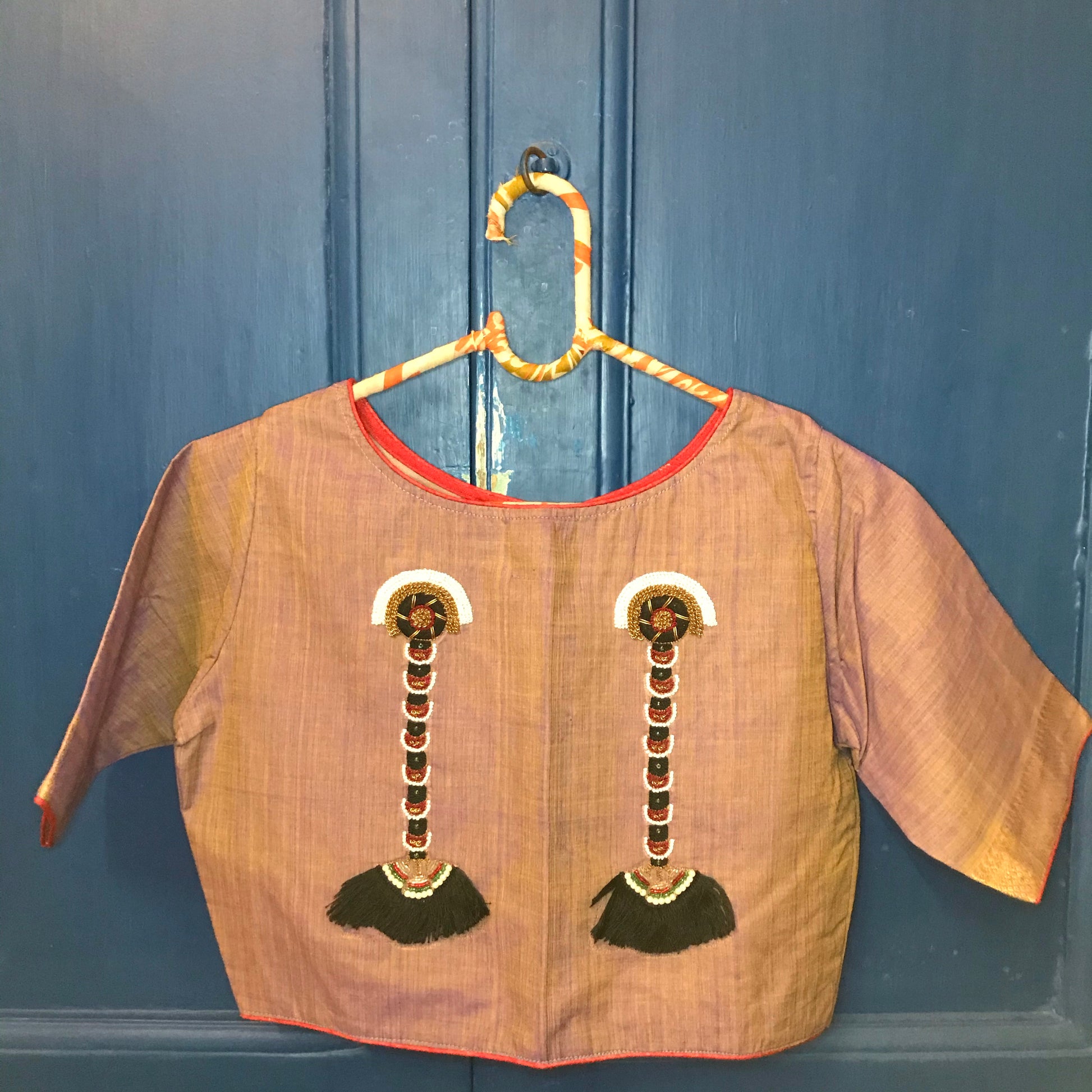 On lavender mangalgiri, Kemp Jewelry worn during tamil weddings, are hand embroidered.