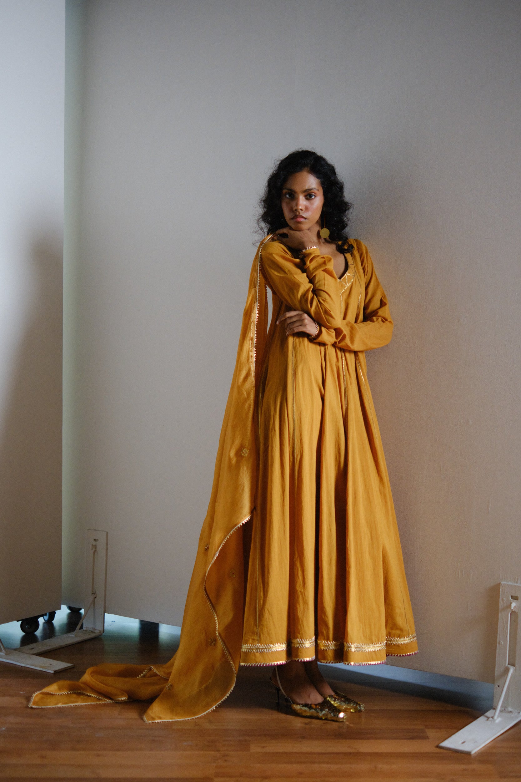 The Kiran gown reflects the glow of sunlight in the rich mustard cotton mul. Detailed with bijiya gota detailing along the neckline, sleeves, and hem, its fluid silhouette carries an understated festive charm. Paired with a kota doria silk dupatta, it transitions effortlessly from elegant daywear to celebratory evenings.
